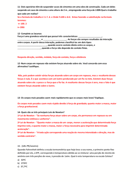 11- operários tem de suspender sacos de cimentos em uma obra de construção. Cada um deles suspende um saco de cimento a uma altura de empregando uma força de 100N Qual trabalho que cada um realiza? Se a formula do trabalho f. d. e Onde f=100 e d=2. Entao fazendo a substituição na formula teremos: 100.2 2001 12- Complete as Força uma grandeza vetorial que possul e As forças sempre resultados da interação entre A partir dessa interação, podemos em tipos: quando ocorre contato direto entre os corpos, e quando a força não depende do contato Resposta direção, sentido, força de contato, força a distância Num corpo em não existem forças atuando sobre Você concorda com essa afirmativa? Justifique. pois podem existir forças atuando sobre um corpo repouso, mas a resultante dessas forças que acontece com um lustre pendurado por um no toto. Existem duas forças atuando sobre peso a força que A resultante dessas forças zero, mas fato que existem forças atuando sobre 0 lustre. corpos mais pesados caem mais rapidamente que os corpos mais leves? Explique. Os corpos mais pesados caem mais pido devido força de quanto maior a massa, maior a força são as Leis de Newton? Lei de Newton nenhuma força atuar sobre um corpo, ele permanece em ou movimento Lei de Newton "Quanto maior a massa de um corpo, menor a aceleração que determinada força imprime nele, quanto maior a massa, maior a força necessária para imprimir determinada Lei de Newton "A toda ação corresponde uma reação de mesma intensidade direção, mas de sentido 15 (UEL PR/Janeiro) Quando Fahrenheit definiu a escala termométrica que hoje leva seu primeiro ponto definido por 0 corresponde a temperatura obtida ao se misturar uma porção de de com porções de neve, a pressão de 1atm. Qual esta temperatura na escala a) b) c)