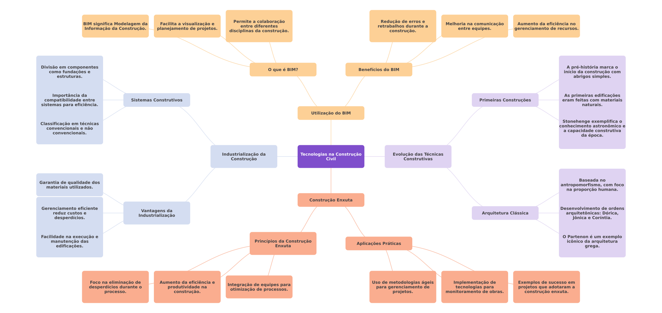 BIM significa Modelagem da Facilita a visualização e Permite a colaboração Redução de erros e Melhoria na comunicação Aumento da eficiência no entre diferentes retrabalhos durante a Informação da Construção. planejamento de projetos. disciplinas da construção. entre equipes. gerenciamento de recursos. construção. Divisão em componentes Benefícios do BIM A pré-história marca como fundações e que é BIM? início da construção com estruturas. abrigos simples. Importância da As primeiras edificações compatibilidade entre Sistemas Construtivos Primeiras Construções eram feitas com materiais sistemas para eficiência. naturais. Utilização do BIM Classificação em técnicas Stonehenge exemplifica conhecimento astronômico e convencionais e não convencionais. a capacidade construtiva da época. Industrialização da Tecnologias na Construção Evolução das Técnicas Construção Civil Construtivas Baseada no Garantia de qualidade dos materiais utilizados. antropomorfismo, com foco na proporção humana. Construção Enxuta Gerenciamento eficiente Desenvolvimento de ordens reduz custos e Vantagens da Industrialização Arquitetura Clássica arquitetônicas: Dórica, desperdícios. Jônica e Coríntia. Facilidade na execução e Partenon é um exemplo manutenção das Princípios da Construção Enxuta Aplicações Práticas icônico da arquitetura edificações. grega. Foco na eliminação de Aumento da eficiência e Integração de equipes para Uso de metodologias ágeis Implementação de Exemplos de sucesso em desperdícios durante produtividade na otimização de processos. para gerenciamento de tecnologias para projetos que adotaram a processo. construção. projetos. monitoramento de obras. construção enxuta.