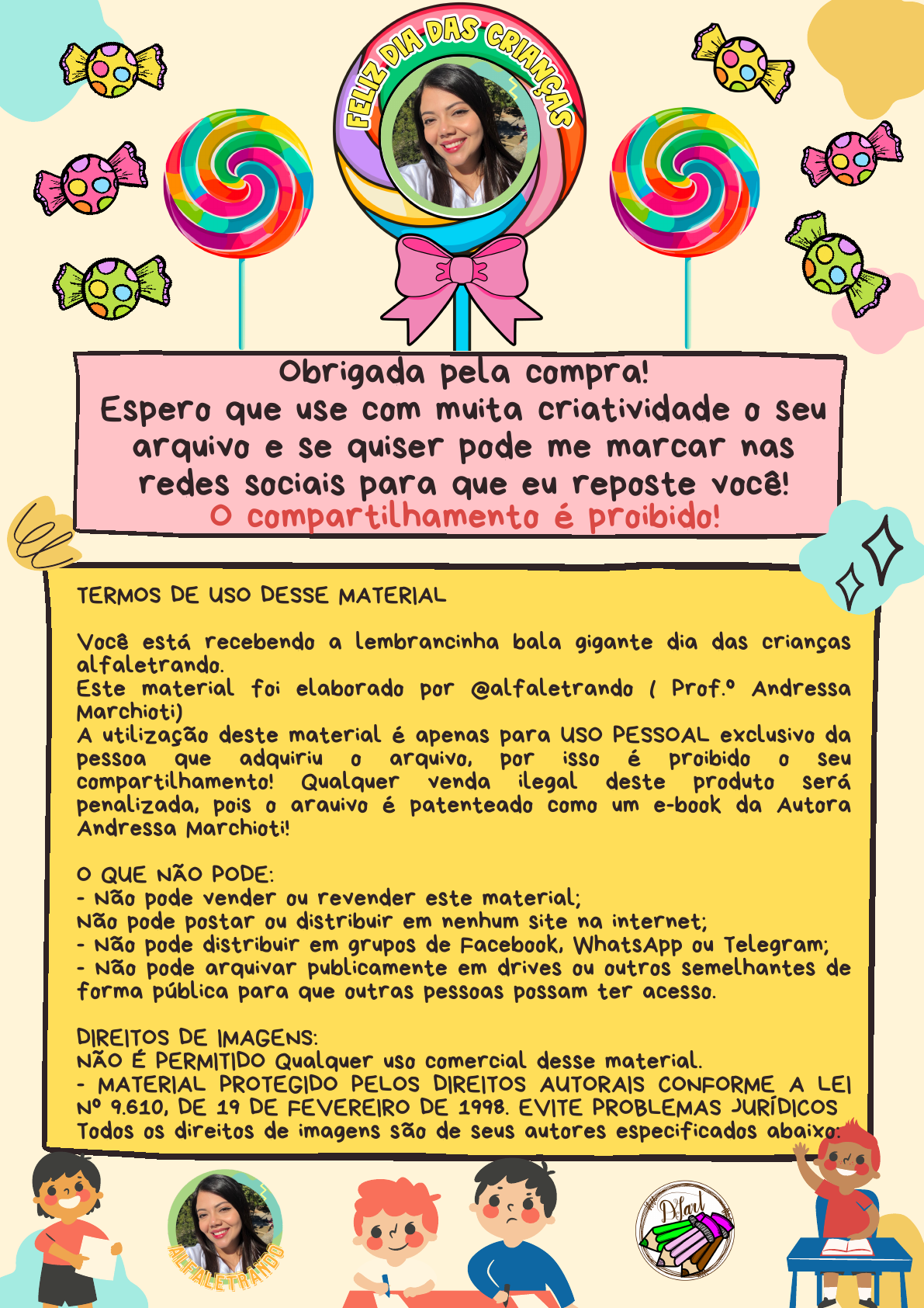 Obrigada pela compra! Espero que use com muita criatividade o seu arquivo e se quiser pode me marcar nas redes sociais para que eu reposte você! O compartilhamento é proibido! TERMOS DE USO DESSE MATERIAL Você está recebendo a lembrancinha bala gigante dia das crianças alfaletrando. Este material foi elaborado por @alfaletrando ( Prof.º Andressa Marchioti) A utilização deste material é apenas para USO PESSOAL exclusivo da pessoa que adquiriu o arquivo, por isso é proibido o seu compartilhamento! Qualquer venda ilegal deste produto será penalizada, pois o arauivo é patenteado como um e-book da Autora Andressa Marchioti! O QUE NÃO PODE: - Não pode vender ou revender este material; Não pode postar ou distribuir em nenhum site na internet; - Não pode distribuir em grupos de Facebook, WhatsApp ou Telegram; - Não pode arquivar publicamente em drives ou outros semelhantes de forma pública para que outras pessoas possam ter acesso. DIREITOS DE IMAGENS: NÃO É PERMITIDO Qualquer uso comercial desse material. - MATERIAL PROTEGIDO PELOS DIREITOS AUTORAIS CONFORME A LEI Nº 9.610, DE 19 DE FEVEREIRO DE 1998. EVITE PROBLEMAS JURÍDICOS Todos os direitos de imagens são de seus autores especificados abaixo: pedagogaanapaula@yahoo.com.br Siga o modelo da foto para montar os seus pirulitos. Para melhor entendimento veja o tutorial no insta @ALFALETRANDO pedagogaanapaula@yahoo.com.br @ALFALETRANDO pedagogaanapaula@yahoo.com.br @ALFALETRANDO pedagogaanapaula@yahoo.com.br @ALFALETRANDO pedagogaanapaula@yahoo.com.br @ALFALETRANDO pedagogaanapaula@yahoo.com.br @ALFALETRANDO pedagogaanapaula@yahoo.com.br @ALFALETRANDO pedagogaanapaula@yahoo.com.br @ALFALETRANDO pedagogaanapaula@yahoo.com.br