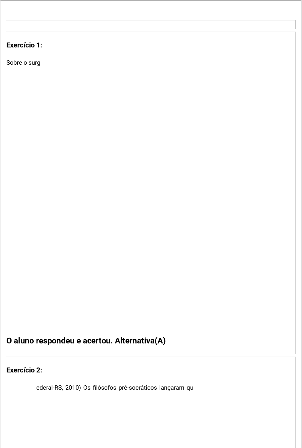Exercício 1: Sobre o surgimento da Filosofia, pode-se afirmar que I foi um processo lento e gradativo que não implicou no desaparecimento das concepções míticas. II foi um processo lento e gradativo que acarretou o completo desaparecimento das concepções míticas. III ocorreu de forma repentina, como consequência de um salto realizado por um povo escolhido e privilegiado. Está correto somente o afirmado em A) I. B) II. C) III. D) I e III. E) II e III. O aluno respondeu e acertou. Alternativa(A) Exercício 2: (Instituto Federal-RS, 2010) Os filósofos pré-socráticos lançaram questões centrais sobre o problema do ser, do conhecer, da origem da natureza e do universo. Parmênides e Heráclito são duas referências importantes nesse início da filosofia ocidental, que ocorreu na Grécia Antiga entre os séculos VII e V a.C. Qual a principal diferença na forma de pensar entre Heráclito e Parmênides? A) Heráclito é dialético e Parmênides é analítico. B) Heráclito é platônico e Parmênides é aristotélico. C) Heráclito diz que os sentidos enganam e Parmênides valoriza os sentidos. D) Heráclito considera que tudo na natureza se transforma, pois todas as coisas estão em constante movimento, desse modo, conhecer é captar a mudança contínua. Já Parmênides considera que conhecer é alcançar o idêntico, o imutável. E) Para Heráclito ninguém consegue se banhar duas vezes no mesmo rio e para Parmênides todos "os banhos" são iguais. O aluno respondeu e acertou. Alternativa(D) Exercício 3: (Prefeitura de Pacatuba – Ceará – Instituto Pró-Município, 2009) Como parte essencial da missão da Filosofia nas escolas, está a tarefa de desenvolver no estudante o senso crítico. Qual o resultado desse processo? A) Pensamento contemplativo sobre o mundo. B) Ampliação da consciência reflexiva. C) Conhecimento das reflexões filosóficas já desenvolvidas na história. D) Desenvolvimento do espírito de contestação. E) Surgimento de uma massa subversiva em relação à ordem constituída. O aluno respondeu e acertou. Alternativa(B) Exercício 4: Leia atentamente o texto a seguir: A palavra filosofia é composta por duas outras: philo e sophia. Philo deriva de philia, que significa amizade, amor fraterno, respeito entre os iguais. Sophia quer dizer sabedoria e dela vem a palavra sophos, sábio. Filosofia significa, portanto, amizade pela sabedoria, amor e respeito pelo saber. Filósofo: o que ama a sabedoria, tem amizade pelo saber, deseja saber (...). CHAUÍ, M. Convite à filosofia. São Paulo: Ática, 1996. p.19. A Filosofia surge na Grécia, por volta do século VI a.C. É considerado o primeiro filósofo: A) Sócrates. B) Platão. C) Tales de Mileto. D) Parmênides de Eléia. E) Homero. O aluno respondeu e acertou. Alternativa(C) Exercício 5: A respeito das diferenças entre cosmogonia e cosmologia, leia atentamente as afirmativas a seguir: I Uma cosmogonia é uma explicação mitológica a respeito da origem das coisas, distinta, portanto, da cosmologia, que pode ser entendida como uma investigação racional a respeito do cosmos (a totalidade das coisas). II A cosmologia é uma forma especial de cosmogonia, ainda baseada em opiniões comuns e mesmo em verdades reveladas, sendo distinta, portanto, das primeiras filosofias que surgiram no período da Grécia antiga, com Sócrates, Platão e Aristóteles. III Uma cosmogonia é uma tentativa racional e sistemática de explicar a existência das coisas que nos cercam e, por esse motivo, se assemelha às primeiras tentativas filosóficas de explicação, as cosmologias. IV Apesar das inúmeras diferenças que separam as duas formas de discurso a respeito da totalidade das coisas, tanto a cosmogonia como a cosmologia possuem algo em comum: buscam explicar a totalidade das coisas (cosmos). Está correto somente o afirmado em A) I. B) II. C) I e IV. D) III. E) III e IV. O aluno respondeu e acertou. Alternativa(C) Exercício 6: Na Filosofia existe um debate sobre a razão de sua origem ter ocorrido na Grécia Antiga, levando a elaboração da tese do “milagre grego”. Em consonância a isso, é correto afirmar que a tese do “milagre grego” sustenta que A) a Grécia é o centro do mundo. B) a Filosofia nasceu na Grécia Antiga, porque os gregos furtavam todas as informações e conhecimentos dos outros povos. C) a Filosofia nasceu na Grécia Antiga como um processo repentino e único, subsidiado pelas qualidades de inteligência e poder de raciocínio dos gregos. D) a Filosofia nasceu na China e não na Grécia Antiga. E) a Filosofia não nasceu na Grécia e não é possível determinar exatamente sua origem, sendo este um erro histórico. O aluno respondeu e acertou. Alternativa(C) Exercício 7: (UEL, 2003, Adaptado) Tales foi o precursor da filosofia da physis, pois foi o primeiro a afirmar a existência de um princípio originário único, causa de todas as coisas que existem, a água. Essa proposta é importantíssima... podendo com boa dose de razão ser qualificada como a primeira proposta filosófica daquilo que se costuma chamar civilização ocidental. REALE, G. História da filosofia: Antiguidade e Idade Média. São Paulo: Paulus, 1990. p. 29. A Filosofia surgiu na Grécia no século VI a.C. e seus primeiros filósofos foram os pré-socráticos. Com base no texto, assinale a alternativa que expressa o principal problema por eles investigado: A) A ética – com o estudo racional sobre o agir humano. B) A estética – com o estudo sobre o belo na arte. C) A epistemologia – com o estudo dos procedimentos científicos. D) A cosmologia – com o estudo da origem e da ordem do mundo. E) A filosofia política – com a análise do Estado e sua legislação. O aluno respondeu e acertou. Alternativa(D) Exercício 8: Na história da Filosofia atribui-se grande importância à passagem da consciência mítica para o pensamento racional e filosófico. Por se tratar de um processo de transição, esta pass