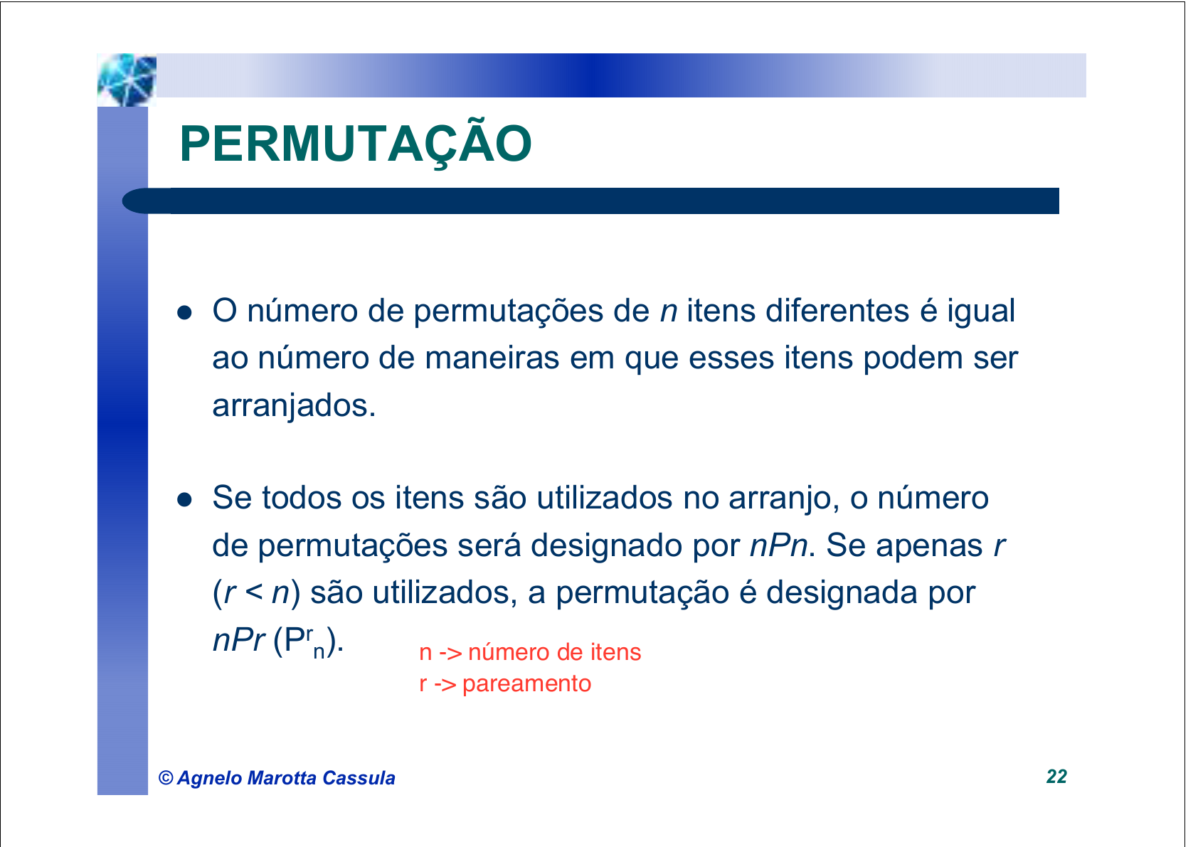 © Agnelo Marotta Cassula 21 PERMUTAÇÃO & COMBINAÇÃO ! Se o número de elementos dos conjuntos de eventos for muito grande o processo de enumeração de estado será tedioso e sujeito a erro. ! A probabilidade de ocorrência de um evento pode ser mais facilmente tratada em alguns problemas usando o conceito de Permutação e/ou Combinação. © Agnelo Marotta Cassula 22 ! O número de permutações de n itens diferentes é igual ao número de maneiras em que esses itens podem ser arranjados. ! Se todos os itens são utilizados no arranjo, o número de permutações será designado por nPn. Se apenas r (r número de itens r -> pareamento © Agnelo Marotta Cassula 21 PERMUTAÇÃO & COMBINAÇÃO ! Se o número de elementos dos conjuntos de eventos for muito grande o processo de enumeração de estado será tedioso e sujeito a erro. ! A probabilidade de ocorrência de um evento pode ser mais facilmente tratada em alguns problemas usando o conceito de Permutação e/ou Combinação. © Agnelo Marotta Cassula 22 ! O número de permutações de n itens diferentes é igual ao número de maneiras em que esses itens podem ser arranjados. ! Se todos os itens são utilizados no arranjo, o número de permutações será designado por nPn. Se apenas r (r número de itens r -> pareamento © Agnelo Marotta Cassula 21 PERMUTAÇÃO & COMBINAÇÃO ! Se o número de elementos dos conjuntos de eventos for muito grande o processo de enumeração de estado será tedioso e sujeito a erro. ! A probabilidade de ocorrência de um evento pode ser mais facilmente tratada em alguns problemas usando o conceito de Permutação e/ou Combinação. © Agnelo Marotta Cassula 22 ! O número de permutações de n itens diferentes é igual ao número de maneiras em que esses itens podem ser arranjados. ! Se todos os itens são utilizados no arranjo, o número de permutações será designado por nPn. Se apenas r (r número de itens r -> pareamento © Agnelo Marotta Cassula 25 PERMUTAÇÃO Consequentemente P3 7: )!rn( !n P n r − = De um modo geral o número de permutações de n itens tomados r de cada vez (nPr) é igual a: 2105x6x7 )!37( !7 P )!rn( !n P 7 3 n r == − == − = © Agnelo Marotta Cassula 26 De maneira geral a fórmula para determinar o número de permutações é aplicada quando as três regras a seguir são satisfeitas: – Todos os itens são diferentes; – Nenhuma restrição é imposta a posição em que um item pode ocupar; – Nenhum item pode ser usado mais de uma vez. PERMUTAÇÃO © Agnelo Marotta Cassula 27 EX. ! O número de permutações de três livros diferentes, A, B e C, tomados três a três é 6: ABC, ACB, BAC, BCA, CAB, CBA Porém, estas 6 permutações equivalem a uma única combinação, pois são sempre os mesmos 3 livros que estão sendo selecionados, não importando a ordem com que eles são arranjados. COMBINAÇÃO ! Para r elementos tem-se r! maneiras de arranjá-los e todas essas maneiras geram uma única combinação. © Agnelo Marotta Cassula 28 COMBINAÇÃO ! Por isso conclui-se que o número de combinações de n elementos tomados r de cada vez é r! vezes menor que a permutação de n elementos tomados r de cada vez. Cr n x r! = Pr n ou !r)!rn( !n !r P C n r n r ×− == © Agnelo Marotta Cassula 25 PERMUTAÇÃO Consequentemente P3 7: )!rn( !n P n r − = De um modo geral o número de permutações de n itens tomados r de cada vez (nPr) é igual a: 2105x6x7 )!37( !7 P )!rn( !n P 7 3 n r == − == − = © Agnelo Marotta Cassula 26 De maneira geral a fórmula para determinar o número de permutações é aplicada quando as três regras a seguir são satisfeitas: – Todos os itens são diferentes; – Nenhuma restrição é imposta a posição em que um item pode ocupar; – Nenhum item pode ser usado mais de uma vez. PERMUTAÇÃO © Agnelo Marotta Cassula 27 EX. ! O número de permutações de três livros diferentes, A, B e C, tomados três a três é 6: ABC, ACB, BAC, BCA, CAB, CBA Porém, estas 6 permutações equivalem a uma única combinação, pois são sempre os mesmos 3 livros que estão sendo selecionados, não importando a ordem com que eles são arranjados. COMBINAÇÃO ! Para r elementos tem-se r! maneiras de arranjá-los e todas essas maneiras geram uma única combinação. © Agnelo Marotta Cassula 28 COMBINAÇÃO ! Por isso conclui-se que o número de combinações de n elementos tomados r de cada vez é r! vezes menor que a permutação de n elementos tomados r de cada vez. Cr n x r! = Pr n ou !r)!rn( !n !r P C n r n r ×− == © Agnelo Marotta Cassula 25 PERMUTAÇÃO Consequentemente P3 7: )!rn( !n P n r − = De um modo geral o número de permutações de n itens tomados r de cada vez (nPr) é igual a: 2105x6x7 )!37( !7 P )!rn( !n P 7 3 n r == − == − = © Agnelo Marotta Cassula 26 De maneira geral a fórmula para determinar o número de permutações é aplicada quando as três regras a seguir são satisfeitas: – Todos os itens são diferentes; – Nenhuma restrição é imposta a posição em que um item pode ocupar; – Nenhum item pode ser usado mais de uma vez. PERMUTAÇÃO © Agnelo Marotta Cassula 27 EX. ! O número de permutações de três livros diferentes, A, B e C, tomados três a três é 6: ABC, ACB, BAC, BCA, CAB, CBA Porém, estas 6 permutações equivalem a uma única combinação, pois são sempre os mesmos 3 livros que estão sendo selecionados,não importando a ordem com que eles são arranjados. COMBINAÇÃO ! Para r elementos tem-se r! maneiras de arranjá-los e todas essas maneiras geram uma única combinação. © Agnelo Marotta Cassula 28 COMBINAÇÃO ! Por isso conclui-se que o número de combinações de n elementos tomados r de cada vez é r! vezes menor que a permutação de n elementos tomados r de cada vez. Cr n x r! = Pr n ou !r)!rn( !n !r P C n r n r ×− == © Agnelo Marotta Cassula 25 PERMUTAÇÃO Consequentemente P3 7: )!rn( !n P n r − = De um modo geral o número de permutações de n itens tomados r de cada v
