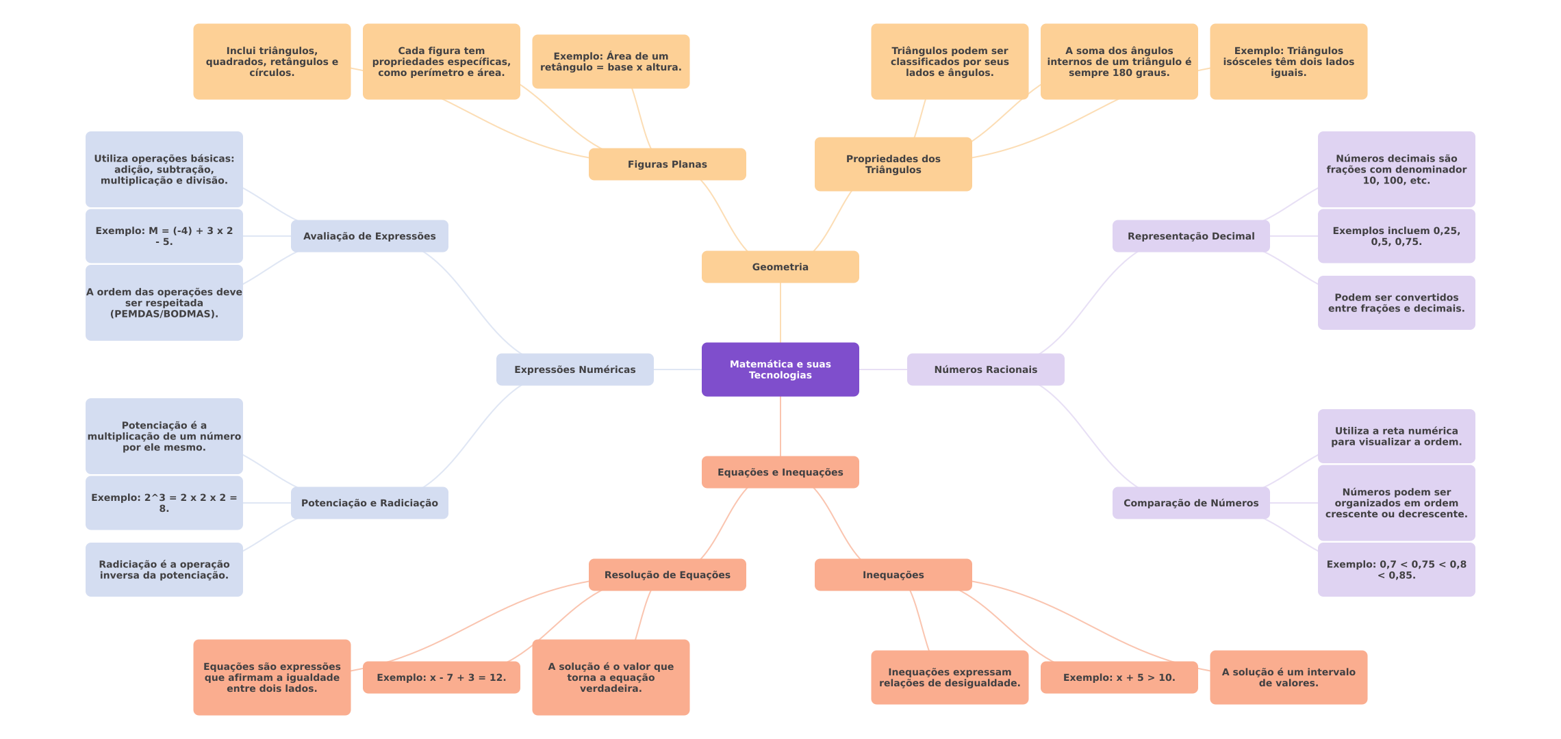 Inclui triângulos, Cada figura tem Exemplo: Área de um Triângulos podem ser A soma dos ângulos Exemplo: Triângulos quadrados, retângulos e propriedades específicas, retângulo = base altura. classificados por seus internos de um triângulo é isósceles têm dois lados círculos. como perímetro e área. lados e ângulos. sempre 180 graus. iguais. Utiliza operações básicas: Propriedades dos Números decimais são adição, subtração, Figuras Planas Triângulos frações com denominador multiplicação e divisão. 10, 100, etc. Exemplo: = (-4) + 3 2 5. Avaliação de Expressões Representação Decimal Exemplos incluem 0,25, 0,5, 0,75. Geometria A ordem das operações deve Podem ser convertidos ser respeitada (PEMDAS/BODMAS). entre frações e decimais. Matemática e suas Expressões Numéricas Números Racionais Tecnologias Potenciação é a Utiliza a reta numérica multiplicação de um número por ele mesmo. para visualizar a ordem. Equações e Inequações Exemplo: 2^3 Números podem ser 8. Potenciação e Radiciação Comparação de Números organizados em ordem crescente ou decrescente. Radiciação é a operação Exemplo: 0,7