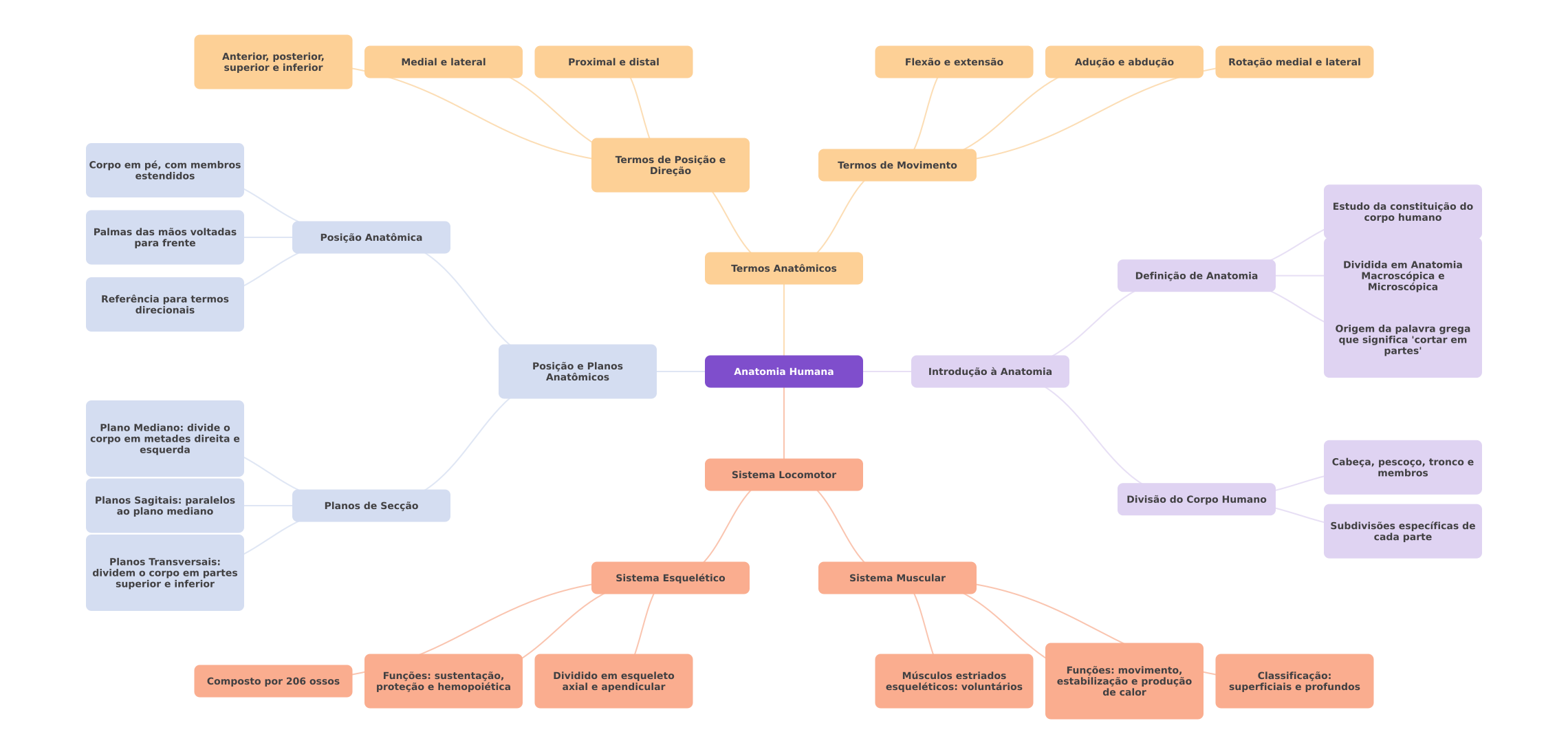 Anterior, posterior, Medial e lateral Proximal e distal Flexão e extensão Adução e abdução Rotação medial e lateral superior e inferior Corpo em pé, com membros Termos de Posição e Termos de Movimento estendidos Direção Estudo da constituição do corpo humano Palmas das mãos voltadas para frente Posição Anatômica Termos Anatômicos Dividida em Anatomia Definição de Anatomia Macroscópica e Microscópica Referência para termos direcionais Origem da palavra grega que significa 'cortar em partes' Posição e Planos Anatomia Humana Anatômicos Introdução à Anatomia Plano Mediano: divide corpo em metades direita e esquerda Cabeça, pescoço, tronco e Sistema Locomotor membros Planos Sagitais: paralelos Divisão do Corpo Humano ao plano mediano Planos de Secção Subdivisões específicas de cada parte Planos Transversais: dividem corpo em partes Sistema Esquelético Sistema Muscular superior e inferior Composto por 206 ossos Funções: sustentação, Dividido em esqueleto Músculos estriados Funções: movimento, Classificação: proteção e hemopoiética axial e apendicular esqueléticos: voluntários estabilização e produção de calor superficiais e profundos