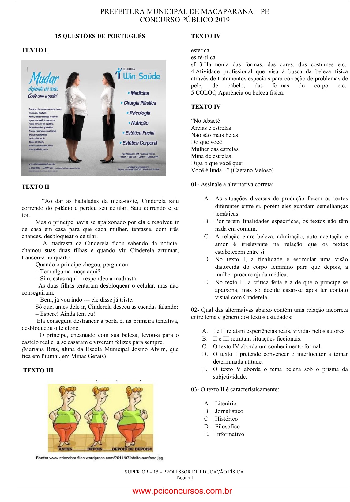 pcimarkpci MDAwMDowMDAwOjAwMDA6MDAwMDowMDAwOmZmZmY6YjM1Mjo2YjU0:VHVlLCAxNiBTZXAgMjAyNSAxMTo1NzozNCAtMDMwMA== www.pciconcursos.com.br PREFEITURA MUNICIPAL DE MACAPARANA – PE CONCURSO PÚBLICO 2019 SUPERIOR – 15 – PROFESSOR DE EDUCAÇÃO FÍSICA. Página 1 15 QUESTÕES DE PORTUGUÊS TEXTO I TEXTO II “Ao dar as badaladas da meia-noite, Cinderela saiu correndo do palácio e perdeu seu celular. Saiu correndo e se foi. Mas o príncipe havia se apaixonado por ela e resolveu ir de casa em casa para que cada mulher, tentasse, com três chances, desbloquear o celular. www.pciconcursos.com.br A madrasta da Cinderela ficou sabendo da notícia, chamou suas duas filhas e quando viu Cinderela arrumar, trancou-a no quarto. Quando o príncipe chegou, perguntou: – Tem alguma moça aqui? – Sim, estas aqui – respondeu a madrasta. As duas filhas tentaram desbloquear o celular, mas não conseguiram. – Bem, já vou indo --- ele disse já triste. Só que, antes dele ir, Cinderela desceu as escadas falando: – Espere! Ainda tem eu! Ela conseguiu destrancar a porta e, na primeira tentativa, desbloqueou o telefone. O príncipe, encantado com sua beleza, levou-a para o castelo real e lá se casaram e viveram felizes para sempre. (Mariana Brás, aluna da Escola Municipal Josino Alvim, que fica em Piumhi, em Minas Gerais) TEXTO III TEXTO IV estética es·té·ti·ca sf 3 Harmonia das formas, das cores, dos costumes etc. 4 Atividade profissional que visa à busca da beleza física através de tratamentos especiais para correção de problemas de pele, de cabelo, das formas do corpo etc. 5 COLOQ Aparência ou beleza física. TEXTO IV “No Abaeté Areias e estrelas Não são mais belas Do que você Mulher das estrelas Mina de estrelas Diga o que você quer Você é linda...” (Caetano Veloso) 01- Assinale a alternativa correta: A. As situações diversas de produção fazem os textos diferentes entre si, porém eles guardam semelhanças temáticas. B. Por terem finalidades específicas, os textos não têm nada em comum. C. A relação entre beleza, admiração, auto aceitação e amor é irrelevante na relação que os textos estabelecem entre si. D. No texto I, a finalidade é estimular uma visão distorcida do corpo feminino para que depois, a mulher procure ajuda médica. E. No texto II, a crítica feita é a de que o príncipe se apaixona, mas só decide casar-se após ter contato visual com Cinderela. 02- Qual das alternativas abaixo contém uma relação incorreta entre tema e gênero dos textos estudados: A. I e II relatam experiências reais, vividas pelos autores. B. II e III retratam situações ficcionais. C. O texto IV aborda um conhecimento formal. D. O texto I pretende convencer o interlocutor a tomar determinada atitude. E. O texto V aborda o tema beleza sob o prisma da subjetividade. 03- O texto II é caracteristicamente: A. Literário B. Jornalístico C. Histórico D. Filosófico E. Informativo pcimarkpci MDAwMDowMDAwOjAwMDA6MDAwMDowMDAwOmZmZmY6YjM1Mjo2YjU0:VHVlLCAxNiBTZXAgMjAyNSAxMTo1NzozNCAtMDMwMA== www.pciconcursos.com.br PREFEITURA MUNICIPAL DE MACAPARANA – PE CONCURSO PÚBLICO 2019 SUPERIOR – 15 – PROFESSOR DE EDUCAÇÃO FÍSICA. Página 2 04- O texto III apresenta as seguintes características: A. Informativo e prolixo B. Expositivo e coloquial C. Irreverente e coloquial www.pciconcursos.com.br D. Prolixo e conciso E. Opinativo e expositivo 05- Em qual das alternativas está o texto e a função da linguagem predominante nele: A. Texto I – função metalinguística B. Texto II – função poética C. Texto III – função referencial D. Texto IV – função fática E. Texto V – função conativa 19 de julho de 1955 – [...] Quando as mulheres feras invade o meu barraco, os meus filhos lhes joga pedras. Elas diz: – Que crianças mal iducadas! Eu digo: – Os meus filhos estão defendendo-me. Vou escrever um livro referente a favela. Hei de citar tudo que aqui se passa. E tudo que vocês me fazem. Eu quero escrever o livro, e vocês com estas cenas desagradaveis me fornece os argumentos. 21 de julho – ...Estou residindo na favela. Mas se Deus me ajudar hei de mudar daqui. Espero que os políticos estingue as favelas. [...]. 22 de julho Que suplicio catar papel atualmente! Tenho que levar a minha filha Vera Eunice. Eu ponho o saco na cabeça e levo-a nos braços. Tem hora que revolto-me. Depois domino-me. Ela não tem culpa de estar no mundo. 13 de maio de 1958 – É um dia simpatico para mim. É o dia da Abolição. Dia que comemoramos a libertação dos escravos. A Vera começou pedir comida. E eu não tinha. Fui pedir um pouco de banha a Dona Alice. Ela logo deu-me a banha e arroz. Era 9 horas da noite quando comemos. E assim no dia 13 de maio de 1958 eu lutava contra a escravatura atual– a fome! (Quarto de despejo – diário de uma favelada. São Paulo: Francisco Alves, 1960. ______._____. São Paulo: Ática, 2001) 06- Pode -se inferir do texto que: A. É provável que os diários tenham sido ditados por alguém mais instruído, porém devido à precária educação, a autora comete vários deslizes no que se refere às normas gramaticais. B. O desprezo social e cultural pelos seus pares na favela, impede que a escrita literária se faça presente no texto. C. Ao criticar o poder público na figura dos políticos, a autora demonstra desconhecer os entraves sociais que fazem com que as pessoas se mantenham na favela, embora ela deseje sair de lá. D. Na reflexão sobre o dia da Libertação dos escravos, a autora não compreende que a opção dos libertos foi concentrar-se nas favelas, o mais distante possível das fazendas de café e que a fome foi a melhor opção para aqueles que tornaram-se livres das surras dos antigos senhores. E. A autora nutre um sentimento de repúdio ao ambiente da favela, pela precariedade da vida ali e um estranhamento constante diante da miséria do lugar. 07- Ao revelar que escreverá um livro, a autora do diário: A. Impõe-