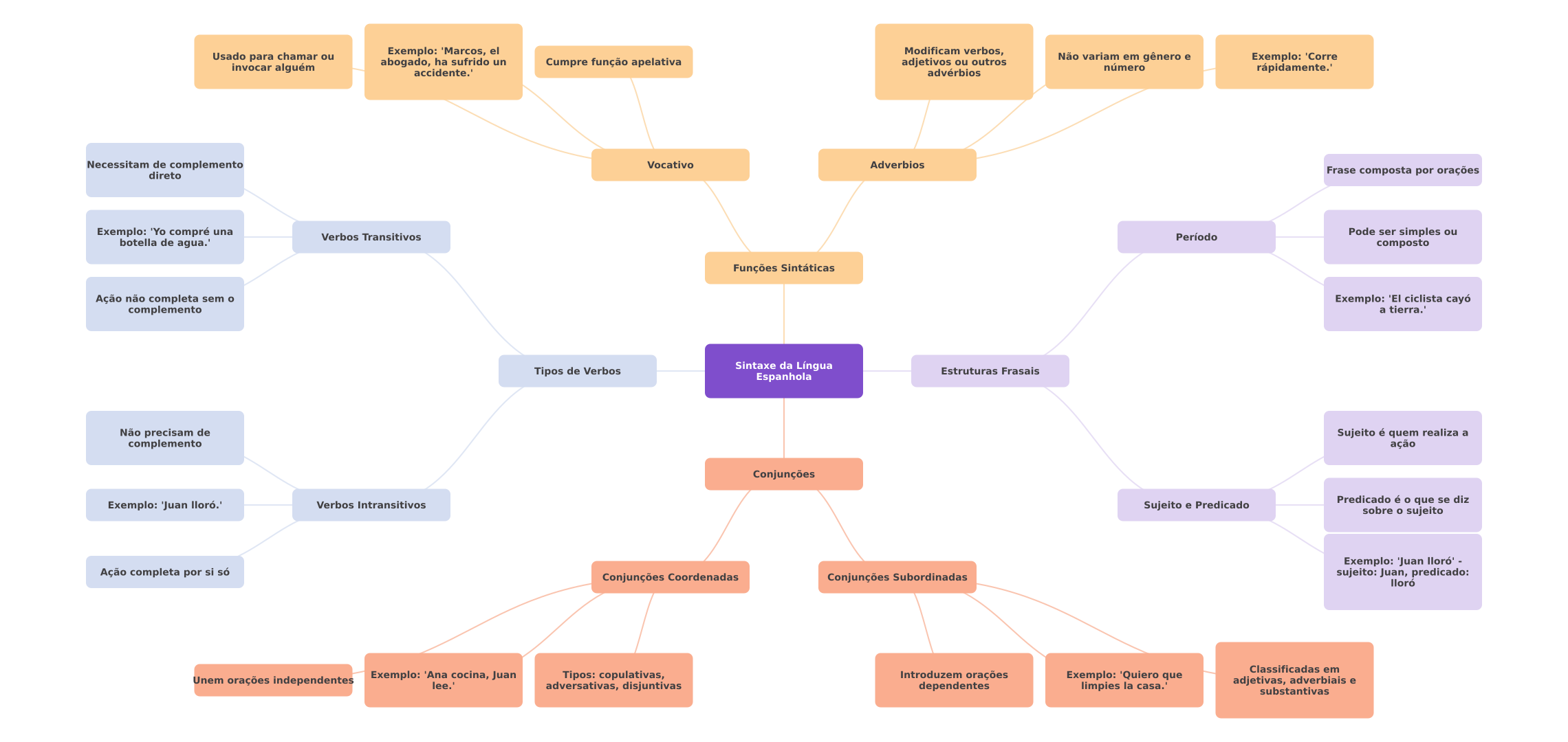 Exemplo: 'Marcos, el Modificam verbos, Usado para chamar ou abogado, ha sufrido un Cumpre função apelativa adjetivos ou outros Não variam em gênero e Exemplo: 'Corre invocar alguém número accidente. advérbios rápidamente.' Necessitam de complemento Vocativo Adverbios direto Frase composta por orações Exemplo: 'Yo compré una Verbos Transitivos Período Pode ser simples ou botella de agua.' composto Funções Sintáticas Ação não completa sem Exemplo: 'El ciclista cayó complemento a Tipos de Verbos Sintaxe da Língua Estruturas Frasais Espanhola Não precisam de Sujeito é quem realiza a complemento ação Conjunções Exemplo: 'Juan Verbos Intransitivos Sujeito e Predicado Predicado é que se diz sobre sujeito Exemplo: 'Juan lloró' - Ação completa por si só Conjunções Coordenadas Conjunções Subordinadas sujeito: Juan, predicado: lloró Classificadas em Exemplo: 'Ana cocina, Juan Tipos: copulativas, Introduzem orações Unem orações independentes Exemplo: Quiero que adversativas, disjuntivas adjetivas, adverbiais e dependentes limpies la substantivas