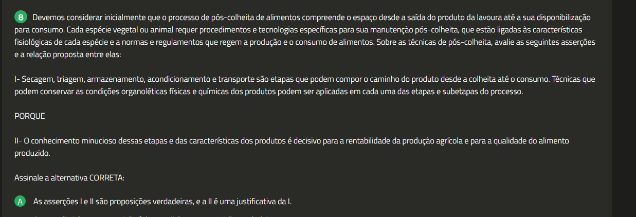 8 Devemos considerar inicialmente que 0 processo de pós-colheita de alimentos compreende 0 espaço desde a saída do produto da lavoura até a sua disponibilização para consumo. Cada espécie vegetal ou animal requer procedimentos e tecnologias específicas para sua manutenção pós-colheita, que estão ligadas às características fisiológicas de cada espécie e a normas e regulamentos que regem a produção e 0 consumo de alimentos. Sobre as técnicas de pós-colheita, avalie as seguintes asserções e a relação proposta entre elas: I- Secagem, triagem, armazenamento, acondicionamento e transporte são etapas que podem compor 0 caminho do produto desde a colheita até 0 consumo. Técnicas que podem conservar as condições organoléticas físicas e químicas dos produtos podem ser aplicadas em cada uma das etapas e subetapas do processo. PORQUE II- 0 conhecimento minucioso dessas etapas e das características dos produtos é decisivo para a rentabilidade da produção agrícola e para a qualidade do alimento produzido. Assinale a alternativa CORRETA: A As asserções le são proposições verdadeiras, e a é uma justificativa da I.