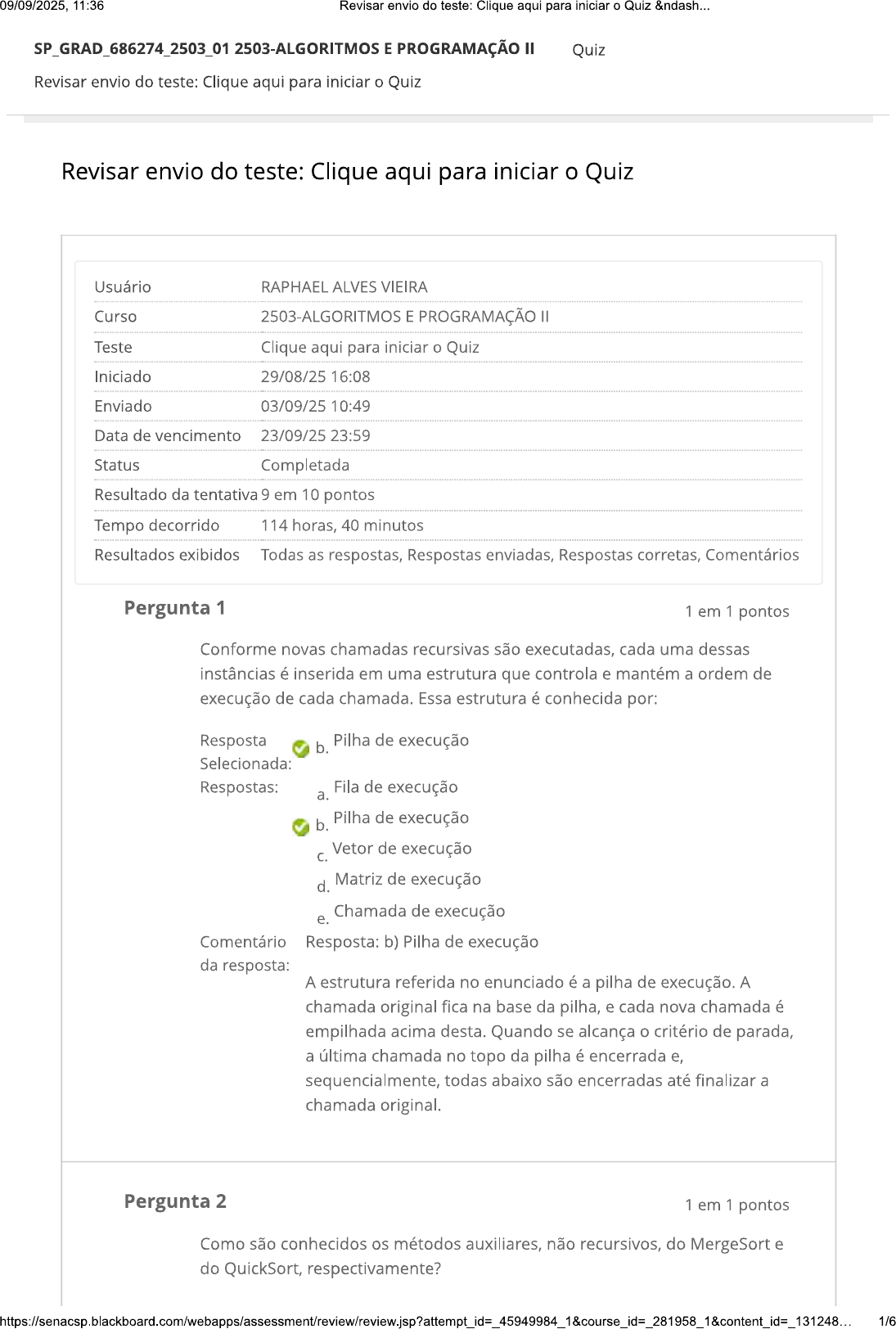 09/09/2025, 11:36 Revisar envio do teste: Clique aqui para iniciar Quiz &ndash... SP_GRAD_686274_2503_01 2503-ALGORITMOS E PROGRAMAÇÃO II Quiz Revisar envio do teste: Clique aqui para iniciar Quiz Revisar envio do teste: Clique aqui para iniciar Quiz Usuário RAPHAEL ALVES VIEIRA Curso 2503-ALGORITMOS E PROGRAMAÇÃO Teste Clique aqui para iniciar o Quiz Iniciado 29/08/25 16:08 Enviado 03/09/25 10:49 Data de vencimento 23/09/25 23:59 Status Completada Resultado da tentativa 9 em 10 pontos Tempo decorrido 114 horas, 40 minutos Resultados exibidos Todas as respostas, Respostas enviadas, Respostas corretas, Comentários Pergunta 1 1 em 1 pontos Conforme novas chamadas recursivas são executadas, cada uma dessas instâncias é inserida em uma estrutura que controla e mantém a ordem de execução de cada chamada. Essa estrutura é conhecida por: Resposta b. Pilha de execução Selecionada: Respostas: Fila de execução a. b. Pilha de execução Vetor de execução C. d. Matriz de execução Chamada de execução e. Comentário Resposta: b) Pilha de execução da resposta: A estrutura referida no enunciado é a pilha de execução. A chamada original fica na base da pilha, e cada nova chamada é empilhada acima desta. Quando se alcança critério de parada, a última chamada no topo da pilha é encerrada e, sequencialmente, todas abaixo são encerradas até finalizar a chamada original. Pergunta 2 1 em 1 pontos Como são conhecidos os métodos auxiliares, não recursivos, do MergeSort e do QuickSort, respectivamente? 1/609/09/2025, 11:36 Revisar envio do teste: Clique aqui para iniciar Quiz &ndash... Resposta Intercalar e Particionar a. Selecionada: Respostas: Intercalar e Particionar a. b. Unir e Particionar Unir e Dividir C. d. Intercalar e Dividir e. Unir e Mapear Comentário da Resposta: a) Intercalar e Particionar resposta: MergeSort realizar duas chamadas a si mesmo, e mais uma ao método Intercalar. QuickSort realiza uma chamada ao método Particionar e duas a si mesmo. Pergunta 3 1 em 1 pontos Observe código abaixo. double[] notas = {5.0,6.0,8.0}; double[] notas_com_bonus = bonus(notas); E a função: double[] bonus(double[] vetor){ for(int vetor[i] = vetor[i]*1.2; } return vetor; } Após a execução do código, qual valor dos elementos armazenados nos vetores notas e notas_com_bonus? Resposta notas = {6.0,7.2,9.6} Selecionada: notas_com_bonus = {6.0,7.2,9.6} C. Respostas: notas = {5.0,6.0,8.0} notas_com_bonus = {5.0,6.0,8.0} a. notas = {5.0,6.0,8.0} b. notas_com_bonus = {6.0,7.2,9.6} notas = {6.0,7.2,9.6} notas_com_bonus = {6.0,7.2,9.6} C. notas = {6.0,7.2,9.6} d. notas_com_bonus = {5.0,6.0,8.0} notas = {5.0,6.0,8.0} notas_com_bonus = {0.0,0.0,0.0} e. Comentário A função recebe vetor e atualiza os valores de todas as da resposta: posições. Como vetor é passado por referência, os valores do vetor original (notas) também são alterados. Dessa forma, notas_com_bonus e notas apontam para a mesma estrutura, com os valores atualizados. 2/609/09/2025, 11:36 Revisar envio do teste: Clique aqui para iniciar o Quiz &ndash... Pergunta 4 0 em 1 pontos Considerando um vetor já ordenado, qual dos algoritmos de ordenação, conforme implementação abordada em aula, executaria mais rápido? Resposta Ordenação por inserção. Selecionada: Respostas: a. Nenhum funcionaria para um vetor já ordenado. b. Todos ordenariam no mesmo tempo. C. Ordenação por inserção. d. Ordenação por seleção. Método bolha e. Comentário Resposta: e) Método bolha da resposta: Conforme primeira otimização demonstrada para o método bolha, uma variável booleana pode registrar a mudança de posição de valores em uma passada. Se todos os valores já estão ordenados, essa variável não mudará seu valor, logo laço encerrará após a primeira passada. Pergunta 5 1 em 1 pontos Suponha que exista vetor valores com tamanho 5. Na primeira posição ele possui valor 1. Qual valor armazenado no índice 2 após a execução do código abaixo? for(int i=1;i09/09/2025, 11:36 Revisar envio do teste: Clique aqui para iniciar o Quiz &ndash... Suponha que exista a matriz valores com tamanho Em cada posição, ela armazena valor correspondente à soma de seus índices naquela posição. Qual valor armazenado na última coluna da primeira linha da matriz após a execução do código abaixo? for (int = 0;09/09/2025, 11:36 Revisar envio do teste: Clique aqui para iniciar Quiz &ndash... b. Carga Alteração d. Fechamento e. Manipulação Comentário Escrita em um arquivo é processo de transferir os dados da da resposta: aplicação para um arquivo, ou seja, salvar os dados em uma fonte externa ao programa, efetuando assim a persistência dos dados. Ainda pode ser entendido como um processo de saída de dados do programa. Pergunta 9 1 em 1 pontos Observe seguinte vetor: int[] valores = {5,3,0,7,2,0}; É necessário, a cada dois valores, somá-los e inserir resultado dessa soma na posição seguinte, onde consta valor zero. Quais seriam as instruções que resolveriam esse problema? Resposta valores[2] = valores[1] + valores[0]; Selecionada: valores[5] = valores[4] + valores[3]; a. Respostas: valores[2] = valores[1] + valores[0]; valores[5] = valores[4] + valores[3]; a. valores[3] = valores[2] + valores[1]; b. valores[4] = valores[5] + valores[6]; valores[2] = valores[1] + valores[0]; valores[3] = valores[4] + valores[5]; C. valores[3] = valores[2] + valores[1]; d. valores[6] = valores[5] + valores[4]; valores[2] = valores[1] + valores[0]; valores[6] = valores[5] + valores[4]; e. Comentário da O índice 2 (valor zero) recebe a soma do índice 1 com índice resposta: 0 (as duas posições anteriores). índice 5 (valor zero) recebe a soma do índice 4 com índice 3 (as duas posições anteriores). Pergunta 10 1 em 1 pontos Aponte valor no índice (2,1) da seguinte matriz: int[][] valores = {5, 3, 7, 6}, {8,9,0,1}, {4,2,3,9} }; Resposta C. 2 Selecionada: Respostas: 0 a. b. 1 2 5/609/09/2025, 11:36 Revisar envio do te