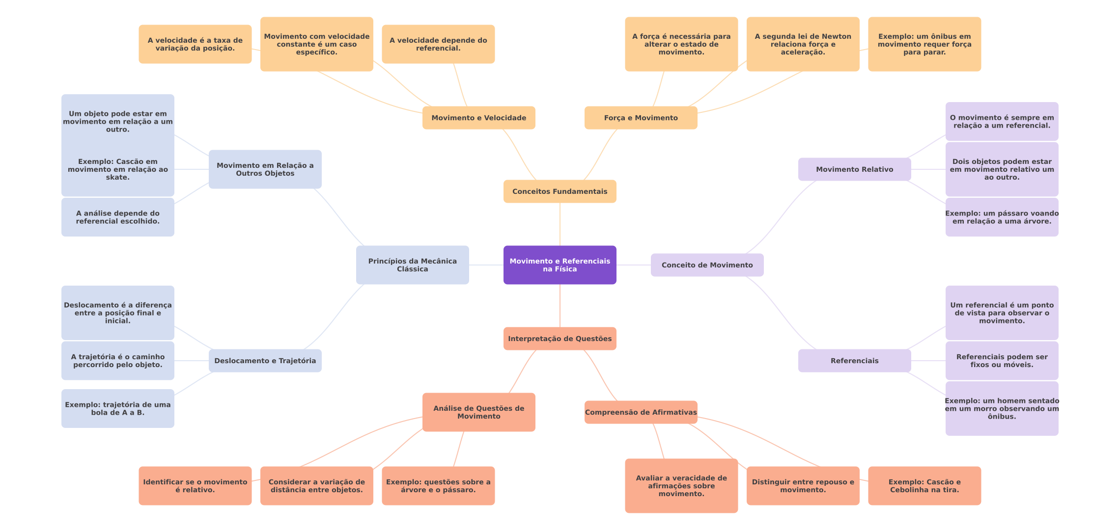 Movimento com velocidade A velocidade é a taxa de A velocidade depende do A força é necessária para A segunda lei de Newton Exemplo: um ônibus em constante é um caso alterar estado de variação da posição. referencial. relaciona força e movimento requer força específico. movimento. aceleração. para parar. Um objeto pode estar em Movimento e Velocidade movimento em relação a um Força e Movimento movimento é sempre em outro. relação a um referencial. Exemplo: Cascão em movimento em relação ao Movimento em Relação a Dois objetos podem estar Movimento Relativo em movimento relativo um skate. Outros Objetos ao outro. Conceitos Fundamentais A análise depende do Exemplo: um pássaro voando referencial escolhido. em relação a uma árvore. Princípios da Mecânica Movimento e Referenciais Conceito de Movimento Clássica na Física Deslocamento é a diferença Um referencial é um ponto entre a posição final e de vista para observar inicial. movimento. Interpretação de Questões A trajetória é caminho Deslocamento e Trajetória Referenciais Referenciais podem ser percorrido pelo objeto. fixos ou móveis. Exemplo: trajetória de uma Exemplo: um homem sentado Análise de Questões de em um morro observando um bola de A a Movimento Compreensão de Afirmativas ônibus. Avaliar a veracidade de Identificar se movimento Considerar a variação de Exemplo: questões sobre a afirmações sobre Distinguir entre repouso e Exemplo: Cascão e é relativo. distância entre objetos. árvore e pássaro. movimento. Cebolinha na tira. movimento.