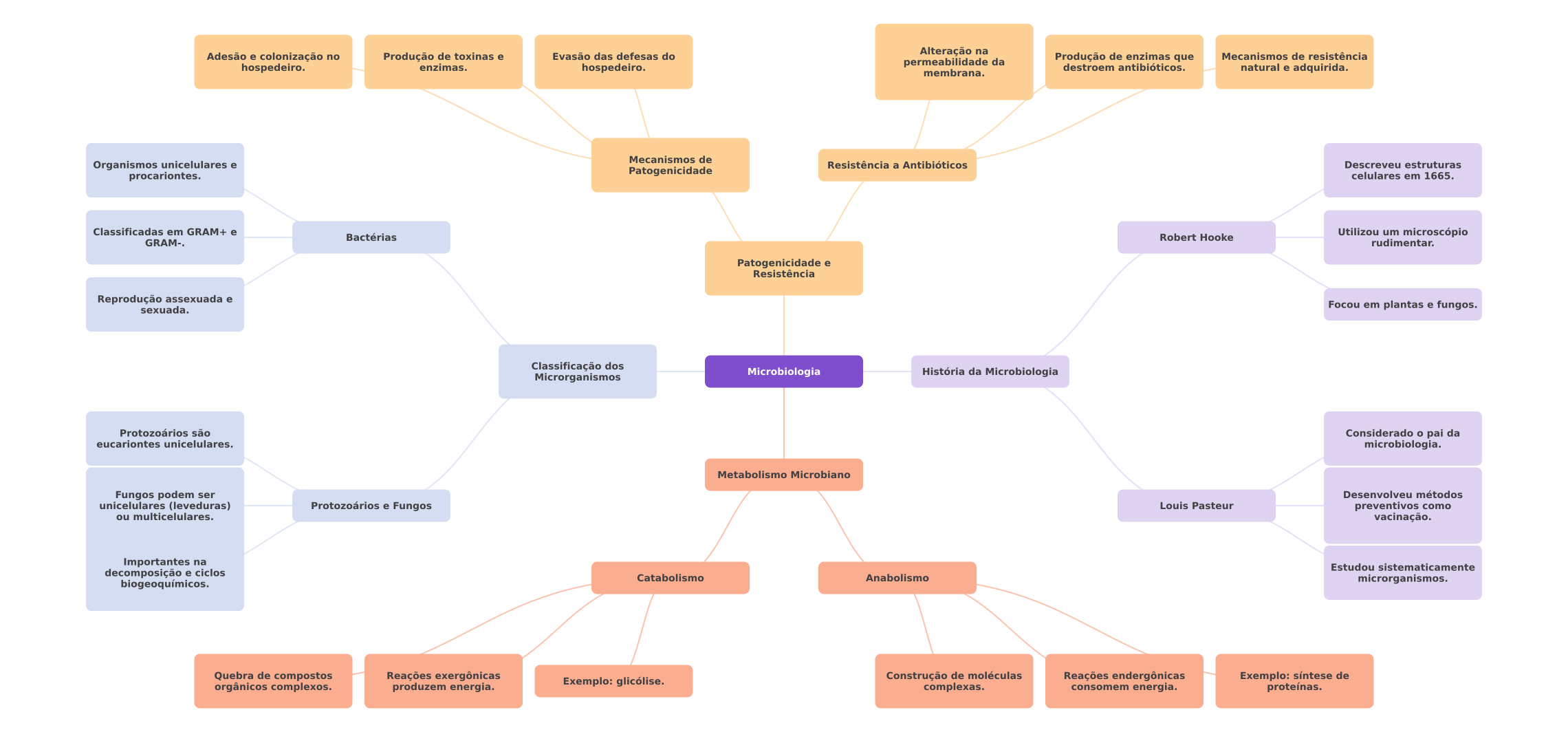Evasão das defesas do Alteração na Adesão e colonização no Produção de toxinas e Produção de enzimas que Mecanismos de resistência hospedeiro. enzimas. hospedeiro. permeabilidade da destroem antibióticos. membrana. natural e adquirida. Mecanismos de Organismos unicelulares e Resistência a Antibióticos Descreveu estruturas procariontes. Patogenicidade celulares em 1665. Classificadas em GRAM+ e Bactérias Robert Hooke Utilizou um microscópio GRAM-. rudimentar. Patogenicidade e Resistência Reprodução assexuada e sexuada. Focou em plantas e fungos. Classificação dos Microrganismos Microbiologia História da Microbiologia Protozoários são Considerado pai da eucariontes unicelulares. microbiologia. Metabolismo Microbiano Fungos podem ser Desenvolveu métodos unicelulares (leveduras) Protozoários e Fungos Louis Pasteur preventivos como ou multicelulares. vacinação. Importantes na Estudou sistematicamente decomposição e ciclos Catabolismo Anabolismo biogeoquímicos. microrganismos. Quebra de compostos Reações exergônicas produzem energia. Exemplo: glicólise. Construção de moléculas Reações endergônicas Exemplo: síntese de orgânicos complexos. complexas. consomem energia. proteínas.
