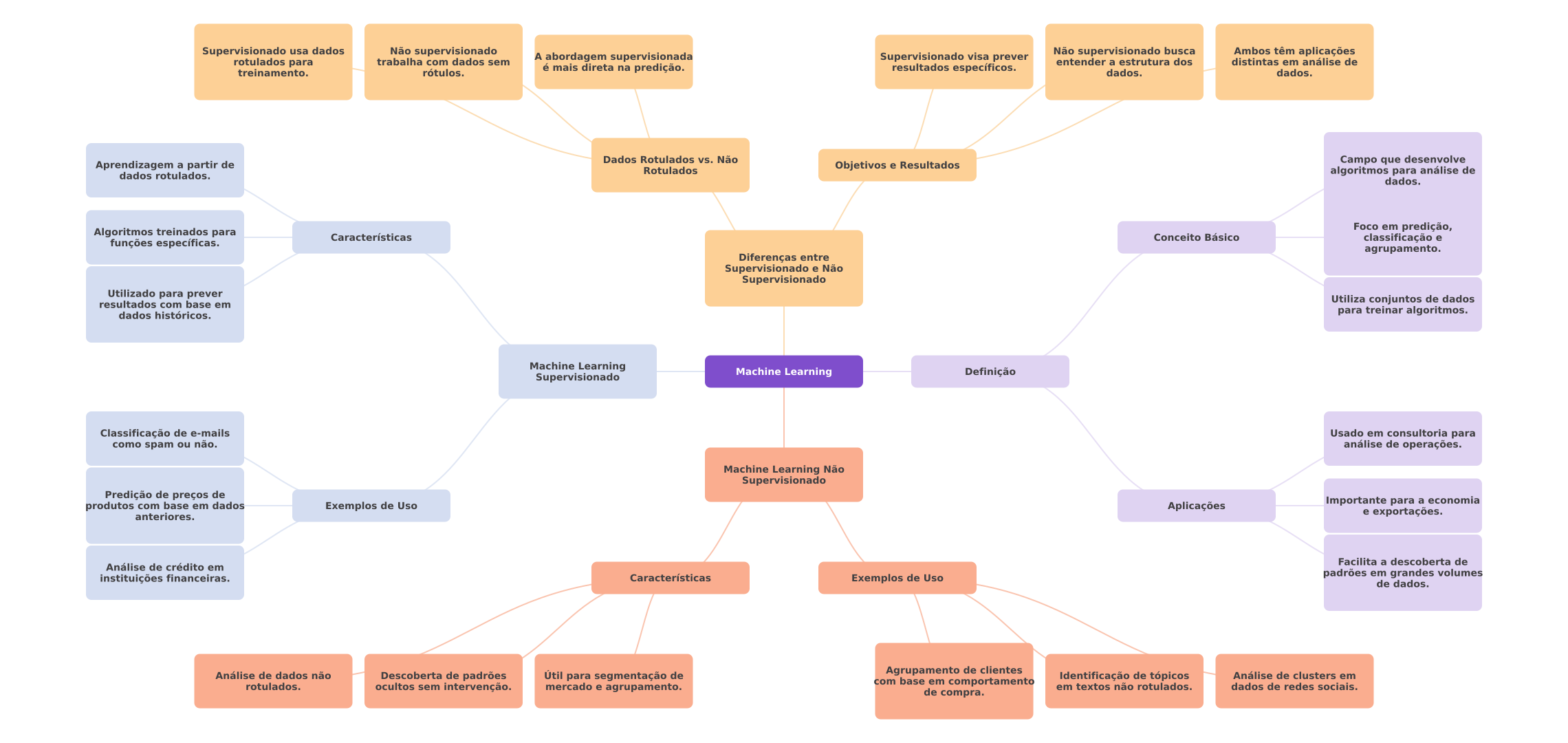 Supervisionado usa dados Não supervisionado A abordagem supervisionada Supervisionado visa prever Não supervisionado busca Ambos têm aplicações rotulados para trabalha com dados sem entender a estrutura dos distintas em análise de treinamento. rótulos. é mais direta na predição. resultados específicos. dados. dados. Dados Rotulados vs. Não Aprendizagem a partir de Objetivos e Resultados Campo que desenvolve Rotulados dados rotulados. algoritmos para análise de dados. Algoritmos treinados para Foco em predição, Características Conceito Básico funções específicas. classificação e agrupamento. Diferenças entre Supervisionado e Não Supervisionado Utilizado para prever resultados com base em Utiliza conjuntos de dados dados históricos. para treinar algoritmos. Machine Learning Supervisionado Machine Learning Definição Classificação de e-mails Usado em consultoria para como spam ou não. análise de operações. Machine Learning Não Supervisionado Predição de preços de produtos com base em dados Exemplos de Uso Aplicações Importante para a economia anteriores. e exportações. Facilita a descoberta de Análise de crédito em instituições financeiras. Características Exemplos de Uso padrões em grandes volumes de dados. Análise de dados não Descoberta de padrões para segmentação de Agrupamento de clientes rotulados. com base em comportamento Identificação de tópicos Análise de clusters em ocultos sem intervenção. mercado e agrupamento. em textos não rotulados. dados de redes sociais. de compra.