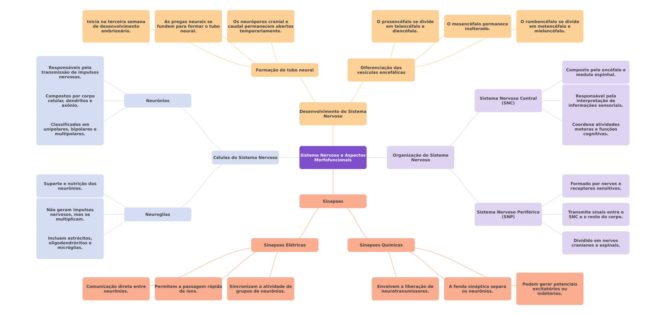 Inicia na terceira semana As pregas neurais se Os neuróporos cranial e prosencéfalo se divide rombencéfalo se divide de desenvolvimento fundem para formar tubo caudal permanecem abertos em telencéfalo e mesencéfalo permanece em metencéfalo e inalterado. embrionário. neural. temporariamente. diencéfalo. mielencéfalo. Responsáveis pela Formação do tubo neural Diferenciação das transmissão de impulsos vesículas encefálicas Composto pelo encéfalo e medula espinhal. nervosos. Compostos por corpo Sistema Nervoso Central Responsável pela celular, dendritos e Neurônios (SNC) interpretação de axônio. informações sensoriais. Desenvolvimento do Sistema Nervoso Classificados em Coordena atividades unipolares, bipolares e motoras e funções multipolares. cognitivas. Células do Sistema Nervoso Sistema Nervoso e Aspectos Organização do Sistema Morfofuncionais Nervoso Suporte e nutrição dos Formado por nervos e neurônios. receptores sensitivos. Sinapses Não geram impulsos Sistema Nervoso Periférico Transmite sinais entre nervosos, mas se Neuroglias (SNP) multiplicam. SNC e resto do corpo. Incluem astrócitos, Dividido em nervos oligodendrócitos e Sinapses Elétricas Sinapses Químicas micróglias. cranianos e espinais. Comunicação direta entre Permitem a passagem rápida Sincronizam a atividade de Envolvem a liberação de A fenda sináptica separa Podem gerar potenciais excitatórios ou neurônios. de íons. grupos de neurônios. neurotransmissores. os neurônios. inibitórios.