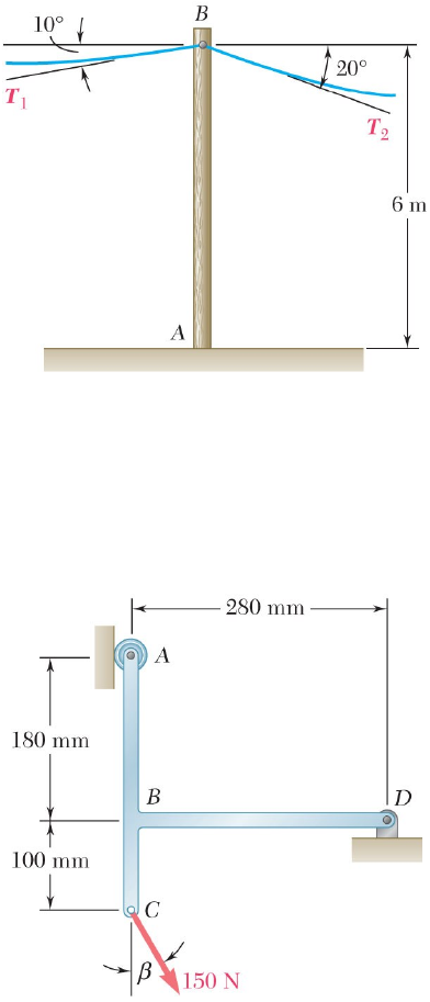 Universidade Federal de Mato Grosso Curso de Engenharia Civil Disciplina: Mecânica Vetorial, Turma EC2 Prof. D. Sc. Christian Luiz Perlin Lista de Exercı́cios 3 Exercı́cio 1. O poste da figura é utilizado para sustentar a extremidade de dois fios que formam com a horizontal os ângulos mostrados. Sabendo que as trações nos fios são T1 = 400 N e T2 = 250 N, calcule (a) o módulo, direção e sentido da força resultante R⃗ = T⃗1 + T⃗2, (b) o momento de T⃗1 em relação ao ponto A, (c) o momento de T⃗2 em relação ao ponto A. Exercício 1 O poste da figura é utilizado para sustentar a extremidade de dois fios que formam com a horizontal os ângulos mostrados. Sabendo que as trações nos fios são T1 = 400 N e T2 = 250 N, calcule (a) o módulo, direção e sentido da força resultante R = T1 + T2, (b) o momento de T1 em relação ao ponto A, (c) o momento de T2 em relação ao ponto A. Exercı́cio 2. (a) Calcule o momento da força de 150 N em relação ao ponto D para β = 25°. (b) Determine o valor de β para o qual o momento da força de 150 N é máximo e também o valor desse momento. Exercício 2 (a) Calcule o momento da força de 150 N em relação ao ponto D para β = 25°. (b) Determine o valor de β para o qual o momento da força de 150 N é máximo e também o valor desse momento. 1 Exercı́cio 3. Calcule o momento resultante das três forças aplicadas na estrutura em relação (a) ao ponto A, (b) ao ponto B. Utilize a unidade quilonewton (kN) com g = 10 m/s2. Exercício 3 Calcule o momento resultante das três forças aplicadas na estrutura em relação (a) ao ponto A, (b) ao ponto B. Utilize a unidade quilonewton (kN) com g = 10 m/s². Exercı́cio 4. A tração no cabo AB de sustentação da torre é 4,8 kN. Determine o momento da força aplicada pelo cabo em B em relação ao ponto P = (56; 30; –8) m. Exercício 4 A tração no cabo AB de sustentação da torre é 4,8 kN. Determine o momento da força aplicada pelo cabo em B em relação ao ponto P = (56; 30; -8) m. 2 Exercı́cio 5. (BEER, F. P. et al. Mecânica Vetorial para Engenheiros: Estática. 9. ed. 2012.) 3.24 Uma tábua AB, usada para escorar temporariamente um telhado, exerce no ponto A do telhado uma força de 254 N dirigida ao longo de BA. Determine o momento da força em relação a C. Exercício 5 3.24 Uma tábua AB, usada para escorar temporariamente um telhado, exerce no ponto A do telhado uma força de 254 N dirigida ao longo de BA. Determine o momento da força em relação a C. Gabarito Exercı́cio 1. (a) |R⃗| = 222.025 N. θ = 224.26°. (b) M1 = 2363.539 N.m. (c) M2 = −1409.509 N.m. Exercı́cio 2. (a) MD = 44.404 N.m. (b) β = 19.654°. MD,max = 44.598 N.m. Exercı́cio 3. (a) M⃗A = (−170⃗i+ 100⃗j − 60k⃗) kN.m. (b) M⃗B = (−120⃗i+ 80⃗j − 80k⃗) kN.m. Exercı́cio 4. M⃗P = (−43.757⃗i− 69.196⃗j + 126.182k⃗) kN.m. Exercı́cio 5. M⃗C = (−203.15⃗i+ 88.75⃗j − 285.65k⃗) N.m. 3