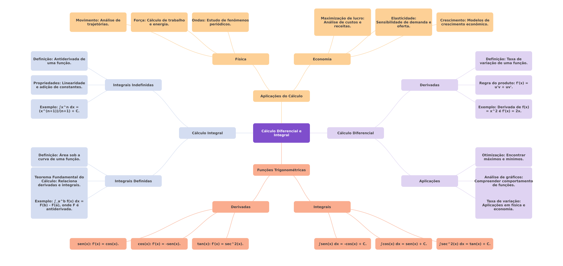 Movimento: Análise de Força: Cálculo de trabalho Ondas: Estudo de fenômenos Maximização de lucro: Elasticidade: Crescimento: Modelos de Análise de custos e Sensibilidade de demanda e trajetórias. e energia. periódicos. crescimento econômico. receitas. oferta. Definição: Antiderivada de Física Economia Definição: Taxa de uma função. variação de uma função. Propriedades: Linearidade Integrais Indefinidas Derivadas Regra do produto: f'(x) = e adição de constantes. u'v uv'. Aplicações do Cálculo Exemplo: dx = Exemplo: Derivada de f(x) (x^(n+1))/(n+1) = x^2 é f'(x) = Cálculo Diferencial e Cálculo Integral Cálculo Diferencial Integral Definição: Área sob a Otimização: Encontrar curva de uma função. máximos e mínimos. Funções Trigonométricas Teorema Fundamental do Análise de gráficos: Cálculo: Relaciona Integrais Definidas Aplicações Compreender comportamento derivadas e integrais. de funções. Exemplo: a^b f(x) dx = Taxa de variação: F(b) F(a), onde Derivadas Integrais Aplicações em física e antiderivada. economia. sen(x): f'(x) = cos(x). cos(x): f'(x) = -sen(x). tan(x): f'(x) = sec^2(x). dx = -cos(x) dx = sen(x) dx = tan(x) +