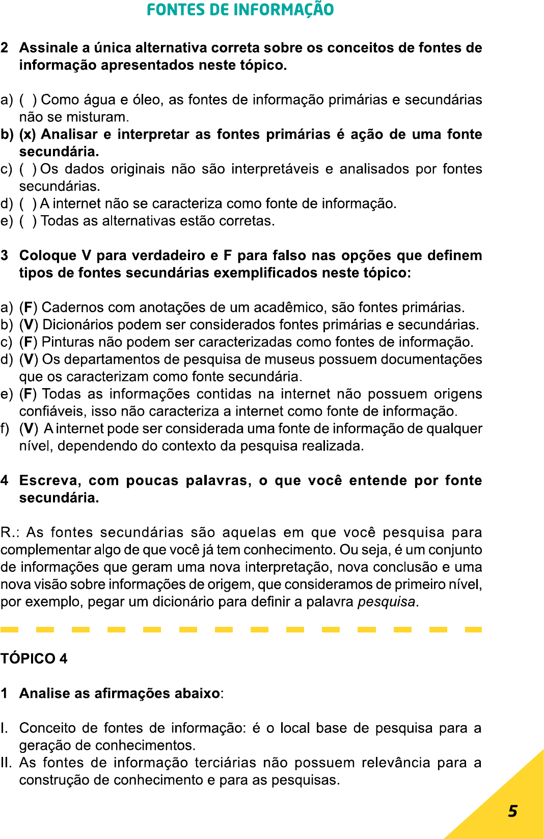 FONTES DE INFORMAÇÃO 2 Assinale a única alternativa correta sobre os conceitos de fontes de informação apresentados neste tópico. a) Como água e óleo, as fontes de informação primárias e secundárias não se misturam. b) (x) Analisar e interpretar as fontes primárias é ação de uma fonte secundária. c) Os dados originais não são interpretáveis e analisados por fontes secundárias. d) A internet não se caracteriza como fonte de informação. e) Todas as alternativas estão corretas. 3 Coloque V para verdadeiro e F para falso nas opções que definem tipos de fontes secundárias exemplificados neste tópico: a) (F) Cadernos com anotações de um acadêmico, são fontes primárias. b) (V) Dicionários podem ser considerados fontes primárias e secundárias. c) (F) Pinturas não podem ser caracterizadas como fontes de informação. d) (V) Os departamentos de pesquisa de museus possuem documentações que os caracterizam como fonte secundária. e) (F) Todas as informações contidas na internet não possuem origens confiáveis, isso não caracteriza a internet como fonte de informação. f) (V) Ainternet pode ser considerada uma fonte de informação de qualquer nível, dependendo do contexto da pesquisa realizada. 4 Escreva, com poucas palavras, que você entende por fonte secundária. R.: As fontes secundárias são aquelas em que você pesquisa para complementar algo de que você já tem conhecimento. Ou seja, é um conjunto de informações que geram uma nova interpretação, nova conclusão e uma nova visão sobre informações de origem, que consideramos de primeiro nível, por exemplo, pegar um dicionário para definir a palavra pesquisa. TÓPICO 4 1 Analise as afirmações abaixo: I. Conceito de fontes de informação: é local base de pesquisa para a geração de conhecimentos. II. As fontes de informação terciárias não possuem relevância para a construção de conhecimento e para as pesquisas. 5FONTES DE INFORMAÇÃO III. Fontes terciárias são um compilado de outras fontes de informação. IV. Não existe hierarquia quanto aos três níveis de fontes de informação. V. As fontes terciárias dependem da existência das fontes secundárias. Selecione apenas a alternativa que possui as afirmações corretas: a) (x) I, III, e V. b) ( ) II, IV e V. c) I, III e IV. d) II, III e IV. e) ( ) II, III e V. 2 Coloque V para verdadeiro e F para falso: a) (F) conhecimento, assim como a genética, nasce com as pessoas. b) (V) Quanto à pesquisa, seja científica ou não, ela possui uma estrutura e um fluxo, correlacionado às fontes de informação estudadas neste caderno. c) (V) As pesquisas, de modo geral, iniciam pelas fontes terciárias, descendo para nível das fontes secundárias e chegando às fontes primárias. d) (F) Pesquisas são realizadas apenas em laboratórios para experimentos científicos. e) (V) A principal característica das fontes terciárias é a apresentação de uma análise do conteúdo e uma visão resumida do conhecimento. f) (V) Assim como os demais níveis, as fontes de informação terciárias possuem tipos que as caracterizam. 3 Assinale a alternativa que possui apenas tipos de fontes de informação terciária estudados neste caderno. a) Receitas culinárias e receitas médicas. b) Pinturas abstratas, esculturas e monumentos históricos. c) Objetos decorativos e fotografias familiares. d) (x) Biblioteca, enciclopédias e artigos científicos. e) Todas as alternativas estão corretas. 4 Diante dos estudos efetuados neste caderno, descreva os três níveis de fontes de informação, com breve conceito de cada um deles. R.: Fontes Primárias: Buscar os autores base do conhecimento. Fontes Secundárias: Ter mais opiniões ou conceitos sobre assunto. Fontes Terciárias: São um compilado das demais fontes, por exemplo uma biblioteca ou enciclopédia que possuem diversas fontes primárias e secundárias. 6
