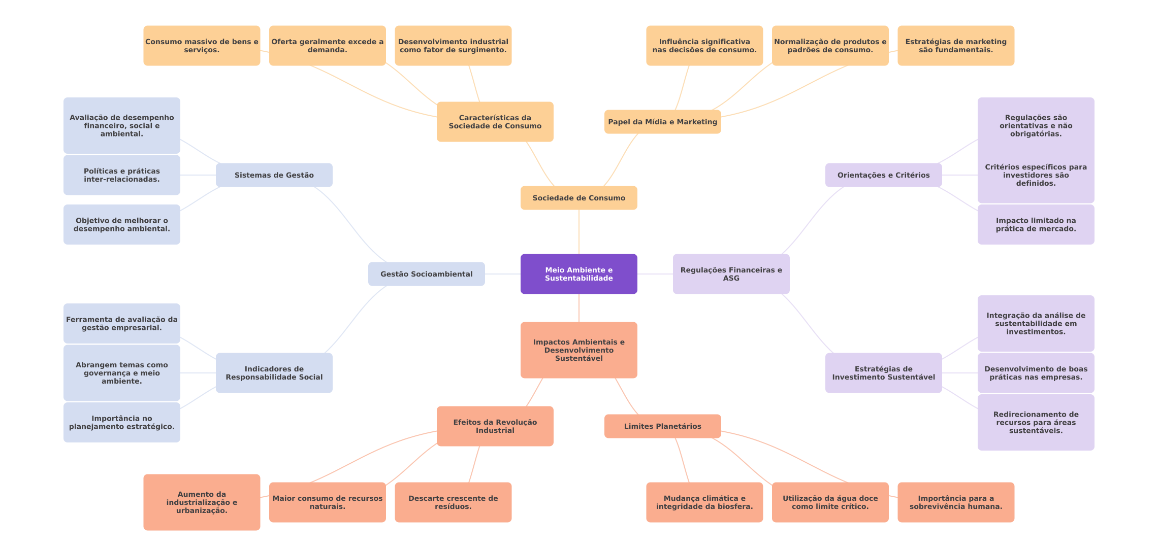 Consumo massivo de bens e Oferta geralmente excede a Desenvolvimento industrial Influência significativa Normalização de produtos e Estratégias de marketing serviços. demanda. como fator de surgimento. nas decisões de consumo. padrões de consumo. são fundamentais. Avaliação de desempenho Características da Regulações são financeiro, social e Sociedade de Consumo Papel da Mídia e Marketing orientativas e não ambiental. obrigatórias. Critérios específicos para Políticas e práticas Sistemas de Gestão Orientações e Critérios investidores são inter-relacionadas. definidos. Sociedade de Consumo Objetivo de melhorar Impacto limitado na desempenho ambiental. prática de mercado. Meio Ambiente e Gestão Socioambiental Regulações Financeiras e Sustentabilidade ASG Integração da análise de Ferramenta de avaliação da sustentabilidade em gestão empresarial. investimentos. Impactos Ambientais e Desenvolvimento Sustentável Abrangem temas como Indicadores de Estratégias de Desenvolvimento de boas governança e meio Responsabilidade Social Investimento Sustentável ambiente. práticas nas empresas. Redirecionamento de Importância no Efeitos da Revolução planejamento estratégico. Limites Planetários recursos para áreas Industrial sustentáveis. Aumento da Maior consumo de recursos Descarte crescente de Mudança climática e Utilização da água doce industrialização e Importância para a naturais. resíduos. integridade da biosfera. como limite crítico. sobrevivência humana. urbanização.