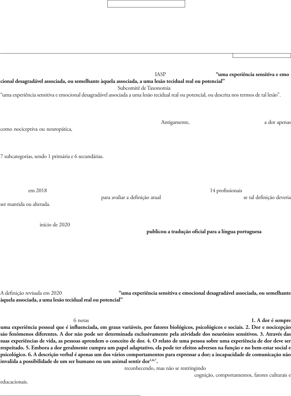 197 A definição revisada pela Associação Internacional para o Estudo da Dor (IASP) conceitua a dor como “uma experiência sensitiva e emo- cional desagradável associada, ou semelhante àquela associada, a uma lesão tecidual real ou potencial”1. Datada de 1979, a primeira definição recomendada pelo Subcomitê de Taxonomia e adotada pelo Conselho da IASP conceituava a dor como “uma experiência sensitiva e emocional desagradável associada a uma lesão tecidual real ou potencial, ou descrita nos termos de tal lesão”. Essa definição foi amplamente aceita por profissionais da saúde e pesquisadores da área de dor e adotada por diversas organizações profissionais, governamentais e não-governamentais, incluindo a Organização Mundial da Saúde (OMS). Ao longo de 41 anos, mudanças revolucionárias ocorreram na compreensão do fenômeno da dor, além de publicações muito importantes no que se refere a sua definição e classificação, especialmente na última década. Antigamente, uma visão dicotômica considerava a dor apenas como nociceptiva ou neuropática, fato que excluía outras condições, tal como a fibromialgia. Em 2016 surgiu um terceiro descritor, dor nociplástica, para melhor classificar outras condições dolorosas2. Em 2019 outra questão conceitual e de classificação foi resolvida, quando da inclusão da dor crônica na Classificação Internacional de Doen- ças (CID)3. Esta demanda foi resultante da ação conjunta de uma Força Tarefa da IASP e da OMS. Atualmente, a dor consta na CID-11 com 7 subcategorias, sendo 1 primária e 6 secundárias. Recentemente, alguns profissionais e pesquisadores da área de dor argumentaram que os avanços no entendimento da dor justificavam uma reavaliação da definição, apresentando propostas de modificação, fortes opiniões em favor ou em oposição à necessidade de revisão e, portan- to, propuseram modificações ao longo dos últimos anos4,5. Como ocorrem avanços contínuos e consistentes quanto ao conhecimento sobre a dor e seus mecanismos, a terminologia da dor também deve ser modificada e ajustada. Sendo assim, em 2018, a IASP convocou uma Força Tarefa Presidencial multinacional, composta por 14 profissionais com ampla experiência em ciência clínica e/ou básica relacionada à dor para avaliar a definição atual e suas notas explicativas e recomendar se tal definição deveria ser mantida ou alterada. A revisão oferece uma sinopse dos conceitos críticos, análise dos comentários dos membros da IASP e do público, e as recomendações finais do comitê sobre as revisões da definição e das notas que foram discutidas por dois anos. Por fim, a Força Tarefa recomendou uma definição revisada de dor no início de 2020. A Diretoria da Sociedade Brasileira para o Estudo da Dor (SBED) publicou a tradução oficial para a língua portuguesa não somente da definição revisada e suas notas, como também de todo o artigo na íntegra, considerando os aspectos semânticos e linguísticos para a língua portuguesa e contexto brasileiro6,7. Executaram-se as etapas necessárias para a tradução oficial desta definição de dor e suas notas complementares para a língua portuguesa, no intuito de que nossa população brasileira tenha amplo acesso a uma linguagem uniforme e no idioma nativo. Inicialmente, o artigo foi integralmente traduzido por profissional especialista em idioma e com formação em português-inglês. Posterior- mente, uma etapa de revisão e discussão foi realizada pelos membros da diretoria, clínicos e/ou pesquisadores na área da dor com, pelo me- nos, 15 anos de experiência. As revisões individuais foram compartilhadas e pontualmente analisadas em reuniões remotas síncronas online, seguida por uma segunda etapa de revisão até ser obtido consenso sobre a tradução. A definição revisada em 2020, ao conceituar a dor como “uma experiência sensitiva e emocional desagradável associada, ou semelhante àquela associada, a uma lesão tecidual real ou potencial”, apresentou enunciado conciso e inequívoco, de fácil tradução nos vários idiomas; abrangendo as mais variadas experiências de dor, sua diversidade e complexidade, sendo válida tanto para dor aguda como crônica; sendo aplicável a todas as condições de dor, a humanos e animais e, sobretudo, definida pela perspectiva da pessoa que sente a dor1,6,7. A definição é complementada por 6 notas explicativas que passam a ser uma lista com itens que incluem a etimologia: 1. A dor é sempre uma experiência pessoal que é influenciada, em graus variáveis, por fatores biológicos, psicológicos e sociais. 2. Dor e nocicepção são fenômenos diferentes. A dor não pode ser determinada exclusivamente pela atividade dos neurônios sensitivos. 3. Através das suas experiências de vida, as pessoas aprendem o conceito de dor. 4. O relato de uma pessoa sobre uma experiência de dor deve ser respeitado. 5. Embora a dor geralmente cumpra um papel adaptativo, ela pode ter efeitos adversos na função e no bem-estar social e psicológico. 6. A descrição verbal é apenas um dos vários comportamentos para expressar a dor; a incapacidade de comunicação não invalida a possibilidade de um ser humano ou um animal sentir dor1,6,7. Estas notas explicativas complementam a definição de dor, reconhecendo, mas não se restringindo a, os avanços nos conhecimentos pauta- dos na moderna neurociência da dor, também incorporando outros fatores relevantes como cognição, comportamentos, fatores culturais e educacionais. Definição de dor revisada após quatro décadas Definition of pain revised after four decades © Sociedade Brasileira para o Estudo da Dor BrJP. São Paulo, 2020 jul-set;3(3):197-8 DOI 10.5935/2595-0118.20200191 EDITORIAL 198 DeSantana JM, Perissinotti DM, Oliveira Junior JO, Correia LM, Oliveira CM e Fonseca PR BrJP. São Paulo. 2020;3 Ainda, ao final das notas explicativas são apresentadas as informa- çõe