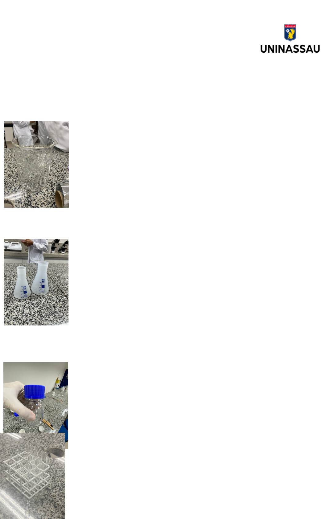PESQUISA – VIDRARIAS DE LABORATÓRIO Aluno: Gilvam Ramos da Silva Júnior Curso: Farmácia Matrícula: 01650401 COPO BECKER FUNÇÃO: Usado para aquecimento de líquidos, reações de precipitações e etc FRASCO ERLENMEYER FUNÇÃO: Usado para titulações e aquecimento de líquidos. FRASCO REAGENTE FUNÇÃO: Usado para o armazenamento de soluções. TUBOS DE ENSAIO + SUPORTE FUNÇÃO: Serve para acondicionar, misturar e coletar substâncias. BALÃO VOLUMÉTRICO FUNÇÃO: É uma das principais vidrarias de laboratório, utilizada na preparação de soluções em volumes precisos, quando não há espaço para erros nas quantidades. PLACA DE PETRI FUNÇÃO: É um recipiente cilíndrico achatado com tampa utilizado para cultura e identificação de microrganismos. PROVETA GRADUADA FUNÇÃO: Utiliza-se a proveta graduada em processos de química, física e biologia, aferindo líquidos de baixa precisão. PIPETA VOLUMÉTRICA FUNÇÃO: Usada para medir volumes fixos de líquidos. VIDRO DE RELÓGIO FUNÇÃO: É utilizado principalmente para a pesagem de pequenas quantidades de sólidos em laboratórios. CONDENSADOR FUNÇÃO: O condensador é uma vidraria utilizada em laboratórios com o propósito de condensar gases ou vapores, transformando-os em estado líquido. SUPORTE + BURETA + ERLENMEYER FUNÇÃO: Realizar dosagens exatas de soluções em outros recipientes ALÇA DE DRIGALSKI FUNÇÃO: Indicado para espalhar suspensões de microrganismos na Placa de Petri contendo meio de cultura sólido BALÃO DE FUNDO CHATO FUNÇÃO: Serve para armazenar líquidos. É indicado para destilações, usando uma manta de aquecimento, assim como para sistemas de refluxo e evaporação a vácuo. DESSECADOR FUNÇÃO: Usado para resfriar substâncias em ausência de umidade. FUNIL DE BUCHNER FUNÇÃO: Usado para filtração a vácuo. ALMOFARIZ E PISTILO FUNÇÃO: Usado para triturar e pulverizar sólidos. PISSETA FUNÇÃO: Usado para lavagens, remoção de precipitados e outros fins. FUNIL DE VIDRO FUNÇÃO: Usada em transferências de líquidos e em filtrações. PINÇA METÁLICA CASTELOY FUNÇÃO: Usada para transporte de cadinho e outros fins. CADINHO FUNÇÃO: Usado nas calcinações, secagem, aquecimento e fusões de substâncias. COPO GRADUADO FUNÇÃO: Usado para medir volumes sem grande precisão. KITAZATO FUNÇÃO: Frasco de vidro coletor do filtrado a alto vácuo. BASTÃO DE VIDRO FUNÇÃO: São utilizados para agitar substâncias e facilitar a homogeneização. Também auxiliam na transferência de líquido de um recipiente para outro. FRASCO BOREL COM TAMPA FUNÇÃO: Utilizado para armazenamento de lâminas, com cortes histológicos. image9.jpeg image10.jpeg image11.jpeg image12.jpeg image13.jpeg image14.jpeg image15.jpeg image16.jpeg image17.jpeg image18.jpeg image1.png image19.jpeg image20.jpeg image21.jpeg image22.jpeg image23.jpeg image24.jpeg image25.jpeg image2.jpeg image3.jpeg image4.jpeg image5.jpeg image6.jpeg image7.jpeg image8.jpeg