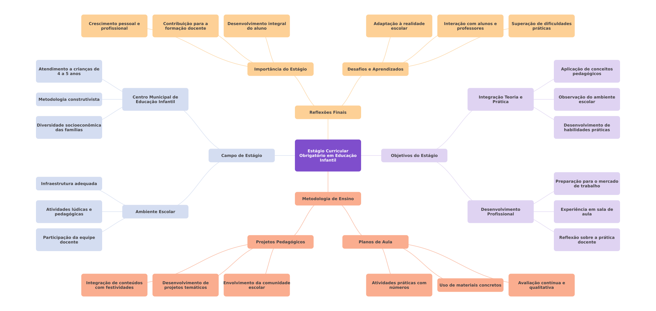 Crescimento pessoal e Contribuição para a Desenvolvimento integral Adaptação à realidade Interação com alunos e Superação de dificuldades profissional formação docente do aluno escolar professores práticas Atendimento a crianças de Importância do Estágio Desafios e Aprendizados Aplicação de conceitos 4 anos pedagógicos Metodologia construtivista Centro Municipal de Integração Teoria e Observação do ambiente Educação Infantil Prática escolar Reflexões Finais Diversidade socioeconômica Desenvolvimento de das famílias habilidades práticas Estágio Curricular Campo de Estágio Obrigatório em Educação Objetivos do Estágio Infantil Infraestrutura adequada Preparação para mercado de trabalho Metodologia de Ensino Atividades lúdicas e Desenvolvimento Ambiente Escolar Experiência em sala de pedagógicas Profissional aula Participação da equipe Reflexão sobre a prática docente Projetos Pedagógicos Planos de Aula docente Integração de conteúdos Desenvolvimento de Envolvimento da comunidade Atividades práticas com Avaliação contínua e Uso de materiais concretos com festividades projetos temáticos escolar números qualitativa
