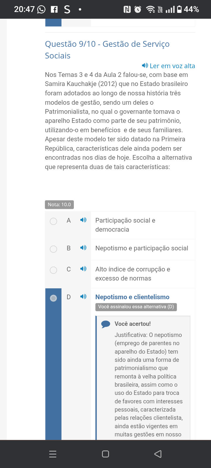 20:47 f S N 44% Questão 9/10 Gestão de Serviço Sociais Ler em voz alta Nos Temas 3 e 4 da Aula 2 falou-se, com base em Samira Kauchakje (2012) que no Estado brasileiro foram adotados ao longo de nossa história três modelos de gestão, sendo um deles Patrimonialista, no qual governante tomava aparelho Estado como parte de seu patrimônio, utilizando-o em benefícios e de seus familiares. Apesar deste modelo ter sido datado na Primeira República, características dele ainda podem ser encontradas nos dias de hoje. Escolha a alternativa que representa duas de tais características: Nota: 10.0 A Participação social e democracia B Nepotismo e participação social c Alto índice de corrupção e excesso de normas D Nepotismo e clientelismo Você assinalou essa alternativa (D) Você acertou! Justificativa: 0 nepotismo (emprego de parentes no aparelho do Estado) tem sido ainda uma forma de patrimonialismo que remonta à velha política brasileira, assim como uso do Estado para troca de favores com interesses pessoais, caracterizada pelas relações clientelista, ainda estão vigentes em muitas gestões em nosso