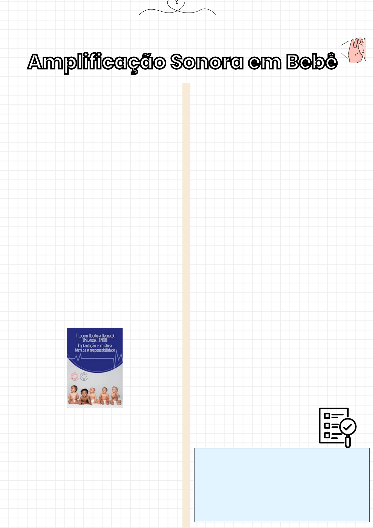 INTRODUÇÃO -> A implementação universal de testes de audição para recém-nascido, conhecido como triagem auditiva neonatal universal (TANU) tem simplificado o processo de diagnóstico auditivo precoce e viabilizado o início imediato de tratamentos fonoaudiológicos e médicos durante uma fase crucial de desenvolvimento e adaptabilidade do sistema nervoso central, contribuindo para perspectivas otimistas quanto ao progresso global da criança. O início precoce da intervenção com bebês muito novos tem levado a alterações na forma como os profissionais lidam com a audição infantil, levando em conta as especificidades do tratamento fonoaudiológico com bebês e o uso de protocolos comprovados cientificamente para esse grupo. -> A perda auditiva na infância ocasiona dificuldades sensoriais em relação aos sons da fala, prejudicando o desenvolvimento da linguagem oral das crianças. Para superar isso, são utilizados aparelhos auditivos ou implantes cocleares em casos graves ou profundos de perda auditiva, permitindo assim o acesso aos sons da fala. INTRODUÇÃO -> A adaptação de aparelhos auditivos em bebês segue quatro etapas similares às usadas em adultos: Avaliação1. Escolha do dispositivo eletrônico2. Verificação da amplificação3. Verificação e Análise dos resultados4. -> É essencial que todo o procedimento seja focado na família, oferecendo apoio e orientação para lidar com o diagnóstico e entender as necessidades e potenciais de seu filho com deficiência auditiva. AVALIAÇÃO -> O ponto de partida para garantir uma adaptação adequada dos dispositivos de audição e estabelecer metas realistas é o diagnóstico auditivo. Esse diagnóstico é completo quando identifica o tipo, grau e configuração da perda auditiva ou confirma a audição normal. É recomendado realizar avaliações auditivas regularmente para monitorar possíveis mudanças na audição, como alterações na orelha média ou progressão da perda auditiva, garantindo ajustes apropriados na amplificação. Material feito por Ariel Cecon, a venda do mesmo por terceiros é proibida. Sua venda é permitida apenas pelo site resumosdefono.com.br. Não faça plágio, não compartilhe em grupos públicos, caso cometa algum desses atos medidas judiciais serão tomadas. Bons estudos! FONTE BIBLIOGRÁFICA: Tratado de Audiologia @fonoarielcecon / resumosdefono.com.br Amplificação Sonora em BebêAmplificação Sonora em Bebê Figura 1:Triagem Auditiva Neonatal Universal. Fonte: Conselho Federal de Fonoaudiologia Material feito por Ariel Cecon, a venda do mesmo por terceiros é proibida. Sua venda é permitida apenas pelo site resumosdefono.com.br. Não faça plágio, não compartilhe em grupos públicos, caso cometa algum desses atos medidas judiciais serão tomadas. Bons estudos! FONTE BIBLIOGRÁFICA: Tratado de Audiologia @fonoarielcecon / resumosdefono.com.br Amplificação Sonora em BebêAmplificação Sonora em Bebê AVALIAÇÃO -> A seleção dos testes para avaliar a audição em crianças depende não apenas da idade, mas principalmente do seu estágio de desenvolvimento neuropsicomotor. Por isso, é essencial iniciar qualquer avaliação auditiva com uma entrevista detalhada com a mãe ou cuidador, visando entender o desenvolvimento motor, visual, social, cognitivo, linguístico, emocional e auditivo da criança. Para realizar uma avaliação auditiva completa em crianças, é necessário utilizar um conjunto abrangente de testes que examinem todo o sistema auditivo. Isso possibilita identificar o tipo, grau e configuração da perda auditiva. Os testes incluem potencial evocado auditivo de tronco encefálico (Peate), emissões otoacústicas (EOA) e medidas de imitância acústica. -> O diagnóstico audiológico neonatal considera as respostas eletrofisiológicas em frequências específicas,. Apesar de estarem fortemente correlacionados, os limiares eletrofisiológicos em crianças geralmente são de 5 a 30 dB mais altos do que os limiares comportamentais obtidos na audiometria tonal. Essa discrepância varia de acordo com a idade, o tipo de transdutor usado, a calibração, o estímulo e os parâmetros aplicados. IMPRESSÃO E CONFECÇÃO DO MOLDE AURICULAR -> A impressão do molde auricular deve ser realizada imediatamente após o diagnóstico, caso haja necessidade de utilizar aparelhos auditivos. -> A confecção dos pré-moldes é feita por um fonoaudiólogo experiente, sob recomendação do otorrinolaringologista. É essencial que o meato acústico externo (MAE) esteja livre de cerúmen antes da impressão do molde, pois isso é crucial para a colocação do tampão bloqueador e para a medição da RECD (diferença real entre a orelha e o acoplador de 2 cc). -> Durante a confecção e aplicação dos moldes, é importante seguir um processo cuidadoso. Figura 2: Confecção do molde do aparelho auditivo Material feito por Ariel Cecon, a venda do mesmo por terceiros é proibida. Sua venda é permitida apenas pelo site resumosdefono.com.br. Não faça plágio, não compartilhe em grupos públicos, caso cometa algum desses atos medidas judiciais serão tomadas. Bons estudos! FONTE BIBLIOGRÁFICA: Tratado de Audiologia @fonoarielcecon / resumosdefono.com.br Amplificação Sonora em BebêAmplificação Sonora em Bebê RECD - REAL EAR TO COUPLER DIFFERENCE -> Moodie et al., em 1994, introduziram a RECD, que representa a diferença, dependendo da frequência, entre a saída do dispositivo eletrônico de amplificação sonora medida na orelha externa e no acoplador de 2 cc. Essa medida visa adaptar a amplificação considerando os efeitos da cabeça, pavilhão auricular, tronco e, principalmente, a ressonância do Meato Acústico Externo (MAE). A incorporação da RECD na seleção de dispositivos para crianças pequenas e bebês facilita um ajuste mais preciso da resposta de frequência necessária para cada criança. Essa medida é endossada pela Academia Americana de Audiologia desde 2