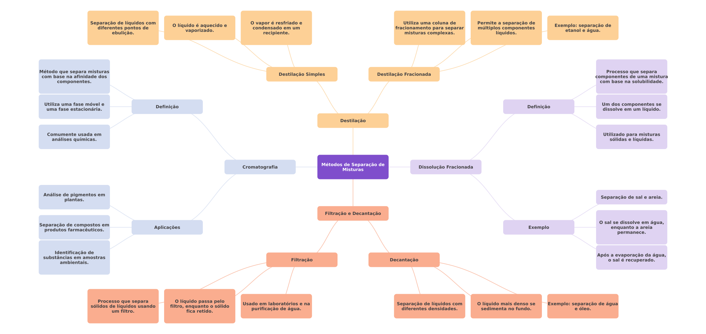 Separação de líquidos com vapor é resfriado e Utiliza uma coluna de líquido é aquecido e Permite a separação de diferentes pontos de condensado em um vaporizado. fracionamento para separar múltiplos componentes Exemplo: separação de ebulição. recipiente. misturas complexas. líquidos. etanol e água. Método que separa misturas com base na afinidade dos Destilação Simples Destilação Fracionada Processo que separa componentes de uma mistura componentes. com base na solubilidade. Utiliza uma fase móvel e uma fase estacionária. Definição Definição Um dos componentes se dissolve em um líquido. Destilação Comumente usada em Utilizado para misturas análises químicas. sólidas e líquidas. Cromatografia Métodos de Separação de Misturas Dissolução Fracionada Análise de pigmentos em Separação de sal e areia. plantas. Filtração e Decantação Separação de compostos em sal se dissolve em água, produtos farmacêuticos. Aplicações Exemplo enquanto a areia permanece. Identificação de substâncias em amostras Após a evaporação da água, ambientais. Filtração Decantação 0 sal é recuperado. Processo que separa líquido passa pelo Usado em laboratórios e na sólidos de líquidos usando filtro, enquanto sólido Separação de líquidos com líquido mais denso se Exemplo: separação de água um filtro. fica retido. purificação de água. diferentes densidades. sedimenta no fundo. e óleo.