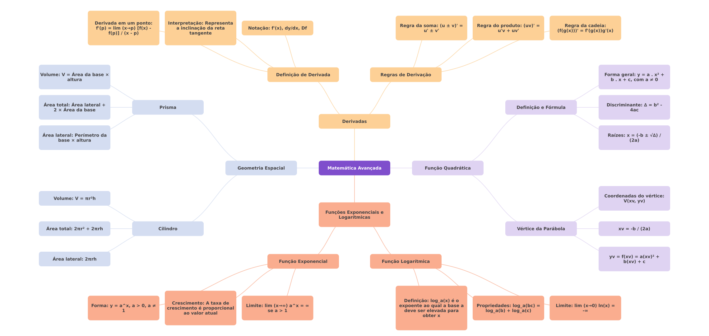 Derivada em um ponto: Interpretação: Representa f'(p) = lim [f(x) a inclinação da reta Notação: f'(x), dy/dx, Df Regra da soma: (u v)' = Regra do produto: (uv)' = Regra da cadeia: u' v' u'v uv' f(p)] (x p) (f(g(x)))' = f'(g(x))g'(x) tangente Volume: V = Área da base Definição de Derivada Regras de Derivação Forma geral: = a + altura b com a 0 Área total: Área lateral + Discriminante: = - Prisma Área da base Definição e Fórmula 4ac Derivadas Área lateral: Perímetro da Raízes: = (-b + / base altura (2a) Geometria Espacial Matemática Avançada Função Quadrática Coordenadas do vértice: Volume: V = V(xv, yv) Funções Exponenciais e Logarítmicas Área total: + Cilindro Vértice da Parábola XV -b (2a) Área lateral: yv = f(xv) = + Função Exponencial Função Logarítmica b(xv) + c Crescimento: A taxa de Definição: log_a(x) é Limite: lim a^x = 00 crescimento é proporcional expoente ao qual a base a Propriedades: a(bc) = Limite: lim (x0) In(x) = 1 se > 1 ao valor atual deve ser elevada para log_a(b) + log_a(c) obter