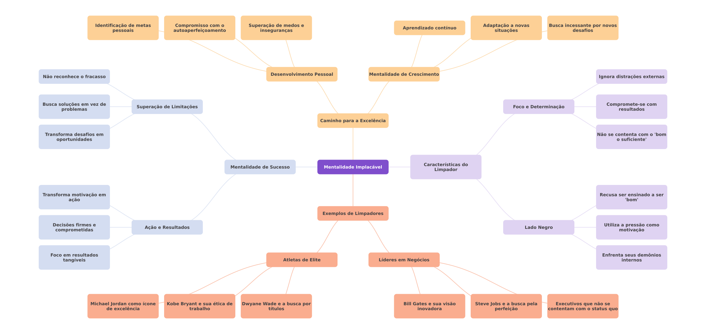 Identificação de metas Compromisso com Superação de medos e Aprendizado contínuo Adaptação a novas Busca incessante por novos pessoais inseguranças situações desafios Desenvolvimento Pessoal Mentalidade de Crescimento Não reconhece fracasso Ignora distrações externas Busca soluções em vez de Superação de Limitações Foco e Determinação Compromete-se com problemas resultados Caminho para a Excelência Transforma desafios em Não se contenta com 'bom oportunidades Características do Mentalidade de Sucesso Mentalidade Implacável Limpador Transforma motivação em Recusa ser ensinado a ser ação 'bom' Exemplos de Limpadores Decisões firmes e comprometidas Ação e Resultados Lado Negro Utiliza a pressão como motivação Foco em resultados Enfrenta seus demônios tangíveis Atletas de Elite Líderes em Negócios internos Michael Jordan como ícone Kobe Bryant e sua ética de Dwyane Wade e a busca por Bill Gates e sua visão Steve Jobs e a busca pela Executivos que não se de excelência trabalho títulos inovadora perfeição contentam com status quo