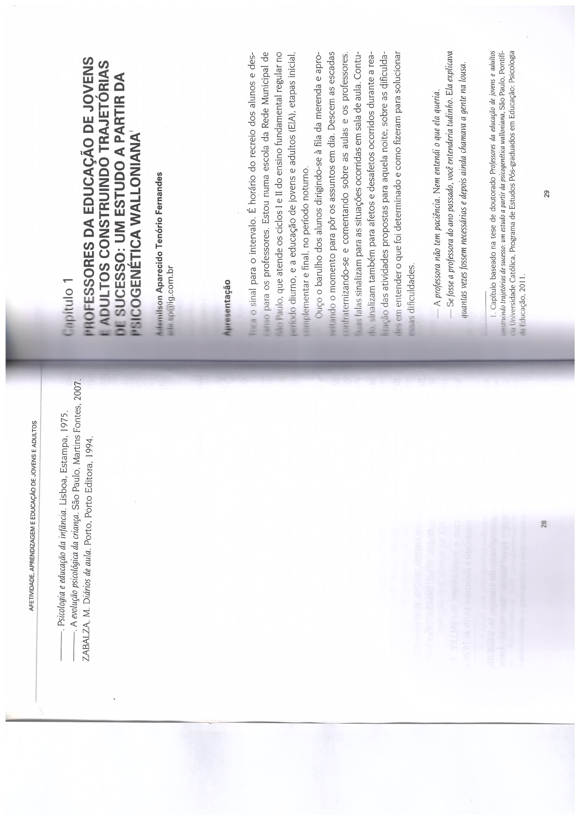 AFETIVIDADE, APRENDIZAGEM E EDUCAÇÃO DE JOVENS E ADULTOS Psicologia e educação da infância. Lisboa, Estampa, 1975. A evolução psicológica da criança. São Paulo, Martins Fontes, 2007. Capítulo 1 ZABALZA, M. Diários de aula. Porto, Porto Editora, 1994. PROFESSORES DA EDUCAÇÃO DE JOVENS E ADULTOS CONSTRUINDO TRAJETÓRIAS DE SUCESSO: UM ESTUDO A PARTIR DA PSICOGENÉTICA WALLONIANA Ademilson Aparecido Tenório Fernandes Apresentação Toca sinal para O intervalo. É horário do recreio dos alunos e des- para os professores. Estou numa escola da Rede Municipal de Paulo, que atende os ciclos I e II do ensino fundamental regular no diurno, e a educação de jovens e adultos (EJA), etapas inicial, complementar e final, no período noturno. Ouço O barulho dos alunos dirigindo-se à fila da merenda e apro- momento para pôr os assuntos em dia. Descem as escadas e comentando sobre as aulas e os professores. Suas falas sinalizam para as situações ocorridas em sala de aula. Contu- do, sinalizam também para afetos e desafetos ocorridos durante a rea- lização das atividades propostas para aquela noite, sobre as dificulda- des em entender que foi determinado e como fizeram para solucionar essas dificuldades. A professora não tem paciência. Nem entendi que ela queria. Se fosse a professora do ano passado, você entenderia tudinho. Ela explicava quantas vezes fossem necessárias e depois ainda chamava a gente na lousa. 1. Capítulo baseado na tese de doutorado Professores da educação de jovens e adultos trajetórias de sucesso: um estudo a partir da psicogenética walloniana, São Paulo, Pontifí- Universidade Católica, Programa de Estudos Pós-graduados em Educação: Psicologia da Educação, 2011. 28 29AFETIVIDADE, APRENDIZAGEM E EDUCAÇÃO DE JOVENS E ADULTOS PROFESSORES DA EDUCAÇÃO DE JOVENS E ADULTOS CONSTRUINDO TRAJETÓRIAS DE SUCESSO Entro na sala dos professores, sento-me à mesa e logo percebo a E aquela aluna? Tão boa, tão esforçada, tão carinhosa com a gente e fazendo chegada dos colegas com seus diários, cadernos, livros e mais livros. Es- EJA... Tá perdendo tempo. Podia até ir pra faculdade se quisesse. tamos a sós agora, sem os alunos. Podemos falar livremente nesse nos- "espaço". E falar é uma das coisas que os professores mais gostam E papo continua, ainda que informal, mas bastante revelador. de fazer. Logo na chegada, já começam as piadas, os comentários e as Como numa peça de teatro, é possível, a partir dos relatos dos cole- notícias do dia. Ambiente germinativo para colocações e discussões. gas, compor cenário, os atores, os protagonistas, os antagonistas, São denúncias, opiniões, percepções, ideias que mereciam ser re- enredo e drama em si. São sentimentos que fluem na sala pequena, gistradas e analisadas. Um campo fértil para iniciar estudo sobre a e onde se tem a ideia de que todos comungam pelo menos um pensar afetividade. Naquele reservado lugar, ainda que de maneira informal, em comum: ser professor não é nada fácil. Os comentários sobre suas discutem-se as várias visões de educação e de prática pedagógica, bem dificuldades com os alunos sobrepõem-se aos relatos de sucesso nas como as emoções e os sentimentos vivenciados pelos professores em aulas. É mais fácil decorar os nomes dos "alunos-problema", pois esses seu dia a dia com as turmas. Entre um gole e outro de café, como que são mais citados. Contudo, é hora de voltar à lida. O sinal toca, os pro- em um confessionário, conversam sobre suas aulas, suas experiências, fessores pegam os materiais e dirigem-se às salas. Encontram-se com suas frustrações e seus sonhos. E eu, como que ousando quebrar nos- alunos e juntos retornam ao espaço comum. "voto de silêncio docente", ouso aqui relatar. A sala dos professores esvazia-se e silêncio volta a reinar naque- le espaço, onde fico sozinho. Nesse momento, uma senhora, aluna da O que se diz na sala dos professores é assunto só nosso! EJA, chama-me à porta da sala dos professores e pergunta-me se eu poderia fazer-lhe um favor: entregar trabalho de Arte para a profes- Parece uma regra de convivência. É um lugar onde se pode comen- sora. Explica-me que terá de ir embora, pois seu filho não está bem. tar do diretor, da coordenadora pedagógica, da secretária da Educação Se não fosse isso, ela mesma entregaria. Respondo afirmativamente, especialmente porque eles não estão ali mesmo para ouvir do pergunto se já identificou trabalho com nome e a turma, e recebo. marido, do vizinho, do salário, do cachorro e dos alunos. Sim, também A aluna agradece e despede-se. O trabalho é um cartaz, feito em metade de uma cartolina. Com se fala muito sobre os alunos na sala dos professores (mesmo contra- riando a vontade de alguns que pedem para mudar de assunto, pois é pequenos pedaços de papel em tons de azul, marrom e bege, aquela senhora desenhou um castelo, com altas torres. Descobri depois que horário de descanso). Entretanto, assunto sempre vem à tona e lá a técnica para a elaboração do trabalho chama-se mosaico. Ficou um estão, novamente, os professores falando sobre comportamento de trabalho muito bonito. um, a inteligência do outro, a justificativa do aluno que sempre chega No verso, a aluna escreveu uma redação com título "Meu castelo atrasado e a força de vontade do outro que mal sabe escrever. que transcrevo a seguir: Cercados por caixas de dicionários e minigramáticas, as mãos brancas caiadas de giz, apelam para a sensibilidade do próximo para que entendam sua atividade. Meu castelo imaginário Estou encerrando ensino fundamental. Provas, trabalhos, muitos Pois é, nem sei por que me dedico tanto... Eles nem sabem copiar da afazeres, tudo isso para compensar nas notas e garantir a minha lousa... Esses alunos da EJA não aprendem mesmo... Nem sei por que vêm conclusão. pra escola. A professora de arte nos deu vários trabalhos em desenhos para Consigo conversar com eles numa 