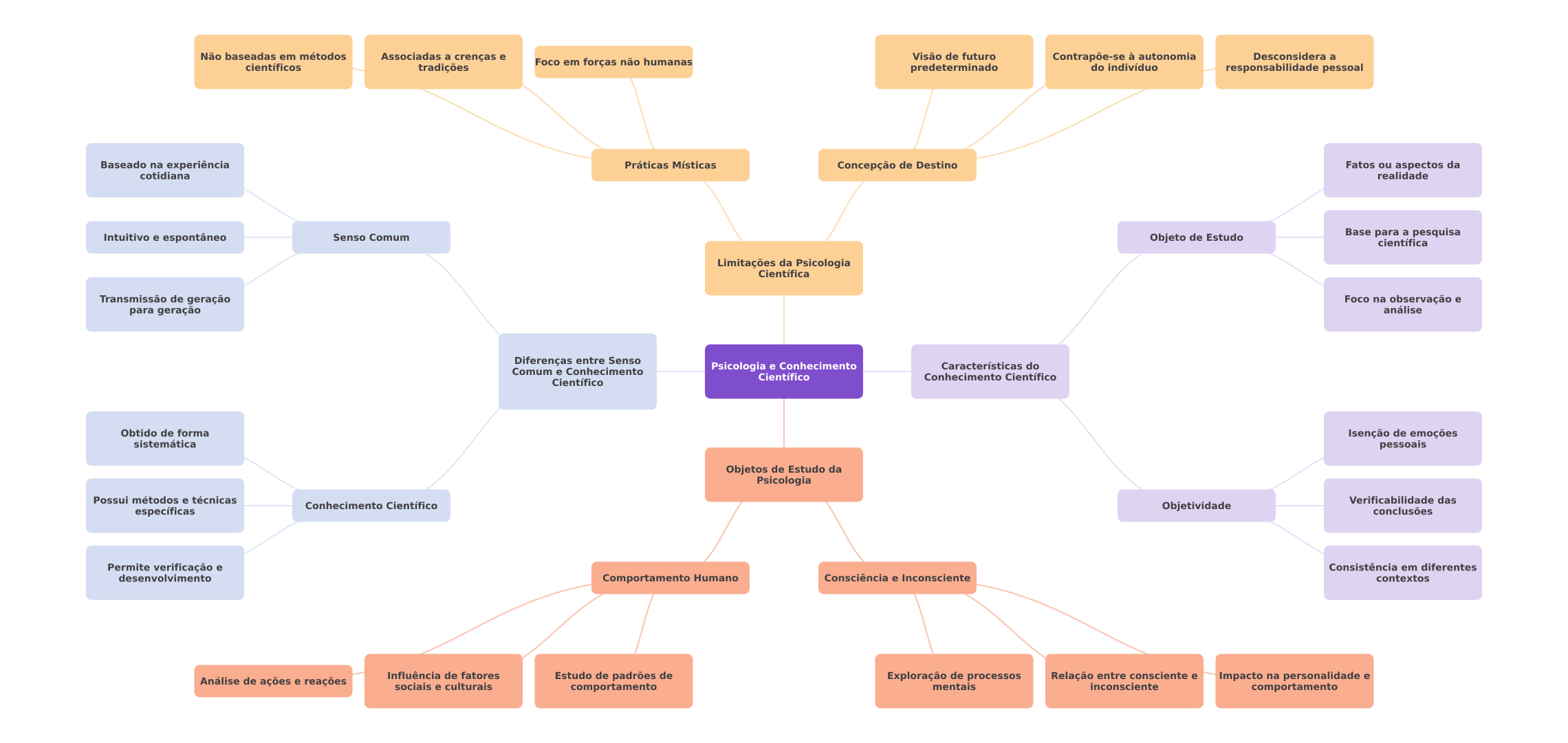 Não baseadas em métodos Associadas a crenças e Visão de futuro Contrapõe-se à autonomia Desconsidera a científicos tradições Foco em forças não humanas predeterminado do indivíduo responsabilidade pessoal Baseado na experiência Práticas Místicas Concepção de Destino Fatos ou aspectos da cotidiana realidade Intuitivo e espontâneo Senso Comum Objeto de Estudo Base para a pesquisa científica Limitações da Psicologia Científica Transmissão de geração Foco na observação e para geração análise Diferenças entre Senso Comum e Conhecimento Psicologia e Conhecimento Características do Científico Conhecimento Científico Científico Obtido de forma Isenção de emoções sistemática pessoais Objetos de Estudo da Psicologia Possui métodos e técnicas Verificabilidade das Conhecimento Científico específicas Objetividade conclusões Permite verificação e Consistência em diferentes desenvolvimento Comportamento Humano Consciência e Inconsciente contextos Influência de fatores Análise de ações e reações Estudo de padrões de Exploração de processos Relação entre consciente e Impacto na personalidade e sociais e culturais comportamento mentais inconsciente comportamento