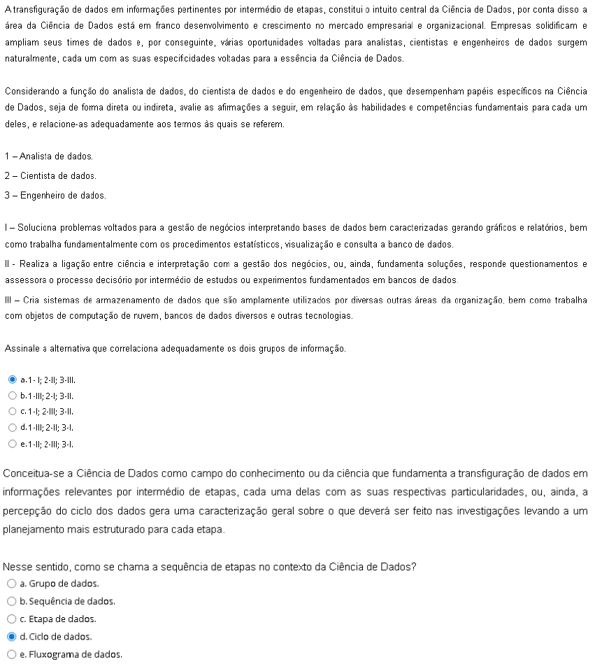 A transfiguração de dados em informações pertinentes por intermédio de etapas, constitui 0 intuito central da Ciência de Dados, por conta disso a área da Ciência de Dados está em franco desenvolvimento e crescimento no mercado empresarial e organizacional. Empresas solidificam e ampliam seus times de dados e, por conseguinte, várias oportunidades voltadas para analistas, cientistas e engenheiros de dados surgem naturalmente, cada um com as suas especificidades voltadas para a essência da Ciência de Considerando a função do analista de dados, do cientista de dados e do engenheiro de dados, que desempenham papéis específicos na Ciência de Dados, seja de forma direta ou indireta, avalie as afirmações a seguir, em relação às habilidades e competências fundamentais para cada um deles, e relacione-as adequadamente aos termos às quais se referem. 1 Analista de dados. 2 Cientista de dados. 3 Engenheiro de dados. - Soluciona problemas voltados para a gestão de negócios interpretando bases de dados bem caracterizadas gerando gráficos e relatórios, bem como trabalha fundamentalmente com procedimentos estatísticos, visualização e consulta a banco de dados. - Realiza a ligação entre ciência e interpretação com a gestão dos negócios, ou, ainda, fundamenta soluções, responde questionamentos e assessora 0 processo decisório por intermédio de estudos ou experimentos fundamentados em bancos de dados. III Cria sistemas de armazenamento de dados que são amplamente utilizados por diversas outras áreas da organização, bem como trabalha com objetos de computação de nuvem, bancos de dados diversos e outras tecnologias. Assinale a alternativa que correlaciona adequadamente dois grupos de informação. a. b. 1 d. e. Conceitua-se a Ciência de Dados como campo do conhecimento ou da ciência que fundamenta a transfiguração de dados em informações relevantes por intermédio de etapas, cada uma delas com as suas respectivas particularidades, ou, ainda, a percepção do ciclo dos dados gera uma caracterização geral sobre 0 que deverá ser feito nas investigações levando a um planejamento mais estruturado para cada etapa. Nesse sentido, como se chama a sequência de etapas no contexto da Ciência de Dados? a. Grupo de dados. b. Sequência de dados. C. Etapa de dados. d. Ciclo de dados. e. Fluxograma de dados.O uso da Ciência de Dados no contexto do mundo globalizado, consolida-se por conta da complexidade de resolução de problemas diversos, que necessitam de uma estimativa futura de tendências, comportamentos e possíveis soluções assertivas, bem como pela utilização da tecnologia. Associado a isso, temos 0 crescimento exponencial da visualização e recebimento de informações, independentemente da área da problematização abordada. Considerando a importância da Ciência de Dados e seus procedimentos que contribuem para a resolução de problemas no contexto organizacional, avalie as afirmações a seguir, em relação à fundamentação e à aplicabilidade da Ciência de Dados, e relacione-as adequadamente aos termos às quais se referem. 1 Inteligência Artificial. 2 Matemática e Computação. 3 São ferramentas específicas utilizadas pela Ciência de Dados na criação e utilização dos seus procedimentos peculiares na resolução de problemas. A Ciência de Dados fundamentalmente constitui um subconjunto da Inteligência Artificial (IA). III É a célula fundamental do processo de geração das informações relevantes no âmbito da Ciência de Dados. Assinale a alternativa que correlaciona adequadamente dois grupos de informação. a. II; b. C. 1-III; d. e. Segundo Alves (2022, p. 34), "Os números governam 0 mundo, negócios e 0 Além disso, sabe-se que dados e informações são de fundamental importância para as tomadas de decisões, independentemente do contexto estudado e trabalhado, daí a relevância da Ciência de Dados para estudos diversos de mercado. ALVES, A. F. Guia de estudos da disciplina Métodos Quantitativos Varginha: [S. 2020. Nesse contexto, a Ciência de Dados caracteriza-se como: a. a área do conhecimento que interpreta informações na sua base natural. b. a ciência que estuda 0 volume exponencial de informações. C. campo do conhecimento que busca transformar dados em informações. d. a Inteligência Artificial propriamente dita. e. a subárea da inteligência de máquina que organiza as informações.