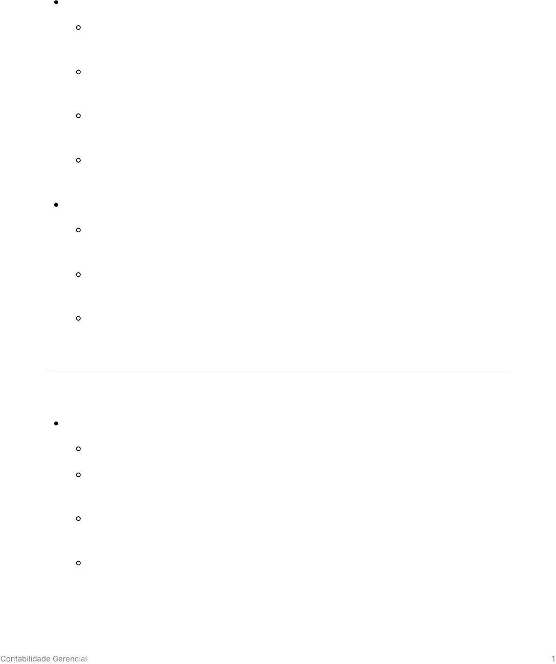 Contabilidade Gerencial O que é Contabilidade Financeira Origem e função: Nasceu na escola europeia e era chamada de Contabilidade Patrimonial. Tem como objetivo mostrar a situação patrimonial e financeira da empresa em determinado momento. Ela registra todos os fatos contábeis (compras, vendas, pagamentos, recebimentos) ao longo de um período. Ao final, elabora o Balanço Patrimonial, que é o relatório formal para mostrar a saúde financeira. Evolução anglo-saxônica: Com o crescimento dos negócios, na escola anglo-saxônica, a Contabilidade Financeira ganhou caráter mais estratégico. Serve para investidores, sócios, fornecedores, bancos, governo e outros agentes externos, ajudando-os a analisar a empresa. Ela é objetiva e sintética: os relatórios são padronizados e seguem regras legais, para garantir clareza e confiança para quem está fora da empresa. O que é Contabilidade Gerencial Definição e foco: Também chamada de Contabilidade de Gestão. Seu público-alvo são os administradores e gestores da empresa, ou seja, quem toma decisões internas. Ela não se prende às normas legais da financeira: o formato dos relatórios pode mudar conforme as necessidades da empresa. Seu foco é o curto prazo e o cenário em constante mudança: ajuda os gestores a reagirem rapidamente. Contabilidade Gerencial 1 Os relatórios podem ser semanais, mensais, trimestrais ou até diários, dependendo do negócio. Diferenças principais Financeira x Gerencial): Aspecto Contabilidade Financeira Contabilidade Gerencial Público-alvo Agentes externos (acionistas, credores). Gestores e administradores internos. Regras Rígidas e legais. Flexíveis, adaptadas às necessidades. Nível de detalhe Mais sintética e objetiva. Mais analítica e específica. Horizonte de tempo Longo prazo. Curto prazo e decisões rápidas. Visão dos estudiosos: Alguns veem a Gerencial como apenas uma extensão da Financeira. Outros afirmam que são ramos distintos, cada um com seu papel. Na prática, todos os ramos contábeis se conectam para fornecer informações úteis à tomada de decisão. Citações importantes (Marion) Contabilidade como linguagem dos negócios: “Ela coleta dados econômicos, mensura monetariamente, registra e sumariza em relatórios que ajudam na tomada de decisões. Mede resultados, avalia desempenho e dá diretrizes para decisões.ˮ Importância da informação confiável: “Aplicar recursos escassos com máxima eficiência exige informações reais. Experiência e intuição já não bastam — relatórios contábeis são essenciais para decisões sobre produção, marketing, investimentos, custos, etc.ˮ A contabilidade gerencial é como o painel de controle de um carro: mostra ao motorista (gestor) informações detalhadas e atualizadas para que ele ajuste sua rota. Já a contabilidade financeira é como o histórico de manutenção oficial: organizado e padronizado, serve para mostrar a terceiros que o carro está em boas condições. Contabilidade Gerencial 2 Relações Custo / Volume / Lucro Importância da análise custo-volume-lucro Fundamental para todos os níveis de gerência. Permite aproveitar melhor os custos, utilizando recursos de forma eficiente. Ajuda a atingir metas e objetivos de lucro da entidade. Custos e despesas ➡ Variáveis Variam proporcionalmente ao volume de produção ou atividade. Exemplos: Matéria-prima, mão de obra direta, comissões sobre vendas. ➡ Fixos Permanecem inalterados dentro de limites, independentemente das vendas. Exemplos: Salários mensalistas, depreciação, aluguéis. ➡ Semivariáveis e Semifixos Semivariáveis: Custos com parte fixa e parte variável. Exemplo: Energia elétrica (pequena parte fixa + aumento proporcional ao consumo em kWh). Semifixos: Custos que mudam em degraus. Exemplo: Supervisão de fábrica, que varia conforme a demanda. ➡ Custo de mão de obra O custo total (direta + indireta) nem sempre é proporcional ao volume, devido a: Alto custo de contratação e recrutamento. Tempo ocioso remunerado. Mão de obra direta: deveria variar conforme ordens concluídas, em número de horas. Contabilidade Gerencial 3 Frequentemente, o custo total é tratado como fixo. ➡ Características dos custos fixos Sofrem impactos de inflação e aumento de preços. Mesmo com essas variações, são conceitos contábeis muito úteis na prática. Margem de Contribuição (MC) Definição: Valor que sobra das vendas após deduzir todos os custos e despesas variáveis. Função: Cobrir custos fixos e gerar lucro. Significado do nome: Margem: Diferença entre o preço de venda e custos variáveis. Contribuição: Quanto contribui para pagar despesas fixas e gerar lucro. ➡ Fórmulas MC Receita de Vendas RV – Custos Variáveis CV. MC Unitária MC/U Preço de Venda Unitário PV/U – Custo Variável Unitário CV/U. Exemplo Empresa Alfa): RV 600.000, CV 300.000 MC 300.000. PV/U 6,00; CV/U 3,00 MC/U 3,00. Ponto de Equilíbrio (PE) a) Contábil (PEC) Volume de vendas onde Receitas Totais Custos Totais. Fórmula: PEC Custos Fixos MC Unitária. Exemplo: Custos fixos 20.000; PV 26; CV 10 MC 16. Contabilidade Gerencial 4 PEC 20.000 16 1.250 unidades. Faturamento 1.250 26 32.500. b) Financeiro (PEfin) Considera apenas desembolsos de caixa, excluindo itens sem saída imediata, como depreciação. Se houver dívidas ou amortizações, devem ser incluídas. Fórmula: PEfin = Custos Fixos Dívida, Amortização) MC. Exemplo: Dívida de R$3.000 20.000 3.000 16 1.438 unidades. c) Econômico (PEecon) Inclui uma meta de lucro ou custo de oportunidade do capital próprio. Fórmula: PEecon = Custos Fixos Custo de Oportunidade) MC. Exemplo: Custo de oportunidade de R$100.000 20.000 100.000 16 = 7.500 unidades. Análise MC x PE Usos do indicador: Identificar volume mínimo necessário para pagar despesas. Elaborar tabelas de preços e descontos. Lançar campanhas promocionais e medir impacto. Analisar concorrência e preços competitivos. Negociar