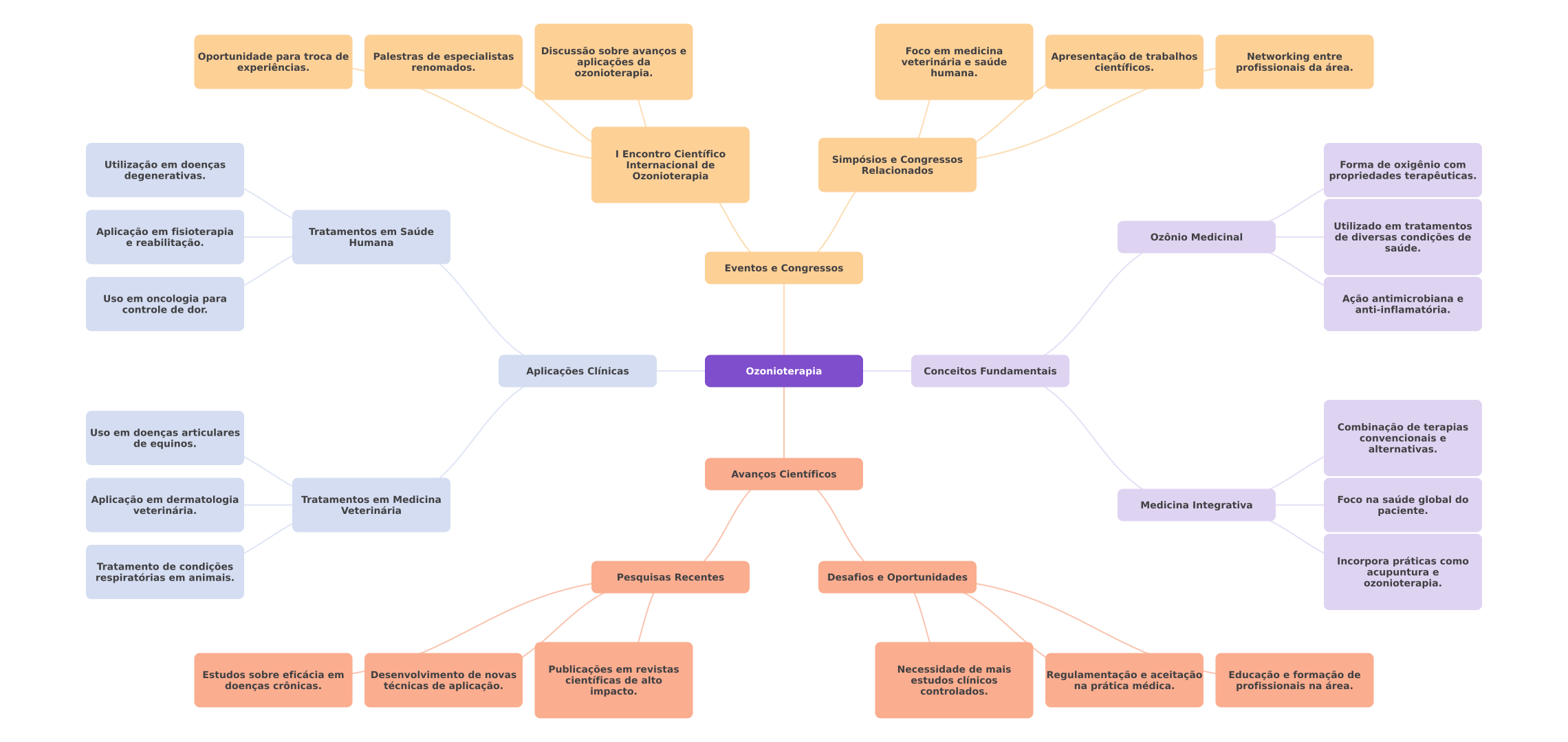Discussão sobre avanços e Foco em medicina Oportunidade para troca de Palestras de especialistas experiências. renomados. aplicações da veterinária e saúde Apresentação de trabalhos Networking entre científicos. ozonioterapia. humana. profissionais da área. I Encontro Científico Utilização em doenças Internacional de Simpósios e Congressos Relacionados Forma de oxigênio com degenerativas. Ozonioterapia propriedades terapêuticas. Utilizado em tratamentos Aplicação em fisioterapia Tratamentos em Saúde Ozônio Medicinal e reabilitação. Humana de diversas condições de saúde. Eventos e Congressos Uso em oncologia para Ação antimicrobiana e controle de dor. anti-inflamatória. Aplicações Clínicas Ozonioterapia Conceitos Fundamentais Uso em doenças articulares Combinação de terapias convencionais e de equinos. alternativas. Avanços Científicos Aplicação em dermatologia Tratamentos em Medicina veterinária. Medicina Integrativa Foco na saúde global do Veterinária paciente. Tratamento de condições Incorpora práticas como respiratórias em animais. Pesquisas Recentes Desafios e Oportunidades acupuntura e ozonioterapia. Publicações em revistas Necessidade de mais Estudos sobre eficácia em Desenvolvimento de novas científicas de alto estudos clínicos Regulamentação e aceitação Educação e formação de doenças crônicas. técnicas de aplicação. controlados. na prática médica. profissionais na área. impacto.