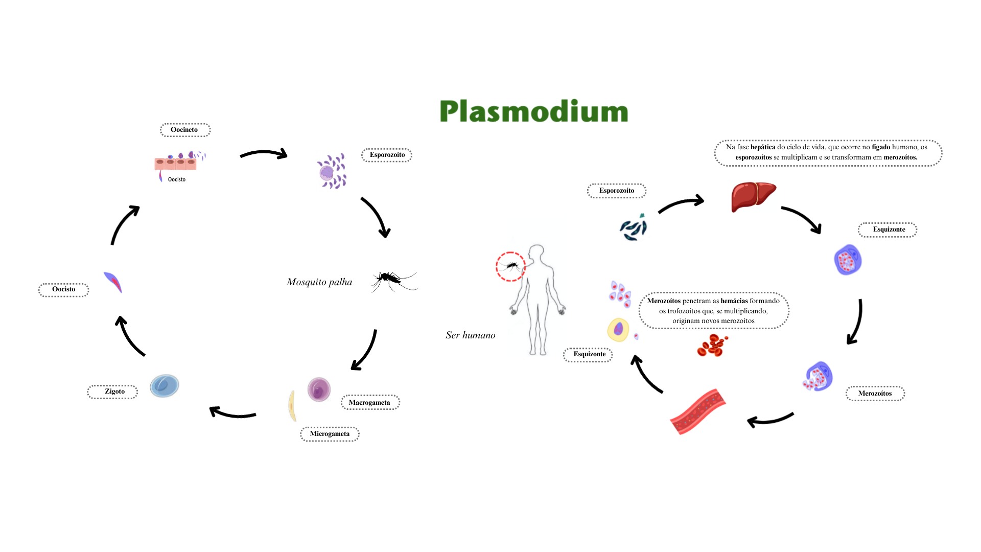 Plasmodium Oocineto Na fase hepática do ciclo de vida, que ocorre no figado humano, os esporozoitos se multiplicam e se transformam em merozoitos. Oocisto Esporozoito Esquizonte Mosquito palha Oocisto Merozoitos penetram as hemácias formando os trofozoitos que, se multiplicando, originam novos merozoitos Ser humano Esquizonte Zigoto Merozoitos Macrogameta Microgameta