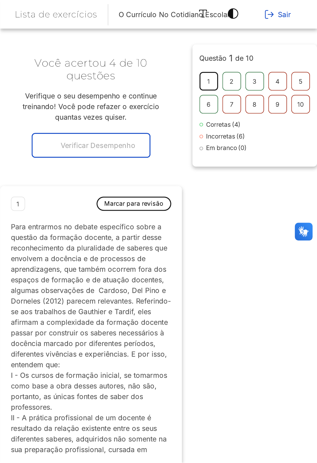 15/08/2025 15:42 https://estacio.saladeavaliacoes.com.br/exercicio/689f7f6a4336d83bcafb5e73/gabarito/ https://estacio.saladeavaliacoes.com.br/exercicio/689f7f6a4336d83bcafb5e73/gabarito/ 1/16 Você acertou 4 de 10 questões Verifique o seu desempenho e continue treinando! Você pode refazer o exercício quantas vezes quiser. Verificar Desempenho 1 Marcar para revisão Para entrarmos no debate específico sobre a questão da formação docente, a partir desse reconhecimento da pluralidade de saberes que envolvem a docência e de processos de aprendizagens, que também ocorrem fora dos espaços de formação e de atuação docentes, algumas observações de Cardoso, Del Pino e Dorneles �2012) parecem relevantes. Referindo- se aos trabalhos de Gauthier e Tardif, eles afirmam a complexidade da formação docente passar por construir os saberes necessários à docência marcado por diferentes períodos, diferentes vivências e experiências. E por isso, entendem que: I � Os cursos de formação inicial, se tomarmos como base a obra desses autores, não são, portanto, as únicas fontes de saber dos professores. II � A prática profissional de um docente é resultado da relação existente entre os seus diferentes saberes, adquiridos não somente na sua preparação profissional, cursada em Questão 1 de 10 Corretas �4� Incorretas �6� Em branco �0� 1 2 3 4 5 6 7 8 9 10 Lista de exercícios O Currículo No Cotidiano Escolar Sair 15/08/2025 15:42 https://estacio.saladeavaliacoes.com.br/exercicio/689f7f6a4336d83bcafb5e73/gabarito/ https://estacio.saladeavaliacoes.com.br/exercicio/689f7f6a4336d83bcafb5e73/gabarito/ 2/16 A B C D E instituições destinadas à formação de professores. III � Os saberes dos professores são, da mesma forma, resultantes dos conhecimentos e ensinamentos aprendidos na sua vida familiar e social, no decorrer de sua trajetória escolar como aluno, no seu próprio lugar de trabalho, por meio das relações estabelecidas com alunos e colegas de profissão. Estão corretas as afirmativas: I e II somente I e III somente II e III somente I, II e III estão corretas. Apenas I está correta Resposta correta Parabéns, você selecionou a alternativa correta. Confira o gabarito comentado! Gabarito Comentado Os autores Cardoso, Del Pino e Dorneles �2012) defendem a ideia de que a formação docente é um processo complexo que vai além da formação inicial. Eles argumentam que os saberes dos professores são construídos a partir de uma variedade de experiências e vivências, que incluem, mas não se limitam à formação acadêmica. A prática 15/08/2025 15:42 https://estacio.saladeavaliacoes.com.br/exercicio/689f7f6a4336d83bcafb5e73/gabarito/ https://estacio.saladeavaliacoes.com.br/exercicio/689f7f6a4336d83bcafb5e73/gabarito/ 3/16 A B C profissional do docente é influenciada por uma combinação de conhecimentos adquiridos em diferentes contextos, incluindo a vida familiar e social, a trajetória escolar como aluno e as interações no local de trabalho. Portanto, todas as afirmativas estão corretas, pois refletem essa visão abrangente e multifacetada da formação docente. 2 Marcar para revisão Muitos consideraram que o modo de pesquisar currículo era mais uma forma de reproduzir a lógica do ideário metodológico moderno, em que sujeito e objeto de pesquisa deveriam se manter distanciados. No entanto, buscava-se exatamente o contrário: uma aproximação entre sujeitos e objeto. Por este motivo, metodologicamente, as pesquisas nos/dos/com os cotidianos passaram a incorporar a ideia de ¿mergulho¿ nos cotidianos �ALVES, 2001�, em que o pesquisador deveria mergulhar no: currículo por projetos como forma solução para educação. na segregação entre o que é papel dos governos e papel da escola. na separação entre a ciência da educação e prática educacional. 15/08/2025 15:42 https://estacio.saladeavaliacoes.com.br/exercicio/689f7f6a4336d83bcafb5e73/gabarito/ https://estacio.saladeavaliacoes.com.br/exercicio/689f7f6a4336d83bcafb5e73/gabarito/ 4/16 D E no ambiente de pesquisa, de modo a conseguir compreender suas peculiaridades, para além do que ela se mostra na superfície. na exclusividade das experiências discentes rompendo com as formulações de currículo de forma institucional. Resposta correta Parabéns, você selecionou a alternativa correta. Confira o gabarito comentado! Gabarito Comentado Esse movimento de pensar a pesquisa em currículo é chamada de cotidianistas, representado na questão pela professora Nilda Alves. Assim, pode-se dizer que, para os cotidianistas, a realidade é entendida, por meio da possibilidade de pesquisá-la com finalidade acadêmica, para além dos seus elementos quantitativos e de inspiração formal, e a partir de ¿uma atitude orientada para a análise de casos individuais, reconstruíveis somente através de pistas, sintomas, indício. 3 Marcar para revisão É particularmente importante compreender a influência dos diferentes cenários escolares sobre os currículos quando o tema a abordar são as diferentes modalidades de educação, já 15/08/2025 15:42 https://estacio.saladeavaliacoes.com.br/exercicio/689f7f6a4336d83bcafb5e73/gabarito/ https://estacio.saladeavaliacoes.com.br/exercicio/689f7f6a4336d83bcafb5e73/gabarito/ 5/16 A B C D E que as especificidades delas aparecem desde a legislação até cada uma das realidades escolares nas quais cada modalidade é localmente implementada. Assim sendo, para estudar esses currículos, é: I. Preciso nos debruçarmos sobre diferentes modalidades de educação, suas especificidades e exigências, além de percebermos que as diferenças, adaptações, alterações e configurações variam, também, no interior de cada modalidade, de cada espaço educativo. II. Vamos estudar os currículos por projetos, já que na origem desses está a preocupação com a adequação do trabalho pedagógico à realidade de cada escola, ou seja, com a construção de u