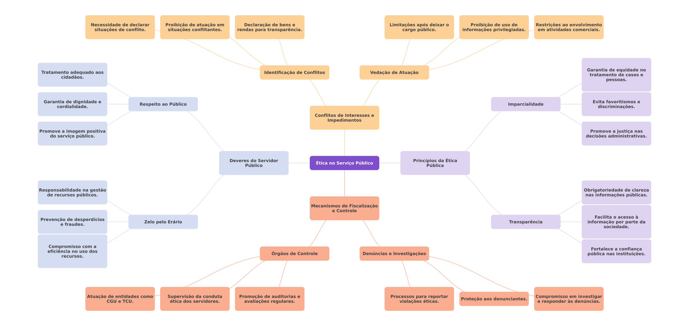 Necessidade de declarar Proibição de atuação em Declaração de bens e Limitações após deixar Proibição de uso de Restrições ao envolvimento situações de conflito. situações conflitantes. rendas para transparência. cargo público. informações privilegiadas. em atividades comerciais. Garantia de equidade no Tratamento adequado aos Identificação de Conflitos Vedação de Atuação tratamento de casos e cidadãos. pessoas. Garantia de dignidade e Evita favoritismos e cordialidade. Respeito ao Público Imparcialidade discriminações. Conflitos de Interesses e Impedimentos Promove a imagem positiva Promove a justiça nas do serviço público. decisões administrativas. Deveres do Servidor Ética no Serviço Público Princípios da Ética Público Pública Responsabilidade na gestão Obrigatoriedade de clareza de recursos públicos. nas informações públicas. Mecanismos de Fiscalização e Controle Facilita acesso à Prevenção de desperdícios e fraudes. Zelo pelo Erário Transparência informação por parte da sociedade. Compromisso com a eficiência no uso dos Fortalece a confiança Órgãos de Controle Denúncias e Investigações pública nas instituições. recursos. Atuação de entidades como Supervisão da conduta Promoção de auditorias e Processos para reportar CGU TCU. ética dos servidores. avaliações regulares. violações éticas. Proteção aos denunciantes. Compromisso em investigar e responder às denúncias.