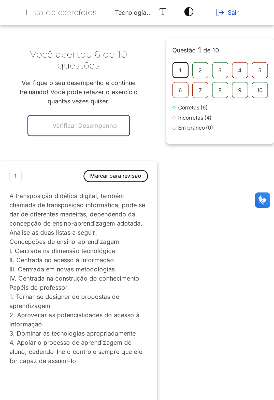 25/08/2025 17:50 https://estacio.saladeavaliacoes.com.br/exercicio/68accc3f7c9b235dfbabff9d/gabarito/ https://estacio.saladeavaliacoes.com.br/exercicio/68accc3f7c9b235dfbabff9d/gabarito/ 1/16 Você acertou 6 de 10 questões Verifique o seu desempenho e continue treinando! Você pode refazer o exercício quantas vezes quiser. Verificar Desempenho 1 Marcar para revisão A transposição didática digital, também chamada de transposição informática, pode se dar de diferentes maneiras, dependendo da concepção de ensino-aprendizagem adotada. Analise as duas listas a seguir: Concepções de ensino-aprendizagem I. Centrada na dimensão tecnológica II. Centrada no acesso à informação III. Centrada em novas metodologias IV. Centrada na construção do conhecimento Papéis do professor 1. Tornar-se designer de propostas de aprendizagem 2. Aproveitar as potencialidades do acesso à informação 3. Dominar as tecnologias apropriadamente 4. Apoiar o processo de aprendizagem do aluno, cedendo-lhe o controle sempre que ele for capaz de assumi-lo Questão 1 de 10 Corretas �6� Incorretas �4� Em branco �0� 1 2 3 4 5 6 7 8 9 10 Lista de exercícios Tecnologia… Sair 25/08/2025 17:50 https://estacio.saladeavaliacoes.com.br/exercicio/68accc3f7c9b235dfbabff9d/gabarito/ https://estacio.saladeavaliacoes.com.br/exercicio/68accc3f7c9b235dfbabff9d/gabarito/ 2/16 A B C D E Agora assinale a relação correta entre as concepções de ensino-aprendizagem e o papel do professor: I�D; II�C; III�B; IV�A I�C; II�B; III�A; IV�D I�B; II�A; III�D; IV�C I�B; II�C; III�A; IV�D I�A; II�B; III�C; IV�D Resposta correta Parabéns, você selecionou a alternativa correta. Confira o gabarito comentado! Gabarito Comentado A alternativa correta é a B, que estabelece a seguinte relação entre as concepções de ensino-aprendizagem e o papel do professor: I�C, II�B, III�A, IV�D. Isso significa que a concepção de ensino- aprendizagem centrada na dimensão tecnológica requer que o professor domine as tecnologias apropriadamente �I�C�. A concepção centrada no acesso à informação implica que o professor deve aproveitar as potencialidades do acesso à informação �II�B�. A concepção centrada em novas metodologias requer que o professor se torne um designer de propostas de aprendizagem �III�A�. Por fim, a concepção centrada na construção do 25/08/2025 17:50 https://estacio.saladeavaliacoes.com.br/exercicio/68accc3f7c9b235dfbabff9d/gabarito/ https://estacio.saladeavaliacoes.com.br/exercicio/68accc3f7c9b235dfbabff9d/gabarito/ 3/16 A B C D E conhecimento implica que o professor deve apoiar o processo de aprendizagem do aluno, cedendo-lhe o controle sempre que ele for capaz de assumi-lo �IV�D�. 2 Marcar para revisão Em um mundo cada vez mais midiático, que nos bombardeia com informações constantemente, é natural que, em consequência disso, surja uma demanda por competências também midiáticas e informacionais. Dentre as alternativas a seguir, qual corresponde a uma prática de curadoria relacionada à aprendizagem baseada em problemas? Buscar materiais que abordem soluções para necessidades específicas Selecionar casos reais ou adaptados Participar da monitoria ou condução de oficinas Organizar portfólios individuais ou coletivos Desenvolver a formação básica em informática nos alunos Resposta correta 25/08/2025 17:50 https://estacio.saladeavaliacoes.com.br/exercicio/68accc3f7c9b235dfbabff9d/gabarito/ https://estacio.saladeavaliacoes.com.br/exercicio/68accc3f7c9b235dfbabff9d/gabarito/ 4/16 Parabéns, você selecionou a alternativa correta. Confira o gabarito comentado! Gabarito Comentado A alternativa correta é "Buscar materiais que abordem soluções para necessidades específicas". Isso porque a aprendizagem baseada em problemas envolve a identificação de um problema e a busca por soluções. Nesse contexto, a prática de curadoria se refere à seleção e organização de materiais que possam auxiliar na resolução do problema identificado, atendendo assim a necessidades específicas. Portanto, a prática de curadoria mais adequada para a aprendizagem baseada em problemas é a busca por materiais que ofereçam soluções para as necessidades específicas identificadas. 3 Marcar para revisão No âmbito da tecnologia digital, especialmente quando se relaciona à transposição didática, muitos conceitos foram criados ou adaptados à realidade midiática em que vivemos. Um desses conceitos é o de noosfera, criado a partir das ideias de Yves Chevallard. A noosfera é formada pelo(a): 25/08/2025 17:50 https://estacio.saladeavaliacoes.com.br/exercicio/68accc3f7c9b235dfbabff9d/gabarito/ https://estacio.saladeavaliacoes.com.br/exercicio/68accc3f7c9b235dfbabff9d/gabarito/ 5/16 A B C D E Grupo de disciplinas escolares que compõe o saber científico, acrescido da metodologia e dos procedimentos para seu ensino Comunidades de pais, funcionários, professores, diretores, alunos, sistemas da avaliação, políticas públicas educacionais que de alguma forma influenciam as transformações sofridas pelo saber sábio Conjunto de conhecimentos, habilidades e atitudes que permitem caracterizar alguém como uma pessoa alfabetizada ou letrada informacionalmente Continuum de suportes informacionais e midiáticos que caracteriza a alfabetização midiática e informacional, englobando desde a decodificação de uma palavra até a leitura e interpretação completa de uma obra Conjunto de estratégias pedagógicas desenvolvidas pelo docente a fim de possibilitar aos seus alunos melhor compreensão do conteúdo apresentado Resposta correta Parabéns, você selecionou a alternativa correta. Confira o gabarito comentado! 25/08/2025 17:50 https://estacio.saladeavaliacoes.com.br/exercicio/68accc3f7c9b235dfbabff9d/gabarito/ https://estacio.saladeavaliacoes.com.br/exercicio/68accc3f7c9b235dfbabff9d/gabarito/ 6/16 Gabarito Comentado O conc