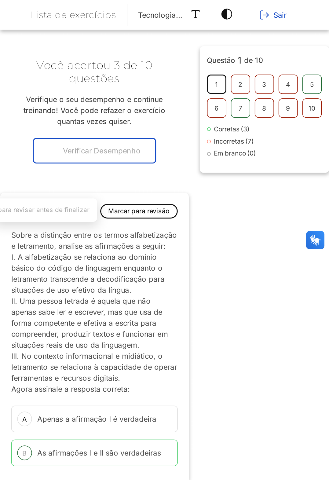 25/08/2025 17:52 https://estacio.saladeavaliacoes.com.br/exercicio/68acccbb4336d83bca06f486/gabarito/ https://estacio.saladeavaliacoes.com.br/exercicio/68acccbb4336d83bca06f486/gabarito/ 1/16 Você acertou 3 de 10 questões Verifique o seu desempenho e continue treinando! Você pode refazer o exercício quantas vezes quiser. Verificar Desempenho A B 1 Marcar para revisãopara revisar antes de finalizar Sobre a distinção entre os termos alfabetização e letramento, analise as afirmações a seguir: I. A alfabetização se relaciona ao domínio básico do código de linguagem enquanto o letramento transcende a decodificação para situações de uso efetivo da língua. II. Uma pessoa letrada é aquela que não apenas sabe ler e escrever, mas que usa de forma competente e efetiva a escrita para compreender, produzir textos e funcionar em situações reais de uso da linguagem. III. No contexto informacional e midiático, o letramento se relaciona à capacidade de operar ferramentas e recursos digitais. Agora assinale a resposta correta: Apenas a afirmação I é verdadeira As afirmações I e II são verdadeiras Questão 1 de 10 Corretas �3� Incorretas �7� Em branco �0� 1 2 3 4 5 6 7 8 9 10 Lista de exercícios Tecnologia… Sair 25/08/2025 17:52 https://estacio.saladeavaliacoes.com.br/exercicio/68acccbb4336d83bca06f486/gabarito/ https://estacio.saladeavaliacoes.com.br/exercicio/68acccbb4336d83bca06f486/gabarito/ 2/16 C D E As afirmações II e III são verdadeiras Apenas a afirmação III é verdadeira Apenas II é falsa Resposta correta Parabéns, você selecionou a alternativa correta. Confira o gabarito comentado! Gabarito Comentado As afirmações I e II são verdadeiras. A alfabetização está relacionada ao domínio básico do código de linguagem, ou seja, a habilidade de ler e escrever. Já o letramento vai além disso, envolvendo a capacidade de usar a escrita de forma competente e efetiva para compreender e produzir textos, bem como para funcionar em situações reais de uso da linguagem. Portanto, uma pessoa letrada não apenas sabe ler e escrever, mas também sabe usar essas habilidades de maneira eficaz em diferentes contextos. 2 Marcar para revisão Cada vez mais ouviremos falar em curadoria, no âmbito das tecnologias digitais e sua relação com o processo educativo. Porém, a curadoria não é uma competência de característica única e pode oferecer diversas possibilidades a tal processo. 25/08/2025 17:52 https://estacio.saladeavaliacoes.com.br/exercicio/68acccbb4336d83bca06f486/gabarito/ https://estacio.saladeavaliacoes.com.br/exercicio/68acccbb4336d83bca06f486/gabarito/ 3/16 A B C D E Portanto, com respeito ao modelo mash-up (mistura) de curadoria, assinale a seguir a alternativa correta: Trata-se de uma técnica de simplificação dos conteúdos curados Refere-se à organização temporal dos conteúdos em uma linha do tempo Tem por objetivo a fusão de conteúdos existentes para criar um novo ponto de vista. Consiste em exibir em único local as informações mais relevantes sobre um tema Tem por estratégia recontar a história por meio de materiais informativos que existem ao longo do tempo Resposta incorreta Opa! A alternativa correta é a letra C. Confira o gabarito comentado! Gabarito Comentado O modelo mash-up de curadoria, como o próprio nome sugere, é uma mistura. Ele tem como objetivo a fusão de conteúdos existentes para criar um novo ponto de vista. Isso significa que, em vez de apenas coletar e organizar informações, o curador neste modelo busca combinar diferentes conteúdos de uma maneira que resulte em uma nova perspectiva ou interpretação. Portanto, a alternativa correta é: "Tem por 25/08/2025 17:52 https://estacio.saladeavaliacoes.com.br/exercicio/68acccbb4336d83bca06f486/gabarito/ https://estacio.saladeavaliacoes.com.br/exercicio/68acccbb4336d83bca06f486/gabarito/ 4/16 A B C D E objetivo a fusão de conteúdos existentes para criar um novo ponto de vista". 3 Marcar para revisão A curadoria tem sido uma possibilidade de responder às demandas atuais, no campo da aprendizagem e suas interfaces com as tecnologias digitais. Mas exatamente pela variedade dessas tecnologias e consequente variedade de competências exigidas para respondê-las, encontramos a curadoria em diversos âmbitos. Assim, cabe à curadoria de conteúdo: I � Adicionar mais conteúdo ao oceano de informações disponível na Web II � Ajudar a dar sentido às informações disponibilizadas na Web III � Auxiliar no acesso às tecnologias de informação e comunicação �TICs� IV � Propor atividades de aprendizagem centradas na transmissão das informações Das afirmativas acima: Somente I está incorreta. Somente II está correta Somente III está incorreta I e IV estão corretas II e III estão incorretas 25/08/2025 17:52 https://estacio.saladeavaliacoes.com.br/exercicio/68acccbb4336d83bca06f486/gabarito/ https://estacio.saladeavaliacoes.com.br/exercicio/68acccbb4336d83bca06f486/gabarito/ 5/16 Resposta incorreta Opa! A alternativa correta é a letra A. Confira o gabarito comentado! Gabarito Comentado A alternativa correta é a que afirma que "Somente I está incorreta". A curadoria de conteúdo não tem como objetivo adicionar mais conteúdo ao oceano de informações disponível na Web, mas sim selecionar, organizar e apresentar informações relevantes de forma a facilitar o acesso e a compreensão dos usuários. As demais afirmativas estão corretas, pois a curadoria de conteúdo ajuda a dar sentido às informações disponibilizadas na Web, auxilia no acesso às tecnologias de informação e comunicação �TICs� e propõe atividades de aprendizagem centradas na transmissão das informações. 4 Marcar para revisão A curadoria é uma das respostas que surgiram no contexto da demanda de competências midiáticas e informacionais. Embora possamos falar em curadoria em diversos âmbitos, no âmbito educacional ela tem sido cada vez mais present
