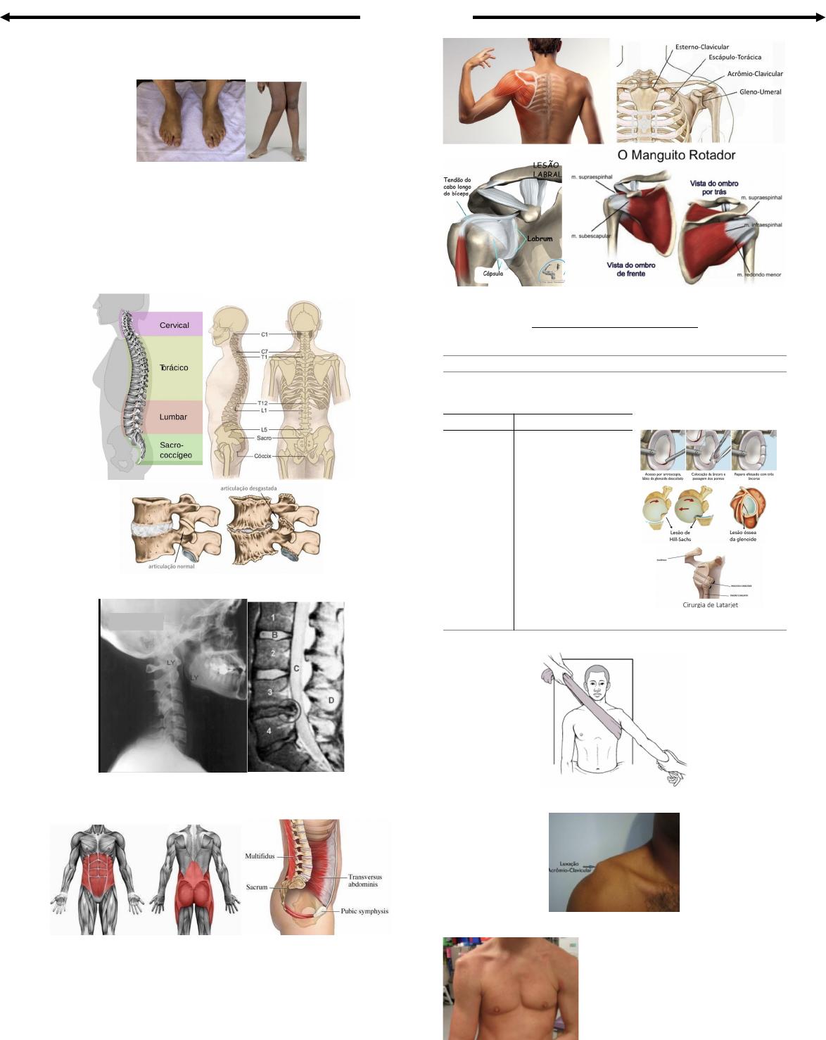 Anatomia do aparelho locomotor Introdução Diagnóstico: Inspeção estática: Comparar os lados (simetria) Dinâmica; Palpação; Teste especiais. Estruturas: Coluna: Discopatias: Core: Músculos abdominais, região lombar, pelve e quadril. Ombros: · Função: levar a mão Instabilidade x Degenerativo: Instabilidade: Instabilidade Glenoumeral: Instabilidade Anterior Traumática É a incapacidade dos estabilizadores estáticos e dinâmicos de manter a cabeça umeral centrada na glenóide; Episódio inicial traumático; Unilateral; Lesão de Bankart; Geralmente cirúrgico. Traumático: Atraumático: Competência dos estabilizadores que, num trauma são lesadores levando a luxações recorrentes; Incompetência dos estabilizadores conseguindo o paciente luxar espontaneamente sem um episódio inicial traumático. Luxação sem trauma importante; Multiligamentar; Bilateral; O paciente luxa e reduz sozinho; Responde a reabilitação; Não tem bom resultado com cirurgia. · Manobras de Redução: para luxação Sinal da tecla: Sinal da dragona: Degenerativo: Rotura do Manguito Rotador: Definição: Tem componente degenerativo geralmente com um desencadeante traumático; Pode ter fatores extrínsecos como artrose acromioclavicular e formato curvo do acrômio. Epidemiologia: > 40 anos; Quadro Clínico: Dor na elevação (ppte arco do supra); Dor noturna; Dor na rotação interna; Perda de força. EF: testes provocativos de Neer, Howkins; Testes deficitários de Jobe, Patte, Speed Imagem: RX: pode mostrar elevação da cabeça nos casos mais avançados; USG: bom e barato. Examinador dependente; RM: padrão ouro. Bom para planejar cirurgia. Tratamento: Fisioterapia (3 a 4 meses): impactos e lesões parciais; Corticoides; Cirurgia (na falha do conservador); · Em roturas totais em pacientes 70 anos: tendência conservadora pela menor demanda; · > 80 anos: lesão do manguito como parte do envelhecimento esperada. Articulações: junção entre 1 ou + ossos. Mobilidade ativa: paciente fazendo o movimento sozinho; Passiva: você fazendo o movimento; Cotovelo: É uma articulação tipo uma chave inglesa · Extensão (0° ou 180°); · Flexão (150° a 160°); · Pronação (90°); · Supinação (90°). Sujeito a muita tendinite e Epicondilite lateral Teste Mill Epicondilite Lateral Mão: Motricidade: · Nervo mediado = movimento de pinça; · Nervo do radio = sinal de joia; · Nervo ulnar. Zonas de sensibilidade: Síndrome do turno do carpo: parestesia noturna e dor na mão · Teste – tinel e phalen. Phalen Tinel Punho: · Flexão palmar (90°); · Extensão dorsal ou dorsiflexão (70°); · Desvio lateral ou radial ou adução (20°); · Desvio cubital ou medial ou abdução (30°). Quadril: Antigravitacionais: Teste de Thomas: Trendelemburg: Patologias: Bursite trocanteriana: Síndromes glúteas - Dores miofasciais Articulações Sacroilíacas: Gaenslen Patrick Fabere Osteoartrose do quadril: Classificação: primária ou secundária; · Primária: 50 a 80 anos (comum em lombar e joelho); · Secundária: pega mias jovens. Sequela de Perthes, LCQ, EFP, Osteonecrose, Traumas. Características: Início insidioso e piora progressiva de dor e desconforto articular. Ritmo mecânico (quando caminha dói); Fatores de risco: atrofia da musculatura (quadríceps e glúteos), obesidade, atividade ocupacional, trauma repetido mínimo de repetição, fatores nutricionais, história familiar. Quadro clínico: Dor tipo mecânica inguinal ou na face medial da coxa; Limitação da ADM, principalmente abdução e rotação interna; Dor na caminhada mais longa, sentar-se em local baixo, calçar sapatos, subir degraus; Diminuição de força e hipotrofia muscular; Marcha claudicante (Diminuição de força e hipotrofia muscular); Pode haver trendelemburg por fraqueza do GM; A dor pode ser irradiada para a coxa e o joelho (cuidado, diferencial). Imagem: Tratamento: mudanças de hábitos de vida Perda de peso; Fortalecimento muscular (bicicleta); AINH, corticoides; Uso de bengala; Protetores condrais: UCII, colágeno hidrolisado, glicosamina/condroitina; Viscosuplementação com ácido hialurônico; Cirurgias: artroplastia. Osteonecrose do Quadril: Epidemiologia: Adultos jovens de 30 a 50 anos; Queixa clínica: Dor no quadril na carga (mecânica); Dor no quadril na mobilização; Teste: Posição antálgica (teste de Thomas +). Associação: uso crônico de corticoides, insuficiência renal, abuso de álcool. Exame de imagem: Rx: aparece alterações na cabeça femoral com as semanas; Cintilografia: detecta precocemente, mas não é específica; RM: é o padrão ouro de detecção precoce (1 a 3 dias); CT: pode ajudar a ver a extensão do dano da cabeça femoral. Tratamento: Retirada de carga e fisioterapia; Descompressão; Anti reabsortivos (bisfosfonados); Prótese do quadril. Osteoporose: Epidemiologia: Lugar de muita fratura – comum em jovem (criança) e idoso; Fraturas definidoras de osteoporose: 1. Fratura do punho 2. Do unho proximal 3. Do quadril 4. Colo do fêmur. Tratamento: Suplementação de Ca++ Reposição de Vitamina D; Suplementação de magnésio e vitamina K2; Exercícios resistidos e de carga; Tratamento da sarcopenia; Anti reabsortivos (bisfosfonados, denosumabe); Formadores de osso (análogos do PTH, teriparatida). Sarcopenia: Tratamento: Exercícios Resistidos; Suplementação protéica; Suplementação hormonal. Músculos Biarticulares: Teste de Ely: Joelho: Sinal da baioneta Ligamentos colaterais: Comum lesões na prática esportiva; Comum lesões nos stress em varo e valgo; Geralmente são de tratamento conservador, com potencial de cicatrização em 6 a 8 semanas; Usa-se órteses, muletas, bengalas e restrição parcial da atividade. Valgo X Varo: Valgo: Varo: Trauma: Mecanismo de trauma Entorse no pé de apoio;70% sem contato; 30% com contato; 50% associação com lesão meniscal. Impotência imediata; Hemartrose precoce; Estalo; Lesão do LCA (Ligamento Cruzado anterior) 70% na prática 