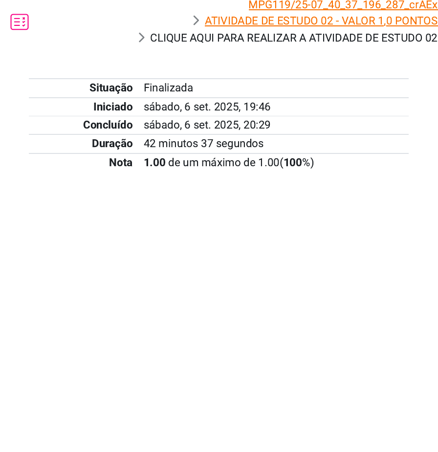 MPG119/25-07_40_37_196_287_crAEx 〉 ATIVIDADE DE ESTUDO 02 - VALOR 1,0 PONTOS 〉 CLIQUE AQUI PARA REALIZAR A ATIVIDADE DE ESTUDO 02 Situação Finalizada Iniciado sábado, 6 set. 2025, 19:46 Concluído sábado, 6 set. 2025, 20:29 Duração 42 minutos 37 segundos Nota 1.00 de um máximo de 1.00(100%) https://moodleposead.unifatecie.edu.br/course/view.php?id=5818 https://moodleposead.unifatecie.edu.br/course/section.php?id=65551 Questão 1 Correto Atingiu 0.10 de 0.10 Como já vimos, o Plano de negócios (Business Plan), também chamado de "plano empresarial", é um documento que especifica, em linguagem escrita, um negócio que se quer iniciar ou que já está iniciado. Assinale a alternativa correta de um plano de negocio segundo o Sebrae. Escolha uma opção: a. Segundo o Sebrae, um plano de negócio é um documento que descreve por escrito os objetivos de um negócio e quais passos devem ser dados para que esses objetivos sejam alcançados, diminuindo os riscos e as incertezas. b. Segundo o Sebrae o plano de negócios é um conjunto de dados e informações sobre o futuro empreendimento, que define as suas principais características para proporcionar uma análise da sua viabilidade bem como de seus riscos. Um pequeno check list para não permitir que nada seja esquecido. c. Segundo o Sebrae plano de negocio é um plano de como o empreendedor pode atingir seu objetivo tendo como comparativo um determinado período anterior que não ultrapasse cinco anos. d. Segundo o Sebrae plano de negocio é um documento elaborado em cartório de registro para obtenção de um certificado de carreira. e. Segundo o Sebrae, um plano de negócio é um documento que descreve por escrito os objetivos de um negócio, assim como todos os pontos fortes e pontos fracos desse negócio, visando não o lucro da empresa mais a plena satisfação do cliente. Sua resposta está correta. A resposta correta é: Segundo o Sebrae, um plano de negócio é um documento que descreve por escrito os objetivos de um negócio e quais passos devem ser dados para que esses objetivos sejam alcançados, diminuindo os riscos e as incertezas. Questão 2 Correto Atingiu 0.10 de 0.10 Estamos sempre buscando uma qualidade de vida melhor. A decisão de tocar seu próprio negócio deve ser clara. De início, é sua a decisão principal e é importante ter criatividade, organização e muita informação sobre as possibilidades existentes. Assinale abaixo a alternativa correspondente para desenvolver técnicas de criatividade: I. A técnica de tempestade de ideias (brainstorm). II. Potenciar o surgimento de ideias. III. Estimular o lado criativo do cérebro. IV. Relaxar e meditar. Fazer coisas fora do contexto, ser criativo. Escolha uma opção: a. I, II, III, IV e V b. Somente II, III e IV c. Somente I, IV e V d. Somente I, II, III e IV e. Somente I, II e V Sua resposta está correta. A resposta correta é: I, II, III, IV e V Questão 3 Correto Atingiu 0.10 de 0.10 Para Dornelas (2005), a necessidade de criação de um plano de negócios advém da necessidade do empreendedor de planejar suas ações e delinear as estratégias da empresa a ser criada. Porém, é utilizado também como instrumento de captação de recursos financeiros junto as entidades responsáveis. Dornelas (2005), expõe seis principais motivos para se preparar um planos de negócios, que são: I) Entender e estabelecer diretrizes para seu negócio. II) Gerenciar de forma mais eficaz a empresa e tomar decisões acertadas. III) Monitorar o dia-a-dia da empresa e tomar ações corretivas quando necessário. IV) Conseguir financiamento e recursos junto a bancos, governos, SEBRAE, investidores, capitalistas de risco etc. V) Estabelecer uma comunicação externa com os clientes para saber a opinião de quem ira adquirir o produto. Estão corretas: Escolha uma opção: a. somente I, III, V e IV b. somente I, II e V c. somente II, III, IV e V d. somente I, II, III e IV e. I, II, III, IV e V Sua resposta está correta. A resposta correta é: somente I, II, III e IV Questão 4 Correto Atingiu 0.10 de 0.10 O SEBRAE, é um serviço social autônomo brasileiro, parte integrante do Sistema “S” que objetiva auxiliar o desenvolvimento de micro e pequenas empresas, estimulando o empreendedorismo no país. Para auxiliar esse desenvolvimento, o SEBRAE disponibiliza um modelo de Plano de Negócios, um dos mais utilizados entre os existentes, que pode ser utilizado por qualquer tipo de empreendedor, e Chiavenato (2006, p.123) explica quais são os passos para o desenvolvimento de um plano de negócios. Sobre o Plano estratégico, é correto afirmar que: Escolha uma opção: a. É onde estão o que e como é produzido, ciclo de vida, fatores tecnológicos envolvidos, pesquisa e desenvolvimento, principais clientes atuais, se detém marca e/ou patente de algum produto etc. b. Informações de como se pretende vender seu produto/serviço e conquistar seus clientes, manter o interesse dos mesmos e aumentar a demanda. c. Busca, através de uma pesquisa de mercado, demonstrar como está segmentado o seu produto às características do consumidor, análise da concorrência, a sua participação de mercado, os riscos do negócio etc. d. Coloca em perspectiva a definição da missão, visão e dos valores da empresa, a definição do negócio, a determinação dos objetivos de longo prazo e o estabelecimento da estratégia do negócio. e. Contém seu histórico, crescimento/faturamento dos últimos anos, sua razão social, impostos, estrutura organizacional, localização, parcerias, etc.. Se não tiver estas informações, deve fornecer uma estimativa. Sua resposta está correta. A resposta correta é: Coloca em perspectiva a definição da missão, visão e dos valores da empresa, a definição do negócio, a determinação dos objetivos de longo prazo e o estabelecimento da estratégia do negócio. Questão 5 Correto Atingiu 0.10 de 0.10 Em se tratando de processos inovadores, alguns pro