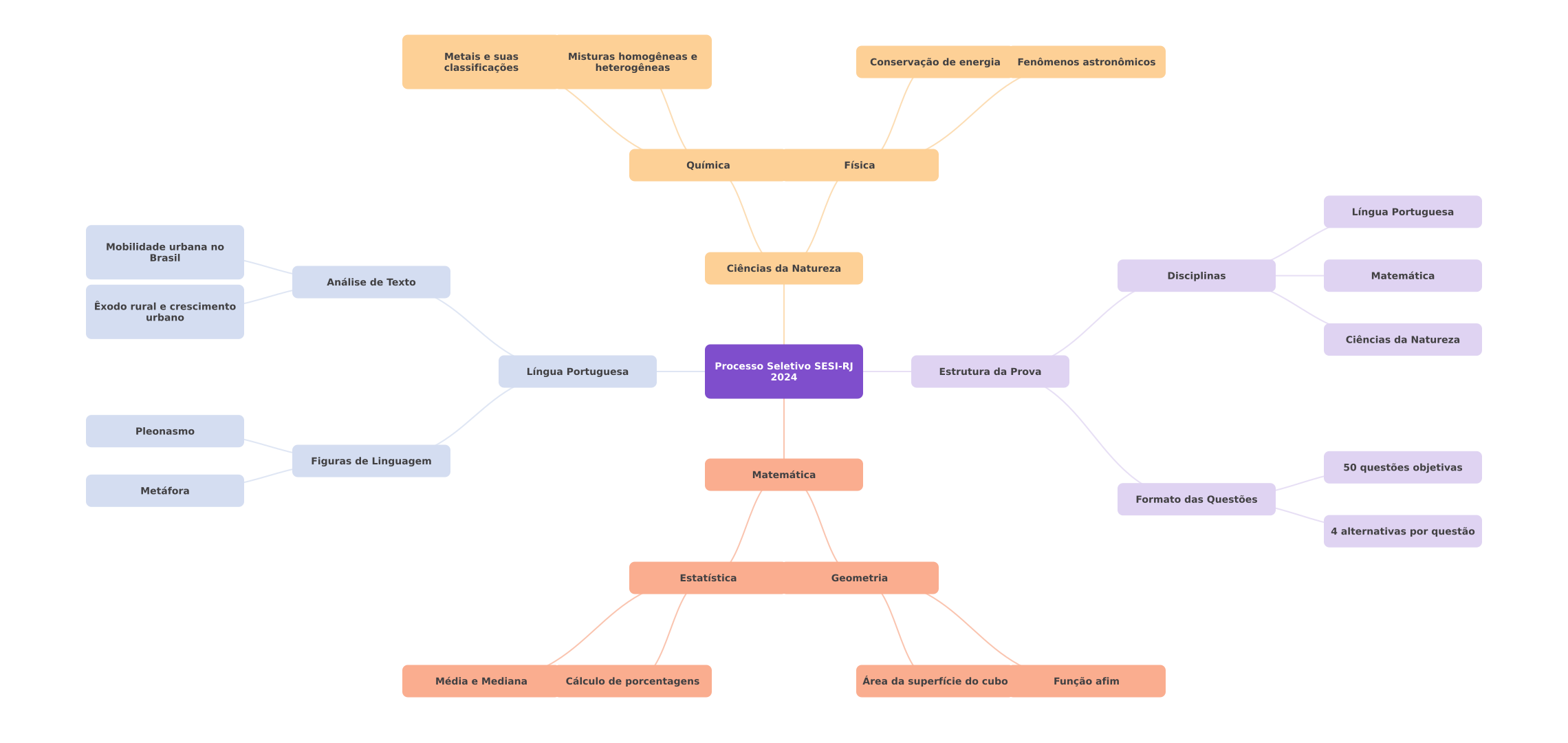 Metais e suas Misturas homogêneas e classificações heterogêneas Conservação de energia Fenômenos astronômicos Química Física Língua Portuguesa Mobilidade urbana no Brasil Ciências da Natureza Disciplinas Matemática Análise de Texto rural e crescimento urbano Ciências da Natureza Língua Portuguesa Processo Seletivo SESI-RJ Estrutura da Prova 2024 Pleonasmo Figuras de Linguagem 50 questões objetivas Matemática Metáfora Formato das Questões 4 alternativas por questão Estatística Geometria Média e Mediana Cálculo de porcentagens Área da superfície do cubo Função afim