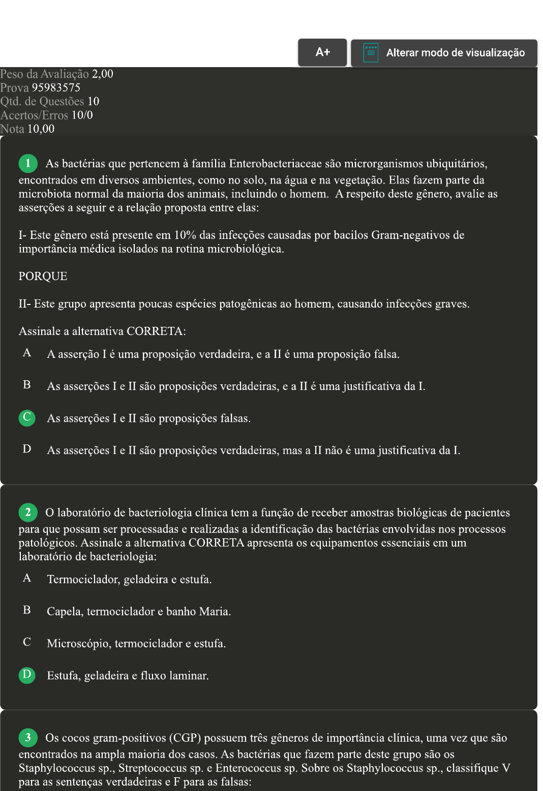 A+ Alterar modo de visualização Peso da Avaliação 2,00 Prova 95983575 Qtd. de Questões 10 Acertos/Erros 10/0 Nota 10,00 1 As bactérias que pertencem à família Enterobacteriaceae são microrganismos ubiquitários, encontrados em diversos ambientes, como no solo, na água e na vegetação. Elas fazem parte da microbiota normal da maioria dos animais, incluindo o homem. A respeito deste gênero, avalie as asserções a seguir e a relação proposta entre elas: I- Este gênero está presente em 10% das infecções causadas por bacilos Gram-negativos de importância médica isolados na rotina microbiológica. PORQUE II- Este grupo apresenta poucas espécies patogênicas ao homem, causando infecções graves. Assinale a alternativa CORRETA: A A asserção I é uma proposição verdadeira, e a II é uma proposição falsa. As asserções I e II são proposições verdadeiras, e a II é uma justificativa da I. As asserções I e II são proposições falsas. D As asserções I e II são proposições verdadeiras, mas a II não é uma justificativa da I. 2 laboratório de bacteriologia clínica tem a função de receber amostras biológicas de pacientes para que possam ser processadas e realizadas a identificação das bactérias envolvidas nos processos patológicos. Assinale a alternativa CORRETA apresenta os equipamentos essenciais em um laboratório de bacteriologia: A Termociclador, geladeira e estufa. B Capela, termociclador e banho Maria. Microscópio, termociclador e estufa. D Estufa, geladeira e fluxo laminar. 3 Os cocos gram-positivos (CGP) possuem três gêneros de importância clínica, uma vez que são encontrados na ampla maioria dos casos. As bactérias que fazem parte deste grupo são os Staphylococcus sp., Streptococcus sp. e Enterococcus sp. Sobre os Staphylococcus sp., classifique V para as sentenças verdadeiras e F para as falsas:( ) Staphylococcus aureus é um agente de variado poder patogênico, que pode causar desde simples infecções até infecções mais graves. ( ) Não possui uma elevada importância na saúde pública, principalmente por ser o responsável por inúmeras infecções relacionadas à Assistência à Saúde. Houve um significativo aumento na prevalência de cepas multirresistentes a alguns antibióticos, como os Staphylococcus aureus Meticilina-Resistentes (MRSA). Assinale a alternativa que apresenta a sequência CORRETA: A B D V-V-V. 4 Para o diagnóstico adequado, é necessário realizar a técnica de cultura, pois o isolamento é primordial no conhecimento da espécie envolvida. Sobre a cultura dos cocos Gram-positivos, classifique V para as sentenças verdadeiras e F para as falsas: Os isolamentos dos cocos Gram-positivos apresentam muitas dificuldades, pois crescem apenas em ágar seletivo. A principal prova para diferenciar os cocos Gram-positivos é a prova da coagulase. Enterococcus faecalis apresentam-se com beta-hemólise em ágar contendo sangue humano, coelho ou cavalo, mas são não hemolíticas em sangue de carneiro. Assinale a alternativa que apresenta a sequência CORRETA: A B D 5 Entre os Streptococcus spp., as espécies que mais chamam atenção na rotina clínica são o Streptococcus pyogenes, o Streptococcus agalactiae e o Streptococcus pneumoniae. Considerando o S. pyogenes, classifique V para as sentenças verdadeiras e F para as falsas: ( ) As doenças causadas pelo S. pyogenes são subdivididas em supurativas e não supurativas. As doenças supurativas variam de faringite a infecções localizadas na pele e de tecidos moles, até fasciíte necrosante. As doenças não supurativas são complicações autoimunes que ocorrem após a faringite estreptocócica. Assinale a alternativa que apresenta a sequência CORRETA: AB V-V-V. D 6 [Laboratório Virtual Preparação de Esfregaço e Coloração de Gram] Em microbiologia e bacteriologia, a coloração de Gram, é um método de coloração usado para classificar espécies bacterianas em dois grupos distintos. nome vem do bacteriologista dinamarquês Hans Christian Gram, que desenvolveu a técnica em 1884. Com relação às observações feitas no experimento de preparação de esfregaço e coloração de Gram, assinale a alternativa CORRETA: A objetivo principal do emprego da coloração de Gram é classificar as bactérias analisadas em patogênicas ou probióticas. Por se tratarem de estruturas de tamanho relativamente grande, a objetiva correta no microscópio para análise das bactérias após a coloração de Gram é a de 4x. A solução alcoólica utilizada na coloração de Gram deve permanecer em contato com a lâmina o mesmo tempo que a solução de Lugol. D Dentre os materiais utilizados na metodologia da coloração de Gram, a solução de cristal violeta é a primeira a ser empregada no procedimento. 7 Staphylococcus aureus é a mais perigosa de todas as bactérias estafilocócicas mais comuns. Essas bactérias Gram-positivas apresentam-se em forma de esferas de cocos. Sobre esta espécie, avalie as asserções a seguir e a relação proposta entre elas: I- Capacidade para crescer em condições aeróbias e anaeróbias, em um amplo intervalo de temperaturas e na presença de altas concentrações de sal. PORQUE II- Esta última característica é importante porque essas bactérias frequentemente causam intoxicação alimentar. Assinale a alternativa CORRETA: A As asserções I e II são proposições verdadeiras, e a II é uma justificativa da I. B As asserções I e II são proposições falsas.A asserção I é uma proposição verdadeira, e a II é uma proposição falsa. D As asserções I e II são proposições verdadeiras, mas a II não é uma justificativa da I. 8 [Laboratório Virtual Antibiograma] antibiograma é um teste in vitro da sensibilidade de uma bactéria a um ou mais antibióticos pela técnica de difusão em meio de ágar. Seu objetivo é orientar o clínico na escolha de um antibiótico para tratar uma infecção bacteriana e usar os dados para m