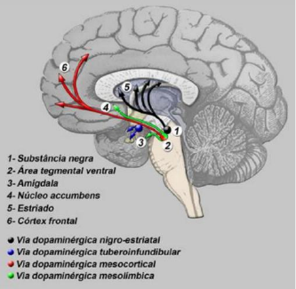 VIAS DOPAMINÉRGICAS DO CÉREBRO Nigroestriatal: Considerada a mais relevante na DP (ademais a mais afetada), esta via conecta a substância nigra ao estriado e participa do controle dos movimentos voluntários. Em virtude da degeneração progressiva dos neurônios, ocorre a redução da dopamina no estriado e como consequência há desequilíbrio entre atividade inibitória (dopamina) e excitatória (acetilcolina e glutamato). Mesolímbica: Tem sua origem na área tegmental ventral (ATV) com destino ao núcleo accubens, amígdala e hipocampo. Está relacionada às emoções, à motivação e ao sistema de recompensa. Alterações nesta via estão associadas a sintomas psicóticos, como delírios e alucinações. Na prática clínica, isso explica por que fármacos dopaminérgicos usados no tratamento da doença de Parkinson, como levodopa e agonistas dopaminérgicos, podem induzir efeitos adversos psiquiátricos. Mesocortical: Tem origem na área tegmental ventral (ATV) com destino ao córtex pré-frontal. Esta via tem papel importante nas funções cognitivas superiores, incluindo atenção, planejamento e memória de trabalho. Sua hipoatividade está associada a déficits cognitivos, apatia e alterações comportamentais. Na DP em estágios mais avançados a degeneração dessa via contribui para o desenvolvimento de demência. Tuberoinfundibular: Tendo origem no hipotálamo com destino a eminência mediana (hipófise anterior), nessa via a dopamina atua inibindo a secreção de prolactina. Quando ocorre o bloqueio dessa via, como ocorre durante o uso de antipsicóticos antagonistas dopaminérgicos, observa-se hiperprolactinemia podendo levar a efeitos como galactorrei, ginecomastia e infertilidade. Já os fármacos usados na DP exercem efeito oposto, reduzindo a secreção de prolactina. Doença de Parkinson Doença neurodegenerativa crônica e progressiva de alta relevância clínica, social e econômica associada a achados neuropatológicos, caracterizada pela degeneração seletiva dos neurônios dopaminérgicos da substância nigra no cérebro. A degeneração/perda desses neurônios leva à redução da dopamina no corpo estriado, estrutura fundamental para o controle dos movimentos voluntários. A DP acomete mais comumente os idosos, ademais o tratamento apresenta custo elevado. FISIOPATOLOGIA: A dopamina atua como neurotransmissor inibitório no sistema extrapiramidal equilibrando a ação da acetilcolina (excitadora). Quando há a degeneração dos neurônios dopaminérgicos, ocorre desequilíbrio entre dopamina e acetilcolina (isso resulta nos sintomas motores clássicos). O processo está associado à presença de corpos de Lewy (acúmulo anormal de alfa-sinucleína) dentro dos neurônios. MANIFESTAÇÕES CLÍNICAS: A DP é relativamente assintomática até a ocorrência de uma depleção profunda dos neurônios. Ademais, os sintomas iniciais podem ser sensoriais e com a progressão da doença aparecem uma ou mais das características principais da doença – tremor em repouso (comumente mais observado nas mãos e costuma ser unilateral no início – ausente durante o sono), rigidez (resistência ao movimento passivo), bradicinesia (lentidão na iniciação e execução dos movimentos voluntários) e instabilidade postural (alteração no equilíbrio). Outros sintomas, entretanto, não motores são: Alterações de olfato, hipotensão postural, distúrbios do sono, constipação, depressão, ansiedade, sintomas psicóticos, prejuízos cognitivos e demência. DIAGNÓSTICO: Para o diagnóstico clínico da Doença de Parkinson, é obrigatório o paciente apresentar: • Bradicinesia (lentidão dos movimentos) → sintoma central; • Rigidez muscular; • Tremor de repouso (4–6 Hz) – Hz - hertz é a unidade de frequência (nº de ciclos por segundo). OBS: Esses são os sinais cardinais da doença, usados como ponto de partida para diferenciar a DP de outros tipos de parkinsonismo. CRITÉRIOS NEGATIVOS (sugestivos de outras causas de parkinsonismo): Se presentes, esses critérios afastam o diagnóstico de DP idiopática, ajudando a descartar parkinsonismo secundário (medicamentoso, vascular, pós encefalítico, tumoral) e parkinsonismo atípico. • História de AVCs repetidos, trauma craniano grave ou encefalite; • Crises oculógiras (desvios involuntários dos olhos); • Uso prévio de neurolépticos (antipsicóticos que bloqueiam dopamina e podem causar parkinsonismo medicamentoso); • Remissão espontânea dos sintomas (não ocorre na DP verdadeira, que é progressiva); • Quadro unilateral persistente após 3 anos (na DP geralmente começa unilateral, mas evolui para bilateralidade); • Paralisia supranuclear do olhar, sinais cerebelares ou autonômicos precoces, demência precoce; • Alterações neurológicas incompatíveis, como sinal de Babinski, tumor cerebral ou hidrocefalia; • Resposta negativa à levodopa em doses adequadas (na DP típica há melhora); • Exposição a tóxicos como MPTP (substância que destrói neurônios dopaminérgicos). CRITÉRIOS DE SUPORTE POSITIVO para o diagnóstico de DP: Três ou mais desses critérios confirmam e reforçam o diagnóstico • Início unilateral dos sintomas; • Presença de tremor de repouso; • Doença de curso progressivo; • Assimetria persistente dos sintomas (mais acentuada em um lado); • Boa resposta à levodopa; • Desenvolvimento de discinesias induzidas por levodopa (movimentos involuntários, sinal indireto de que há dopamina atuando); • Resposta sustentada à levodopa por 5 anos ou mais; • Evolução clínica de 10 anos ou mais. OBS: Esses critérios confirmam que se trata de DP idiopática, distinguindo-a de outras doenças neurodegenerativas que cursam com parkinsonismo mas não respondem bem à levodopa. TRATAMENTO - Objetivos do tratamento: reduzir ao mínimo os sintomas, a incapacidade e os efeitos colaterais, mantendo, ao mesmo tempo, a qualidade de vida do paciente. A educa
