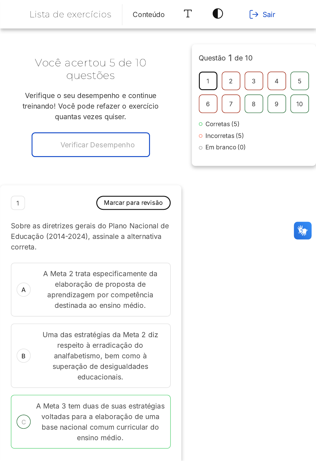 Você acertou 5 de 10 questões Verifique o seu desempenho e continue treinando! Você pode refazer o exercício quantas vezes quiser. Verificar Desempenho A B C 1 Marcar para revisão Sobre as diretrizes gerais do Plano Nacional de Educação �2014�2024�, assinale a alternativa correta. A Meta 2 trata especificamente da elaboração de proposta de aprendizagem por competência destinada ao ensino médio. Uma das estratégias da Meta 2 diz respeito à erradicação do analfabetismo, bem como à superação de desigualdades educacionais. A Meta 3 tem duas de suas estratégias voltadas para a elaboração de uma base nacional comum curricular do ensino médio. Questão 1 de 10 Corretas �5� Incorretas �5� Em branco �0� 1 2 3 4 5 6 7 8 9 10 Lista de exercícios Conteúdo Sair D E A valorização dos profissionais da educação não faz parte das diretrizes do PNE. A qualidade da educação básica é amplamente abordada nas estratégias da Meta 2, bem como a criação de um currículo único em âmbito nacional. Resposta correta Parabéns, você selecionou a alternativa correta. Confira o gabarito comentado! Gabarito Comentado As Metas 2 e 3 do Plano Nacional de Educação �PNE) são voltadas para a elaboração de uma base nacional comum curricular. No entanto, a Meta 2 é direcionada para o ensino fundamental, enquanto a Meta 3 é voltada para o ensino médio. Além disso, a erradicação do analfabetismo e a superação de desigualdades educacionais são duas das dez diretrizes do PNE, que também inclui a valorização dos profissionais da educação. Portanto, a alternativa correta é a C, que afirma que a Meta 3 tem duas de suas estratégias voltadas para a elaboração de uma base nacional comum curricular do ensino médio. 2 Marcar para revisão A B C De acordo com a Base Nacional Comum Curricular �BNCC�, homologada em dezembro de 2017 pelo Ministério da Educação, assinale a alternativa incorreta. A contribuição mais significativa da BNCC é substituir os currículos das disciplinas escolares das redes públicas federal, estaduais e municipais, uma vez que determina o que deve ser ensinado em cada escola. A BNCC determina os conhecimentos e as competências que os estudantes devem desenvolver ao longo da escolaridade, orientada por princípios éticos, políticos e estéticos. Fruto de amplo debate com diferentes atores do campo educacional e com a sociedade brasileira, a BNCC tem a finalidade de contribuir para a construção de uma sociedade justa, democrática e inclusiva. D E A BNCC é um documento de referência, mas de caráter normativo, que define o conjunto de aprendizagens essenciais que todos os alunos brasileiros devem desenvolver ao longo das etapas e modalidades da educação básica. Uma das finalidades da BNCC é contribuir para a superação da fragmentação das políticas educacionais e para o fortalecimento do regime de colaboração entre as três esferas de governo. Resposta incorreta Opa! A alternativa correta é a letra A. Confira o gabarito comentado! Gabarito Comentado A alternativa A está incorreta porque a Base Nacional Comum Curricular �BNCC) não substitui os currículos das disciplinas escolares das redes públicas federal, estaduais e municipais. A BNCC é um documento normativo que estabelece as diretrizes para o que deve ser ensinado em cada etapa da educação básica. No entanto, a elaboração do currículo das disciplinas, que deve estar alinhado com as diretrizes da BNCC, é responsabilidade dos sistemas e das escolas. Portanto, a BNCC não determina o que deve ser ensinado em cada escola, mas sim fornece um referencial comum para a elaboração dos currículos. A B C 3 Marcar para revisão Analise as afirmações a seguir: I. Em relação ao ensino ministrado em todas as escolas do país, pluralismo de ideias, gestão democrática, valorização da experiência extraescolar, consideração da diversidade étnico-racial, vinculação educação-trabalho- práticas sociais são princípios previstos da LDB 9394/1996. II. Segundo a Constituição Federal de 1988, o Plano Nacional de Educação tem o objetivo de articular o sistema nacional de educação em regime de colaboração e definir diretrizes, objetivos, metas e estratégias de implementação para assegurar a manutenção e desenvolvimento do ensino em seus diversos níveis, etapas e modalidades por meio de ações integradas dos poderes públicos. III. A determinação de um currículo nacional único se dá pelo fato de os professores sentirem necessidade de ter uma base comum curricular para preparar suas aulas. IV. A formação para o trabalho e para a cidadania e a promoção humanística, científica, cultural e tecnológica do país são diretrizes previstas no Plano Nacional de Educação. Está correto o que se afirma em: I e II. III e IV. II e IV. D E I, II e IV. I, II e III. Resposta incorreta Opa! A alternativa correta é a letra D. Confira o gabarito comentado! Gabarito Comentado Na Lei de Diretrizes da Educação Nacional, os princípios que regem os processos educacionais dizem respeito à igualdade, à liberdade, ao pluralismo de ideias, à gratuidade, à valorização profissional, à gestão democrática, à qualidade de ensino, à valorização dos saberes práticos. A determinação de um currículo nacional único não se dá por uma demanda dos professores, pois não há a necessidade de diretrizes rígidas para a preparação das aulas; mas sim para que se tenha diretrizes nacionais e para que os sistemas e escolas possam elaborar seus currículos de forma democrática. 4 Marcar para revisão Sobre o entendimento da BNCC como política pública, avalie as afirmativas e sua relação. I. O papel primordial da BNCC é estabelecer um modelo de educação em tempo integral como algo fundamental, para que as novas gerações possam viver de acordo com as demandas do século XXI, gerando um afastamento das comunidades e seu A B C D E direci