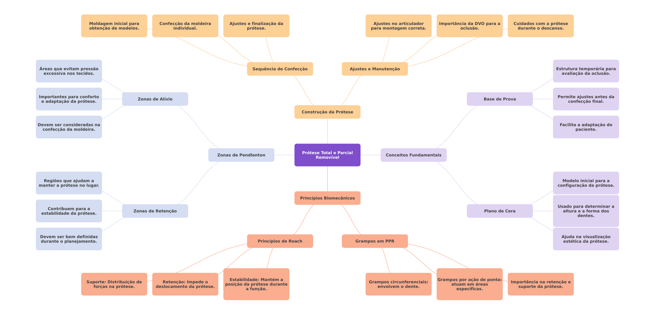 Moldagem inicial para Confecção da moldeira Ajustes e finalização da Ajustes no articulador Importância da DVO para a Cuidados com a prótese obtenção de modelos. individual. prótese. para montagem correta. oclusão. durante descanso. Áreas que evitam pressão Sequência de Confecção Ajustes e Manutenção Estrutura temporária para excessiva nos tecidos. avaliação da oclusão. Importantes para conforto Zonas de Alívio Base de Prova Permite ajustes antes da e adaptação da prótese. confecção final. Construção da Prótese Devem ser consideradas na Facilita a adaptação do confecção da moldeira. paciente. Prótese Total e Parcial Zonas de Pendlenton Conceitos Fundamentais Removível Regiões que ajudam a Modelo inicial para a manter a prótese no lugar. configuração da prótese. Princípios Biomecânicos Contribuem para a Usado para determinar a Zonas de Retenção Plano de Cera altura e a forma dos estabilidade da prótese. dentes. Devem ser bem definidas Ajuda na visualização durante planejamento. Princípios de Roach Grampos em PPR estética da prótese. Estabilidade: Mantém a Suporte: Distribuição de Retenção: Impede posição da prótese durante Grampos circunferenciais: Grampos por ação de ponta: atuam em áreas Importância na retenção e forças na prótese. deslocamento da prótese. envolvem dente. a função. específicas. suporte da prótese.