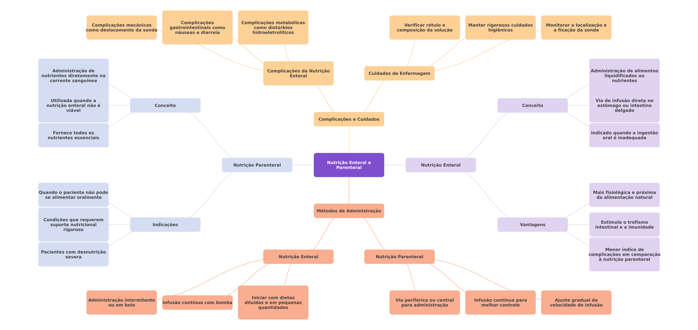 Complicações mecânicas Complicações Complicações metabólicas Verificar rótulo e Manter rigorosos cuidados Monitorar a localização e gastrointestinais como como distúrbios como deslocamento da sonda náuseas e diarreia hidroeletrolíticos composição da solução higiênicos a fixação da sonda Administração de Complicações da Nutrição Administração de alimentos nutrientes diretamente na Enteral Cuidados de Enfermagem liquidificados ou corrente sanguínea nutrientes Utilizada quando a Via de infusão direta no nutrição enteral não é Conceito Conceito estômago ou intestino viável delgado Complicações e Cuidados Fornece todos os Indicado quando a ingestão nutrientes essenciais oral é inadequada Nutrição Parenteral Nutrição Enteral e Parenteral Nutrição Enteral Quando paciente não pode Mais fisiológica e próxima se alimentar oralmente da alimentação natural Métodos de Administração Condições que requerem Estimula trofismo suporte nutricional Indicações Vantagens intestinal e a imunidade rigoroso Menor índice de Pacientes com desnutrição severa Nutrição Enteral Nutrição Parenteral complicações em comparação à nutrição parenteral Iniciar com dietas Administração intermitente Infusão contínua com bomba diluídas e em pequenas Via periférica ou central Infusão contínua para Ajuste gradual da ou em bolo para administração melhor controle velocidade de infusão quantidades