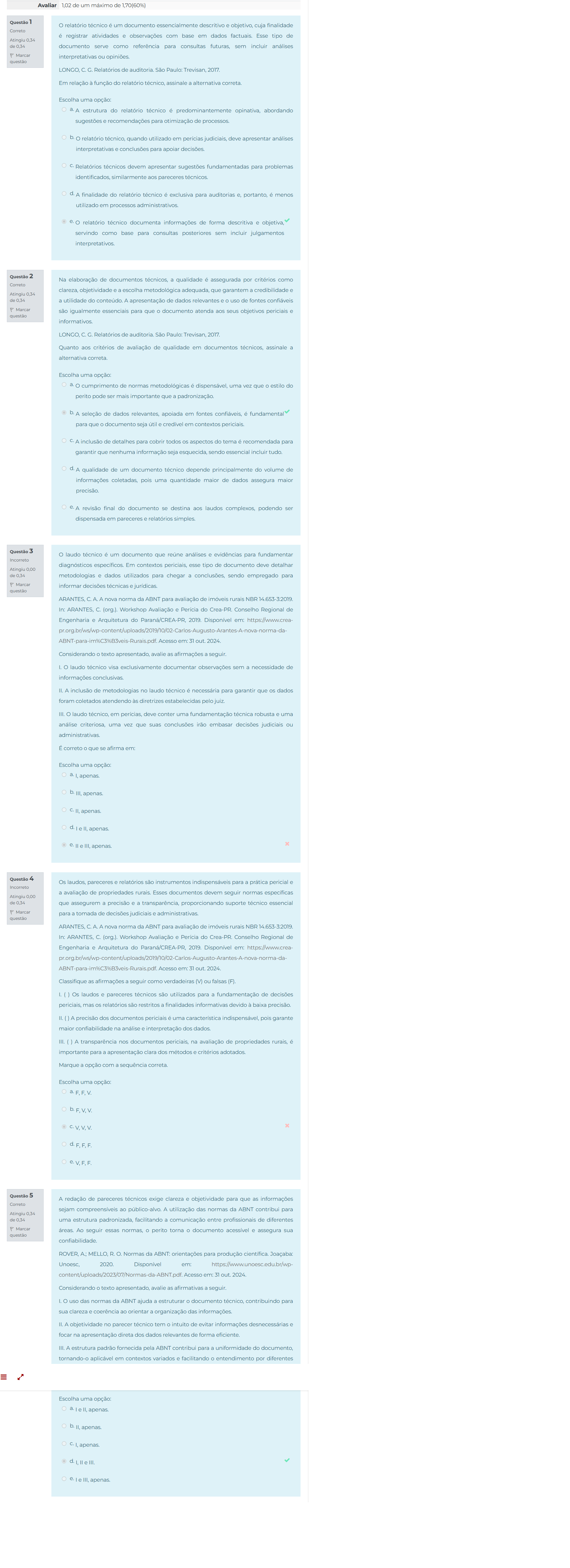 Avaliar 1,02 Questão relatório técnico um documento essencialmente descritivo objetivo, cuja finalidade Correto é registrar atividades e observações com base em dados Esse tipo de documento serve como referência para consultas futuras, sem incluir análises Marcar interpretativas questão Relatórios de São Paulo: Trevisan Em relação função técnico, assinale correta Escolha a A estrutura do relatório técnico é predominantemente opinativa, abordando sugestões para otimização relatório técnico, quando utilizado em judiciais, deve análises interpretativa conclusões para apoiar Relatórios técnicos devem apresentar sugestões fundamentadas para problemas identificados similarmente aos pareceres técnicos d. finalidade do relatório técnico exclusiva para auditorias e. portanto, menos ut administrativos relatório técnico documenta informações de forma descritiva servindo como base para consultas posteriores sem incluir julgamentos interpretativos Questão Na elaboração de documentos técnicos, a qualidade assegurada por critérios como Correto clareza objetividade escolha metodológica adequada, que garantem credibilidade e Atingiu 0,34 de 0,34 utilidade do A apresentação de dados relevantes uso de fontes confiáveis Marcar são igualmente essenciais para que documento atenda aos seus objetivos periciais e questão informativos LONGO Relatórios de auditoria São Paulo: Quanto aos critérios de avaliação de qualidade em documentos técnicos, assinale a alternativa correta Escolha uma a cumprimento de normas metodológicas dispensável, uma vez que o estilo do perito pode ser mais importante que padronização seleção de dados apoiada em fontes fundamenta para que documento seja credivel em contextos inclusão de detalhes para cobrir todos aspectos do tema recomendada para garantir que informação seja sendo essencial incluir d. qualidade de um documento técnico depende principalmente do volume de informações pois uma quantidade maior de dados assegura maior e revisão final do documento se destina aos laudos podendo ser dispensada em pareceres relatórios simples laudo técnico um documento que análises evidências para fundamentar diagnósticos Em contextos periciais, esse tipo de documento deve detalhar Atingiu 0,00 metodologias dados utilizados para chegar conclusões, sendo empregado para Marcar informar decisões técnicas jurídicas questão ARANTES nova norma da ABNT para avaliação de imóveis rurais NBR 14.653 3:2019 ARANTES C. (org.). Workshop Avaliação do Crea Conselho Regional de Engenharia Arquitetura do 2019 Disponível em: https://www.crea Carlos Augusto Arantes nova ABNT out 2024 Considerando texto apresentado, avalie afirmações laudo técnico visa exclusivamente documentar observações sem necessidade de informações conclusivas inclusão de metodologias no laudo técnico necessária para garantir que os dados ram coletados atendendo diretrizes estabelecidas pelo laudo em pericias, deve conter uma fundamentação técnica robusta uma análise uma vez que suas conclusões irão embasar decisões judiciais ou correto que Escolha opção apenas apenas apenas apenas apenas Questão Os pareceres relatórios são instrumentos indispensáveis para prática pericial Incorreto a avaliação de propriedades rurais. Esses documentos devem seguir normas especificas Atingiu 0,00 de 0,34 que assegurem precisão proporcionando suporte técnico essencial para tomada de decisões judiciais administrativas questão nova norma da ABNT para avaliação rurais NBR 3:2019 In C. (org.). Workshop Avaliação Pericia do Crea Conselho Regional de Engenharia Arquitetura do em: https://www.crea -Carlos Augusto Arantes nova norma ABNT para Acesso 31 out Classifique as afirmações seguir como verdadeiras ou falsas Os laudos pareceres técnicos são utilizados para a fundamentação de decisões periciais, mas os relatórios são restritos finalidades informativas devido baixa precisão. precisão dos documentos periciais uma caracteristica indispensável, pois garante maior confiabi idade na análise interpretação dos dados III. transparência nos documentos periciais, na avaliação de propriedades importante para clara dos métodos critérios adotados opção com Escolha uma V.F.F. A redação de pareceres técnicos exige clareza objetividade para que as informações Correto sejam compreensiveis ao A utilização das normas da ABNT contribui para uma estrutura padronizada, facilitando a comunicação entre profissionais de diferentes Ao seguir essas perito torna documento acessivel assegura sua confiabi idade. ROVER Normas da orientações para produção Joaçaba Unoesc 2020. Disponivel em: https://www.unoesc.edu.br/wp ABNT pdf. Acesso 2024 Considerando texto avalie as afirmativas uso das normas da ABNT ajuda estruturar documento técnico, contribuindo para sua clareza coerência ao orientar rganização das objetividade no parecer técnico tem intuito de evitar informações desnecessárias na apresentação direta dos dados relevantes de forma eficiente estrutura padrão fornecida pela ABNT contribui para uniformidade do documento, aplicável em contextos variados facilitando entendimento por diferentes Escolha uma apenas apenas apenas apenas