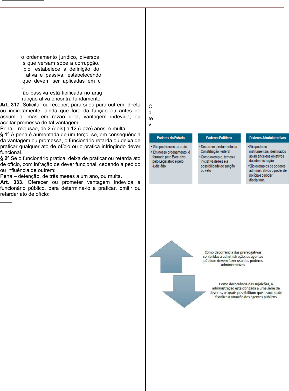 PROF. GABRIEL BRAGA TJ/PA – ÉTICA NO SERVIÇO PÚBICO LEI ANTICORRUPÇÃO LEI Nº 12.846/2013 – LEI ANTICORRUPÇÃO CONCEITO E ELEMENTOS DA CORRUPÇÃO O termo corrupção deriva do latim corruptio, que significa estragar, destruir ou corromper. Em qualquer um dos sentidos apresentados, a corrupção está ligada à alteração e à ilicitude da conduta. Em nosso ordenamento jurídico, diversos são os diplomas normativos que versam sobe a corrupção. O Código Penal, por exemplo, estabelece a definição do que vem a ser corrupção ativa e passiva, estabelecendo ainda quais as sanções que devem ser aplicadas em cada uma destas situações. A corrupção passiva está tipificada no artigo 317, ao passo que a corrupção ativa encontra fundamento no artigo 333: Art. 317. Solicitar ou receber, para si ou para outrem, direta ou indiretamente, ainda que fora da função ou antes de assumi-la, mas em razão dela, vantagem indevida, ou aceitar promessa de tal vantagem: Pena – reclusão, de 2 (dois) a 12 (doze) anos, e multa. § 1º A pena é aumentada de um terço, se, em consequência da vantagem ou promessa, o funcionário retarda ou deixa de praticar qualquer ato de ofício ou o pratica infringindo dever funcional. § 2º Se o funcionário pratica, deixa de praticar ou retarda ato de ofício, com infração de dever funcional, cedendo a pedido ou influência de outrem: Pena – detenção, de três meses a um ano, ou multa. Art. 333. Oferecer ou prometer vantagem indevida a funcionário público, para determiná-lo a praticar, omitir ou retardar ato de ofício: Pena – reclusão, de 2 (dois) a 12 (doze) anos, e multa. Parágrafo único. A pena é aumentada de um terço, se, em razão da vantagem ou promessa, o funcionário retarda ou omite ato de ofício, ou o pratica infringindo dever funcional. Analisando ambos os artigos, observa-se que na corrupção ativa o corruptor (aquele que pratica o ato) oferece ao servidor público alguma espécie de vantagem como condição para a prática ou omissão de determinado ato. Na corrupção passiva, em sentido oposto, é o servidor público quem solicita a vantagem indevida, ainda que destinada a terceiros. No Dicionário de Política, de Bobbio, Mateucci e Pasquino, temos uma definição mais ampla acerca da corrupção. A corrupção é uma forma particular de exercer influência: influência ilícita, ilegal e ilegítima (...). É uma alternativa da coerção, posta em prática quando as duas partes são bastante poderosas para tornar a coerção muito custosa, ou são incapazes de a usar. Com base em ambas as definições, é possível inferir que a corrupção, quando presente no setor público, implica em uma conduta do agente estatal que viola um ou mais dos deveres relacionados com os poderes administrativos. Deveres e Poderes Administrativos? O que vem a ser isso? Para que o Poder Público possa alcançar a sua finalidade, que é a de garantir a integridade da coletividade, faz-se necessário a existência de prerrogativas e sujeições aos agentes públicos, uma vez que são estes quem desempenham as atividades em nome do Estado. No âmbito das prerrogativas, o regime jurídico confere aos agentes certos poderes que não estão presentes na relação entre particulares, mas sim apenas no âmbito da relação do Poder Público com os administrados. Tais poderes são instrumentos de que se vale o agente estatal para conseguir fazer valer a vontade do Estado. Como operam no âmbito da atividade administrativa, são conhecidos como poderes administrativos. Não se confundem os poderes administrativos com os Poderes do Estado. Enquanto estes são os alicerces da organização estatal, formados pelo Executivo, pelo Legislativo e pelo Judiciário, os poderes administrativos são meios de alcance da vontade da administração pública. Também não podemos confundir os poderes administrativos com os poderes políticos, uma vez que estes são os utilizados com base nas diretrizes expressas na Constituição Federal e exercidos com alto grau de discricionariedade. Como exemplo de poderes políticos, temos o poder para propor a iniciativa de uma lei e para vetar ou sancionar uma lei anteriormente aprovada. No âmbito das sujeições, o administrador público possui uma série de obrigações com a sociedade. Assim, ainda que vários sejam os poderes conferidos aos agentes públicos, os deveres surgem à tona como uma possibilidade de controle, por parte da sociedade, acerca do regular uso dos poderes outrora conferidos. E como forma de propiciar que a sociedade controle se os agentes públicos estão fazendo uso, de forma adequada, dos poderes a eles conferidos, é que surgem os deveres administrativos. A doutrina, baseada nos ensinamento de Hely Lopes Meirelles, estabelece quatro poderes-deveres para o administrador público: poder dever de agir, dever de prestar contas, dever de probidade e dever de eficiência. Mobile User PROF. GABRIEL BRAGA TJ/PA – ÉTICA NO SERVIÇO PÚBICO LEI ANTICORRUPÇÃO Agora, precisamos saber que a corrupção está intimamente ligada ao abuso de poder, ou seja, ao fato do poder conferido ao agente estatal não ser exercido dentro da esfera de legalidade. Nos Estados de Direito, como o nosso, a Administração Pública deve obedecer a lei em todas as suas manifestações. Mesmo nas atividades discricionárias, o uso do poder pelo administrador se sujeita aos limites legais, não podendo esses limites ser extrapolados, sob pena de se praticar arbitrariedade. O abuso de poder, dessa forma, é gênero, e se divide em duas espécies: excesso de poder e desvio de poder. Poder No excesso de poder, estamos diante de uma atuação do agente público em que o requisito competência é o que está sendo violado. Tal forma de vício pode ocorrer de duas formas: a) Quando o agente extrapola as competências que lhe foram definidas como própria. b) Quando o agente, atuando dentro de sua competência, pratica um ato co