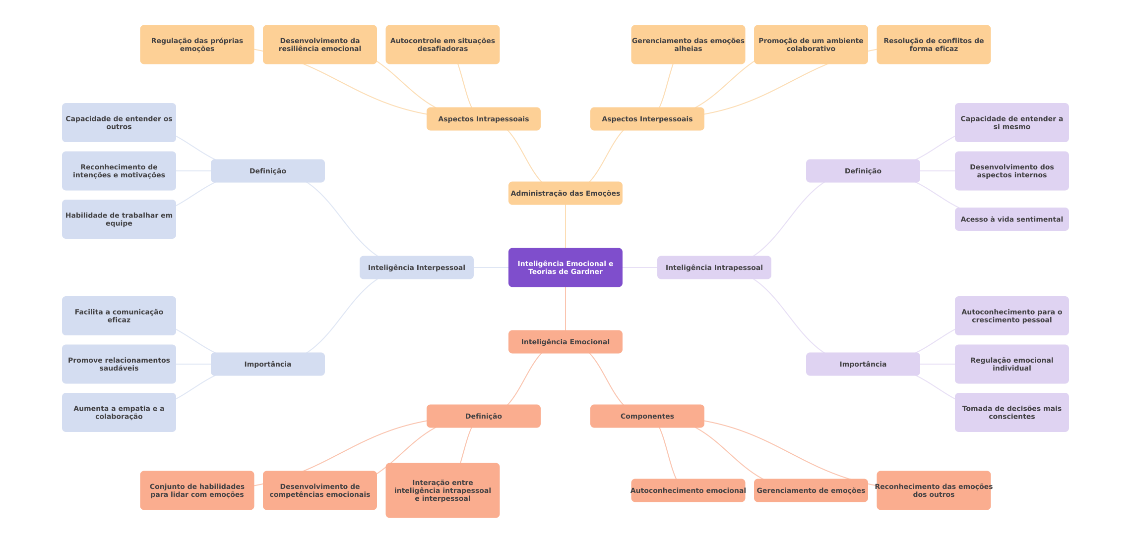 Regulação das próprias Desenvolvimento da Autocontrole em situações Gerenciamento das emoções Promoção de um ambiente Resolução de conflitos de emoções resiliência emocional desafiadoras alheias colaborativo forma eficaz Capacidade de entender os Aspectos Intrapessoais Aspectos Interpessoais Capacidade de entender a outros si mesmo Reconhecimento de Desenvolvimento dos intenções e motivações Definição Definição aspectos internos Administração das Emoções Habilidade de trabalhar em Acesso à vida sentimental equipe Inteligência Interpessoal Inteligência Emocional e Teorias de Gardner Inteligência Intrapessoal Facilita a comunicação Autoconhecimento para eficaz crescimento pessoal Inteligência Emocional Promove Importância Importância Regulação emocional saudáveis individual Aumenta a empatia ea Tomada de decisões mais colaboração Definição Componentes conscientes Conjunto de habilidades de Interação entre inteligência intrapessoal Autoconhecimento emocional Gerenciamento de emoções Reconhecimento das emoções para lidar com emoções competências emocionais dos outros e interpessoal