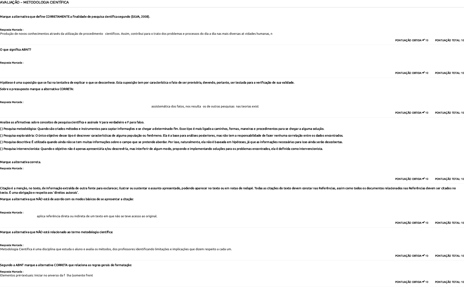AVALIAÇÃO – METODOLOGIA CIENTÍFICA PONTUAÇÃO TOTAL: 10PONTUAÇÃO OBTIDA 10 Marque a alternativa que de�ne CORRETAMENTE a �nalidade de pesquisa cientí�ca segundo (SILVA, 2008). Resposta Marcada : Produção de novos conhecimentos através da utilização de procedimentos cientí�cos. Assim, contribui para o trato dos problemas e processos do dia a dia nas mais diversas atividades humanas, no ambiente de trabalho, nas ações comunitárias, no processo de formação e outros. PONTUAÇÃO TOTAL: 10PONTUAÇÃO OBTIDA 10 O que signi�ca ABNT? Resposta Marcada : Conjunto de regras que estabelecem formatações especí�cas para trabalhos acadêmico. PONTUAÇÃO TOTAL: 10PONTUAÇÃO OBTIDA 10 Hipótese é uma suposição que se faz na tentativa de explicar o que se desconhece. Esta suposição tem por característica o fato de ser provisória, devendo, portanto, ser testada para a veri�cação de sua validade. Sobre o pressuposto marque a alternativa CORRETA: Resposta Marcada : É uma suposta resposta ao problema a ser investigado. A origem das hipóteses poderia estar na observação assistemática dos fatos, nos resultados de outras pesquisas, nas teorias existentes, ou na simples intuição (GIL, 1999). PONTUAÇÃO TOTAL: 10PONTUAÇÃO OBTIDA 10 Analise as a�rmativas sobre conceitos de pesquisa cientí�ca e assinale V para verdadeiro e F para falso. ( ) Pesquisa metodológica: Quando são criados métodos e instrumentos para captar informações e se chegar a determinado �m. Esse tipo é mais ligado a caminhos, formas, maneiras e procedimentos para se chegar a alguma solução. ( ) Pesquisa exploratória: O único objetivo desse tipo é descrever características de alguma população ou fenômeno. Ela é a base para análises posteriores, mas não tem a responsabilidade de fazer nenhuma correlação entre os dados encontrados. ( ) Pesquisa descritiva: É utilizada quando ainda não se tem muitas informações sobre o campo que se pretende abordar. Por isso, naturalmente, ela não é baseada em hipóteses, já que as informações necessárias para isso ainda serão descobertas. ( ) Pesquisa intervencionista: Quando o objetivo não é apenas apresentá-la e/ou descrevê-la, mas interferir de algum modo, propondo e implementando soluções para os problemas encontrados, ela é de�nida como intervencionista. Marque a alternativa correta. Resposta Marcada : V, F, F, V. PONTUAÇÃO TOTAL: 10PONTUAÇÃO OBTIDA 10 Citação é a menção, no texto, de informação extraída de outra fonte para esclarecer, ilustrar ou sustentar o assunto apresentado, podendo aparecer no texto ou em notas de rodapé. Todas as citações do texto devem constar nas Referências, assim como todos os documentos relacionados nas Referências devem ser citados no texto. É uma obrigação e respeito aos ‘direitos autorais’. Marque a alternativa que NÃO está de acordo com os modos básicos de se apresentar a citação: Resposta Marcada : Citação de citação: não se aplica referência direta ou indireta de um texto em que não se teve acesso ao original. PONTUAÇÃO TOTAL: 10PONTUAÇÃO OBTIDA 10 Marque a alternativa que NÃO está relacionado ao termo metodologia cientí�ca: Resposta Marcada : Metodologia Cientí�ca é uma disciplina que estuda o aluno e avalia os métodos, dos professores identi�cando limitações e implicações que dizem respeito a cada um. PONTUAÇÃO TOTAL: 10PONTUAÇÃO OBTIDA 10 Segundo a ABNT marque a alternativa CORRETA que relaciona as regras gerais de formatação: Resposta Marcada : Elementos pré-textuais: Iniciar no anverso da folha (somente frente), exceto a autorização do autor para a reprodução do trabalho e a �cha catalográ�ca que é impressa no verso da folha de rosto. 80 / 100 PONTUAÇÃO TOTAL: 10PONTUAÇÃO OBTIDA 0 São elementos para enriquecer o texto acadêmico: as citações, as notas de rodapé, as alíneas, as ilustrações, tabelas e grá�cos. Assim, as citações podem seguir os sistemas: Resposta Marcada : Direto e autor-data. PONTUAÇÃO TOTAL: 10PONTUAÇÃO OBTIDA 0 Sobre as ilustrações, marque a alternativa INCORRETA: Resposta Marcada : Após a ilustração, na parte inferior, indicar obrigatoriamente a fonte (ainda que seja produção do próprio autor), utilizando fonte tamanho 10, estilo regular e espaçamento simples. PONTUAÇÃO TOTAL: 10PONTUAÇÃO OBTIDA 10 Mesmo que cada trabalho acadêmico e/ou cientí�co tenha suas peculiaridades e seja elaborado com �nalidades especí�cas, é possível, visualizar neles um padrão que compreende, de um modo geral, introdução, desenvolvimento e conclusão. I – Trabalhos de Graduação. II – Trabalhos de curso. III – Monogra�a. IV – Dissertação. ( ) Este trabalho possibilita a investigação sobre determinados temas ou fenômenos por meio da análise, re�exão e produção textual, bem como, muitas vezes, da defesa oral da pesquisa perante uma banca examinadora. ( ) De�ne um trabalho intelectual concentrado em um único assunto. ( ) Paulatinamente está se destinando aos trabalhos de cursos de pós-graduação stricto sensu (mestrado), busca, sobretudo, a re�exão acerca de um determinado tema ou problema, o que ocorre pela exposição das ideias de maneira ordenada e fundamentada. ( ) Também têm como propósito permitir uma revisão bibliográ�ca ou literária de um determinado assunto ou assimilar conteúdo especí�cos de uma área cienti�ca. Marque a sequência CORRETA: Resposta Marcada : II,III,IV,I. Total