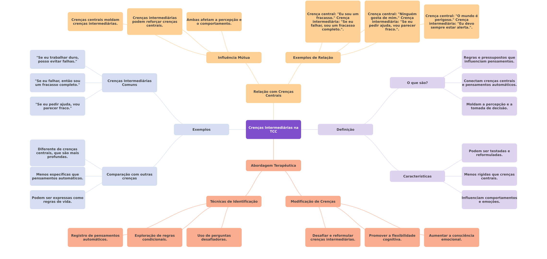 Crença central: "Eu sou um Crença central: "Ninguém Crença central: "O mundo é Crenças intermediárias fracasso." Crença Crenças centrais moldam Ambas afetam a percepção e gosta de mim." Crença podem reforçar crenças intermediária: "Se eu intermediária: "Se eu perigoso." Crença crenças intermediárias. centrais. comportamento. intermediária: "Eu devo falhar, sou um fracasso pedir ajuda, vou parecer completo.". fraco.". sempre estar alerta.". "Se eu trabalhar duro, Influência Mútua Exemplos de Relação Regras e pressupostos que posso evitar falhas." influenciam pensamentos. "Se eu falhar, então sou Crenças Intermediárias Conectam crenças centrais um fracasso completo." Comuns que são? e pensamentos automáticos. Relação com Crenças Centrais "Se eu pedir ajuda, vou Moldam a percepção ea parecer fraco." tomada de decisão. Exemplos Crenças Intermediárias na TCC Definição Diferente de crenças Podem ser testadas e centrais, que são mais reformuladas. profundas. Abordagem Terapêutica Menos específicas que Comparação com outras Características Menos rígidas que crenças pensamentos automáticos. crenças centrais. Podem ser expressas como Influenciam comportamentos regras de vida. Técnicas de Identificação Modificação de Crenças e emoções. Registro de pensamentos Exploração de regras Uso de perguntas Desafiar e reformular Promover a flexibilidade Aumentar a consciência automáticos. condicionais. desafiadoras. crenças intermediárias. cognitiva. emocional.